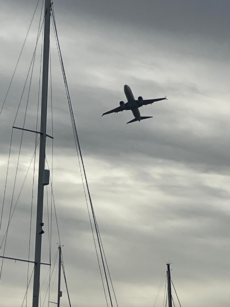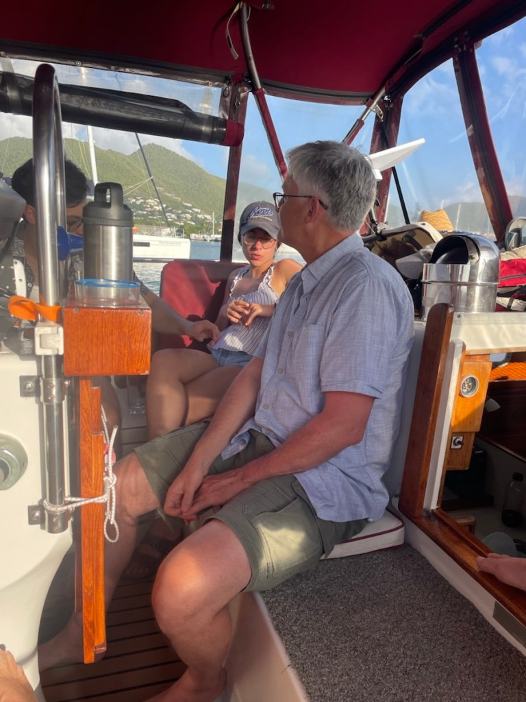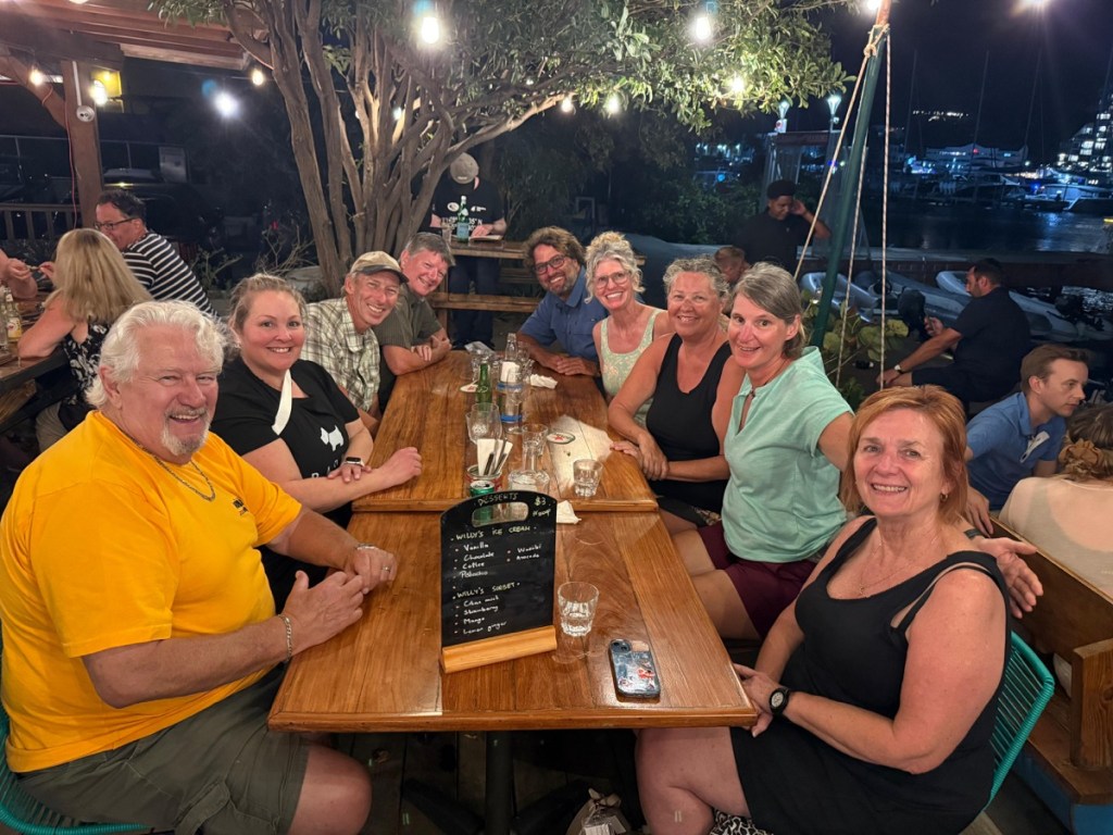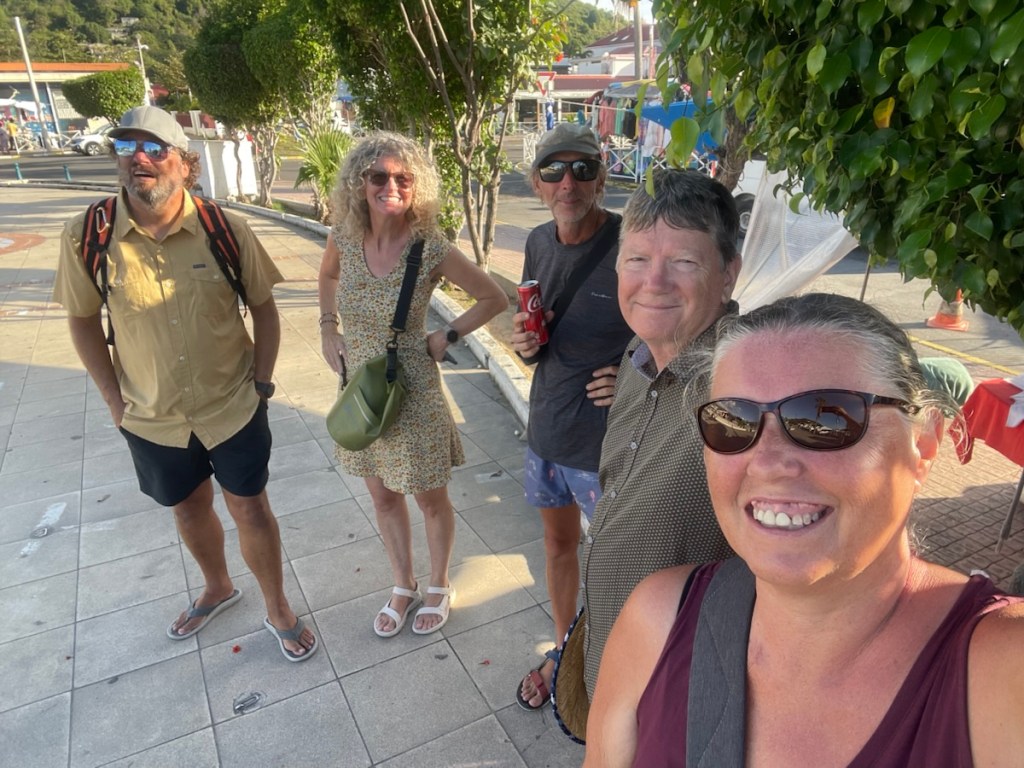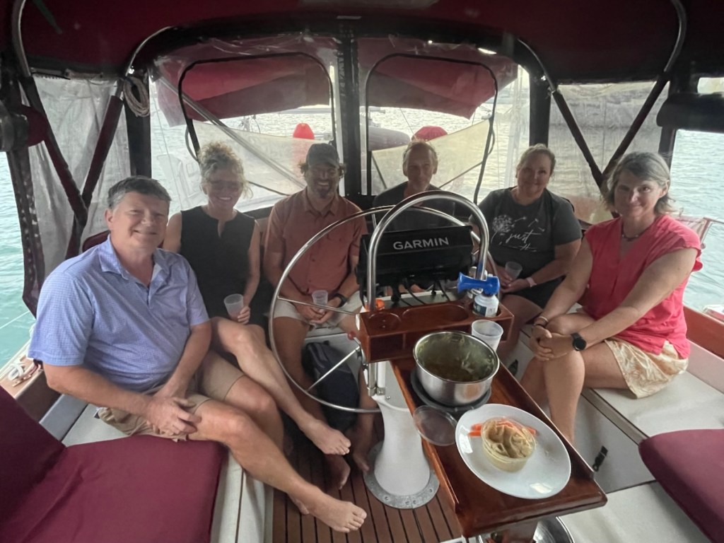 Tuesday Feb. 3 was a rainy, overcast day. John and family had a 4:30pm flight so they took their time leaving their Airbnb and had one last lunch at Grand Case. We were going to meet them at the airport to say goodbye but the weather was not our friend. Their plane flew over our boat around 4:35pm and we waved to them as they passed overhead. Later that night we had a happy hour / dinner with Sundog – John, Sharron and Sharron’s friend Katherine and Desert Loon – Greta and Brian onboard CK. We’ve never sat 7 people around our table but it was nice and cozy. We had a great night – good food and excellent conversation.