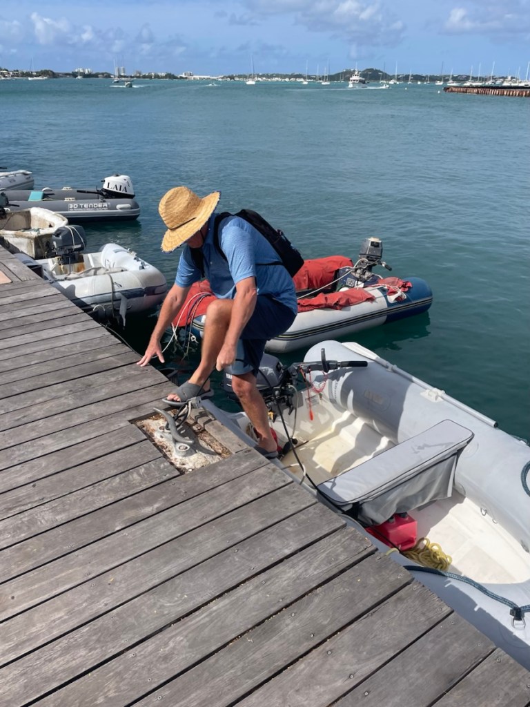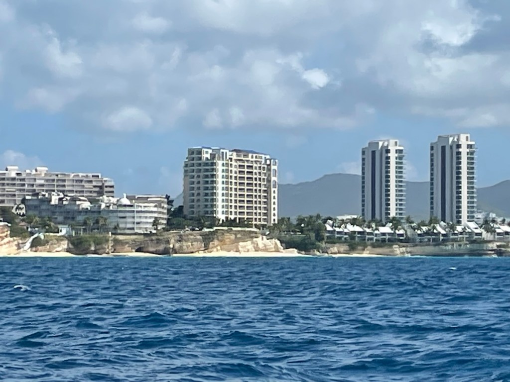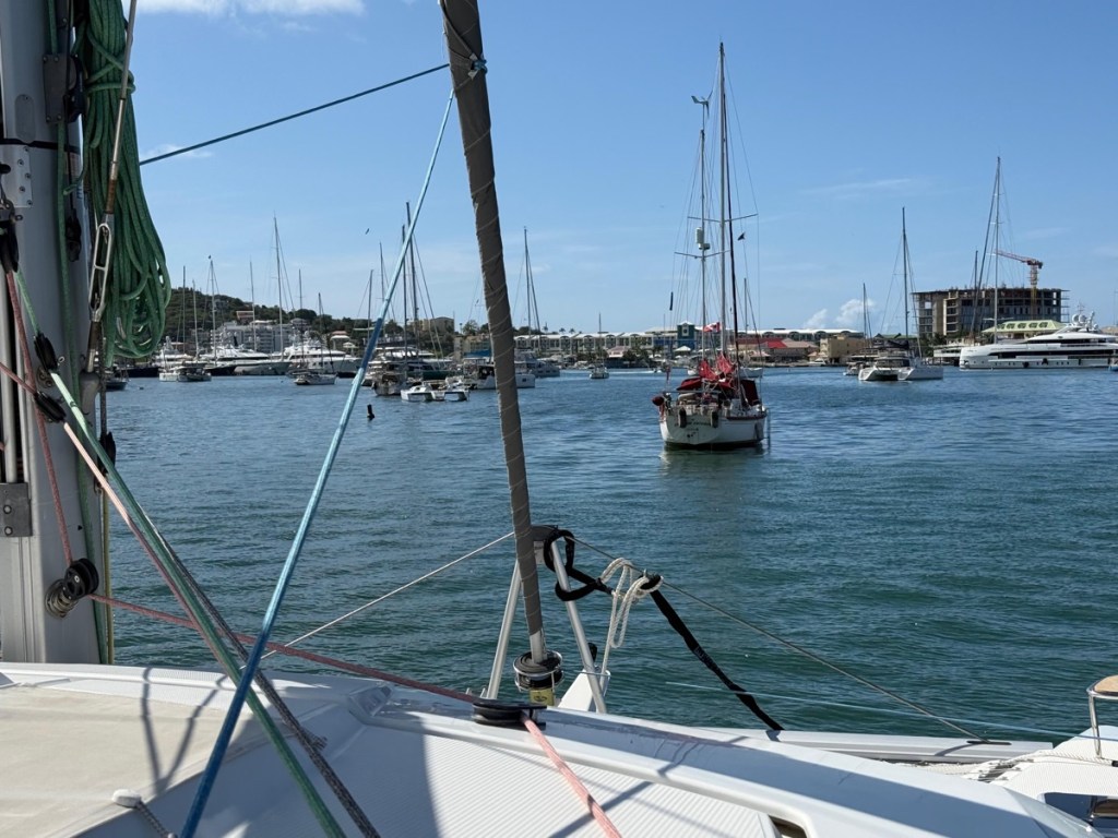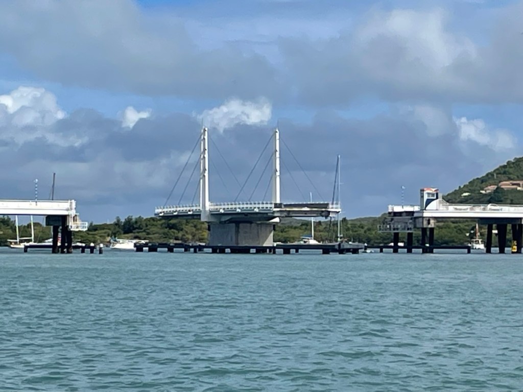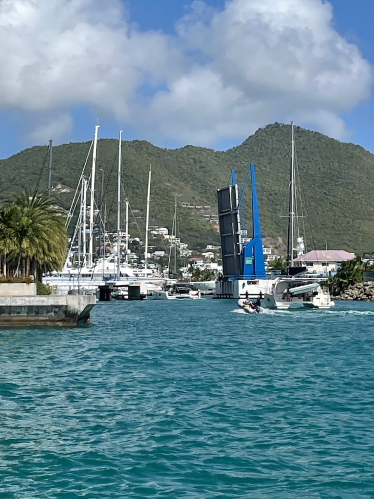 On Monday, Feb. 2 around 9 am, Mark and I had a surprise visit from a fellow cruiser anchored in Marigot Bay. Jim (whom we didn’t know) stopped by to warn us about impending weather. As you are probably aware, there was a severe nor’easter that impacted Canada and all the way down to the Bahamas (very high winds and cold temps). Well that weather caused some major wave action to head our way. We were informed that waves measuring 3 – 6 ft would be rolling into Marigot Bay from the north west starting Monday night and potentially lasting into Thursday. We were anchored close to shore and apparently that was not a good spot for these kinds of conditions (waves could break around us – and that wouldn’t be good). We decided to pull up anchor and head into the Simpson Bay Lagoon on the Dutch side. That sounds simple enough but it wasn’t. We were going to enter a new country and Sint Maarten has different check in requirements. St. Martin’s check in and out was all done online and digital clearance forms were emailed to us. Sint Maarten wanted a printed copy of these forms so Mark quickly dinghied to a marine shop near the fuel dock and they printed everything for us. We then took off for Simpson Bay, hoping to catch the 11:30am bridge opening. Well the wind and wave gods didn’t help us that morning. All was good until we rounded the west point of the island and headed southeast. Wind and waves were right on the nose and that slowed us enough to miss the opening. We anchored in the rolly, bouncy Simpson Bay for a very long 2 hours until we could enter the lagoon at the 2 pm opening. We were anchored and checked in a little after 3 pm.