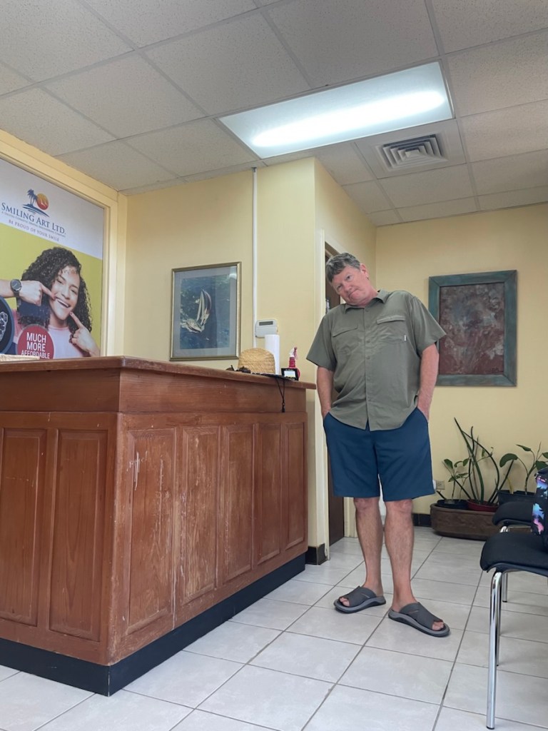 We had another reason for heading into Jolly Harbour on Thursday. Mark has been experiencing pain in his lower right jaw and figured it was a tooth issue. After a day (Wednesday Feb. 11) of phone calling frustration, Mark finally reached a person at our insurance company to confirm that a visit to a dentist was covered in our travel insurance. We stopped by the marina office and got a dentist recommendation from one of the office ladies. Mark was able to get a 10 am appointment on Friday (Feb. 13) so we were good to go. We headed back to the boat in the afternoon and that’s when the rolling started. It continued and actually got worse overnight so we decided that as soon as we were finished with the Dentist (who was in St. John – the capital city of Antigua), we’d move back to Five Islands.