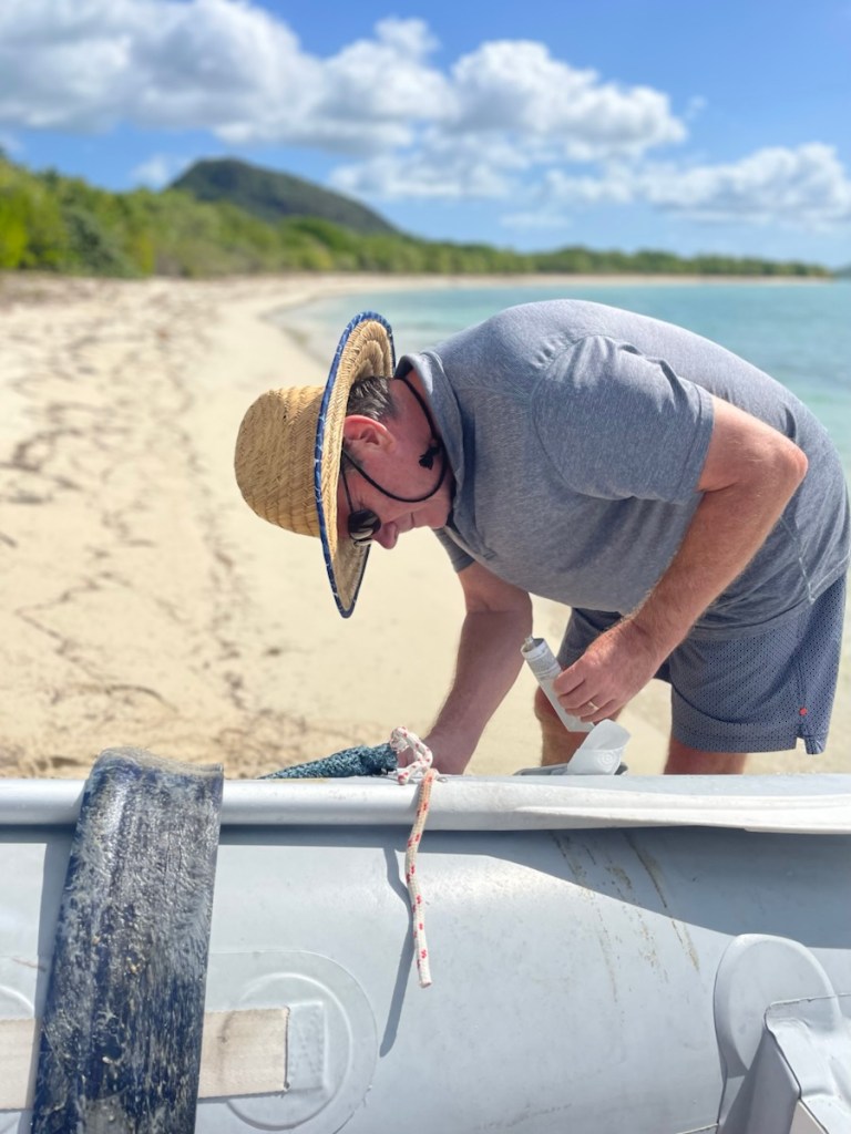 Today, February 14 (Happy Valentine’s Day!) we took the dinghy to shore and glued it up again!! We’re not having great luck with the do it yourself solutions so we’ll probably end up having a professional dinghy repair guy fix it in Trinidad. But for now – we hope the glue holds for a bit. On Wednesday we head into the marina for 2 weeks – one week of that time Evelyn and Liam will be visiting. We’ve decided to rent a car for the week so we can check out the whole island! Very excited to have Evelyn and Liam onboard!!