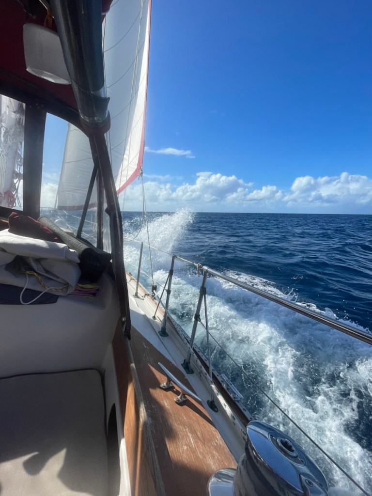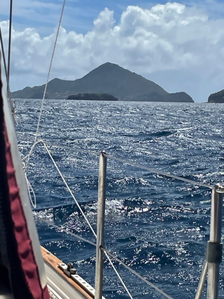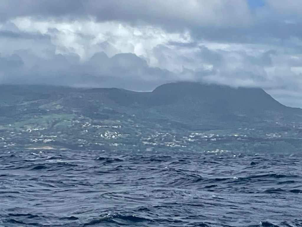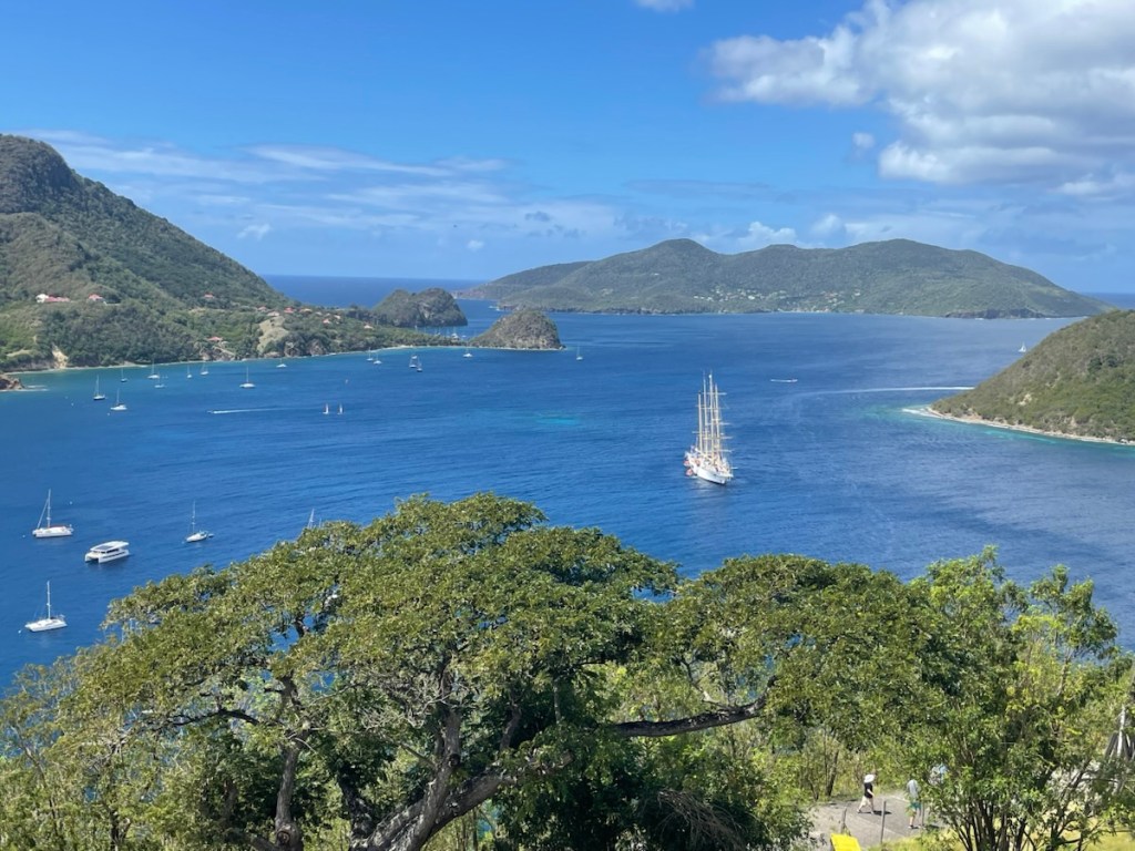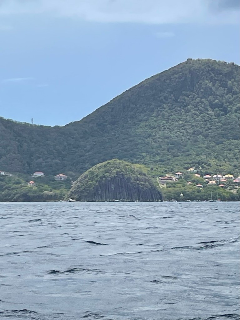 Our little jump south to Les Saintes Islands on March. 8th was a bit of a sloppy one. We left our anchorage nice and early – 7 am and moved easily along the west side of Guadeloupe. The island blocked all of the waves and also impacted the wind so for the first part of our 20nm trip we motored. Sharron and John left about 10 minutes before us so we could watch their progress as we headed south. John kept us informed the wind and waves at their location so we were prepared for some of the big gusts we encountered. We pulled out the jib after about an hour and motor-sailed until we were close to southwest tip of the island. At that point, we put up the mizzen and started sailing (no engine). All was good until we came out from behind the island – boy did it get wild!! The wind and waves piped up (not as bad as our crossing to Guadeloupe) which gave us some speed. Unfortunately the wind was ahead of the beam (again) and we really couldn’t sail our south east course to Les Saintes. No worries – we decided to sail almost due south to basically go behind and around the largest of the Les Saintes Islands called Terre-de-Bas.