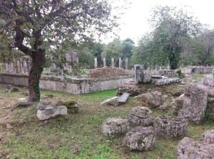 Our next major ancient site visit was to Olympia which is about 2.5 hours from Astros on the west coast. It was our first day of rain but we still explored the ruins of Olympia. It was amazing but a little hard to find. After a bit of searching around, we noticed many buses traveling along a fairly major road and sure enough, they were headed to Olympia.