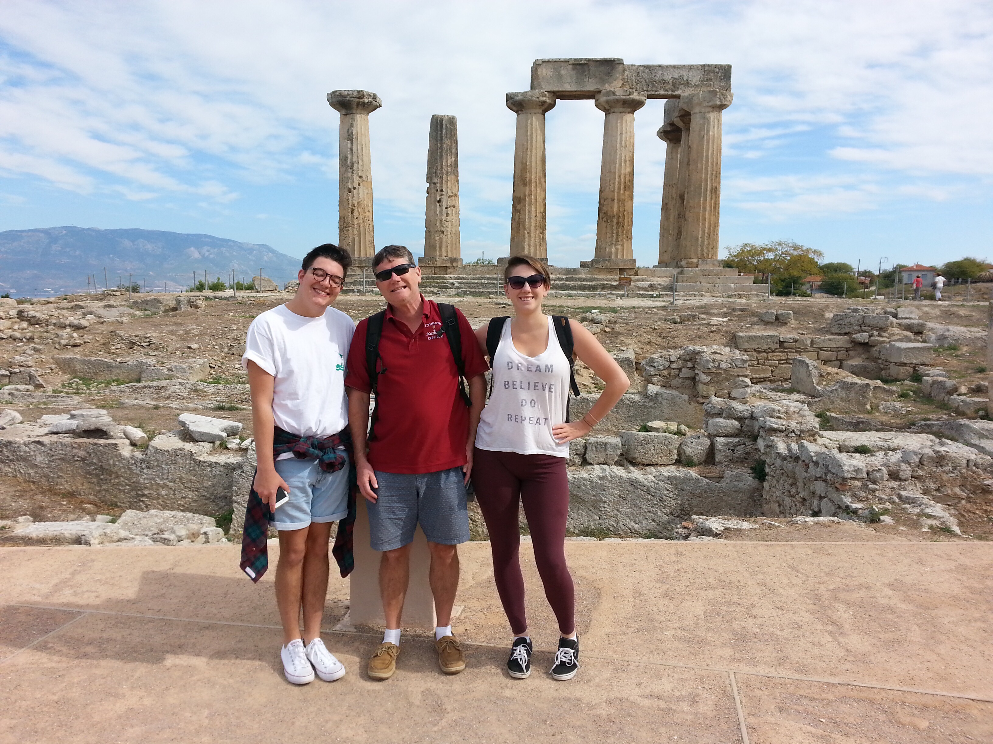 one of the crazy hikers at the top.A typical Astros morning.Checking out the Korinthos ruins.Lucas, Mark and Evelyn pose infront of the temple of Apollo in Korinthos.Some Roman ruins in Korinthos.The Korinthos canal has a crazy bridge that lowers into the water.