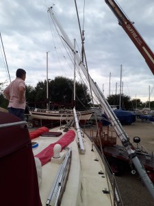 New carpet in the main cabin.Lifting the mast into place.Hard to just stand and watch as the mast lifts slowly into a vertical position.Ah man – beehive all over my shoe!!🐝This is what fell out of the mast. Check out the swarm of bees trying to get the last bit of honey.Almost there. Unfortunately the wind keeps twisting the mast away from the hole.Nice dark clouds as the mast finds it’s way home!All ready to be hauled to Charlotte Harbor Marina to be launched!Goodbye J&R Boat Storage. Won’t miss the bees or the stinky smell.