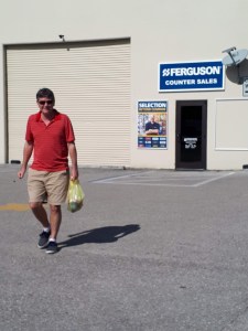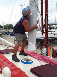 I think I’ve already mentioned that we are replacing our rigging. Mark removed the chainplates (long stainless steel plates that connect the stays to the boat deck) and we took them to the St. Peterburg’s rigger we have been working with to have them recreated. This was supposed to take about 2 days and instead it took 2 weeks!!!! We had to drive up to Clearwater on Tuesday morning to pick up the new chainplates and then install as many as possible so the mast could go back up that afternoon. And of course, it rained – the only rain we’ve had since arriving in Florida – when the deck has holes in it where the chainplates go. But we made it and both the main and mizzen masts are still standing 😉.