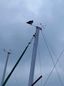 Our bee situation has been resolved with lots of effort on our part (and a lot of wasp spray). We spent about 3 days hacking away at the hive inside our mast. Mark cut more holes in the mast so we could get a bit better access to the hive. Using some pieces of our old stays, we poked away at the hive until we felt pretty good about the amount of material we’d removed from the mast. The mast was lifted into place on Tuesday, Nov. 20 and when it became vertical, a very large mass of hive fell out onto the ground- yippy for us but not so much for the guy holding our mast. He had beehive all over his shoes!😊