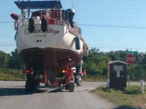 Got to stop at the stop sign!Heading down the road to Charlotte Harbor Marina!Crimson Kathryn has been transferred from the trailer to the travel lift and is heading for the water.