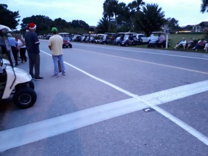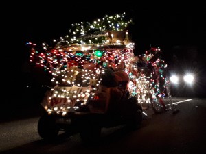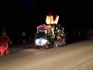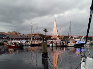 Speaking of Christmas, the Marina has been ringing in the season with lots of events. We went to an open house at the yacht club – free drinks and food!! There was a golf cart parade – all these golf carts decorated for Christmas (see photos below). Lots of people lined the streets to watch the parade (some with wine and other drinks in hand). And last night, the Marina had a boat decorating contest. Man some people went all out for this event! We walked along the dock and had a good look at the boats – very cool!