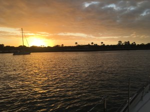 We spent 2 days traveling up the intracoastal waterway and now we’re in St. Augustine. This is such a lovely town and the Municipal Marina is right in the heart of the old city. This is our 2nd time being at this marina on a mooring and we’ve enjoyed it both times. We’re very close to the Fort, which is good and bad. They do tours and re-enactments at the Fort. Part of this includes the firing of a cannon – it’s like we’re under attack everyday!! Mark was working on the engine yesterday when the cannon went off – we both got startled by that one!