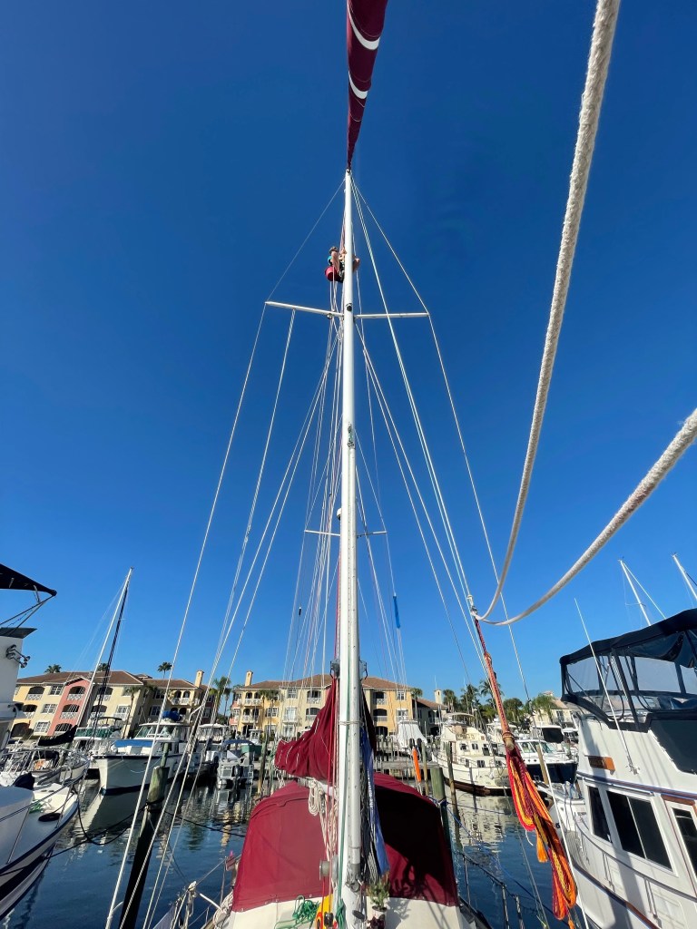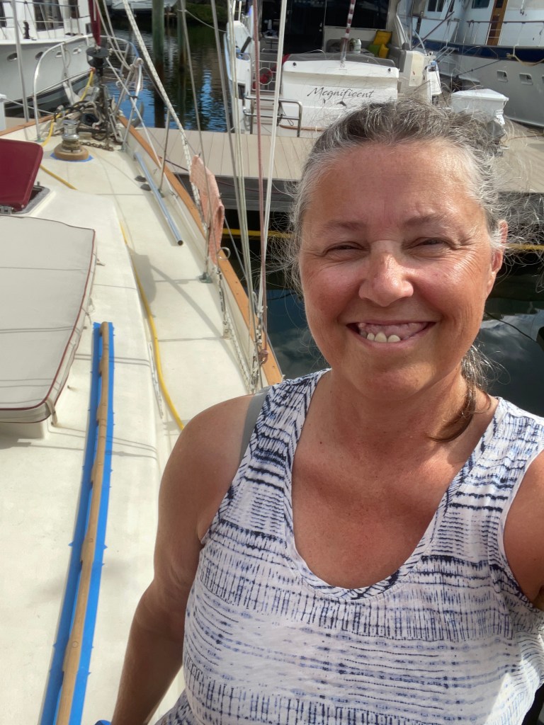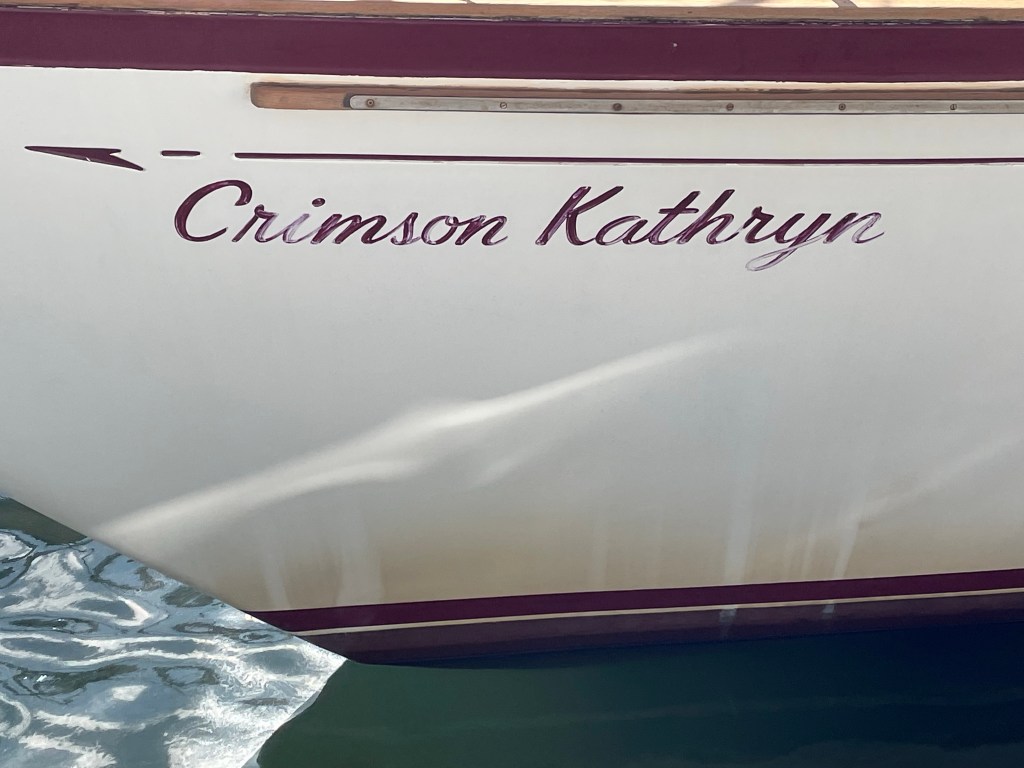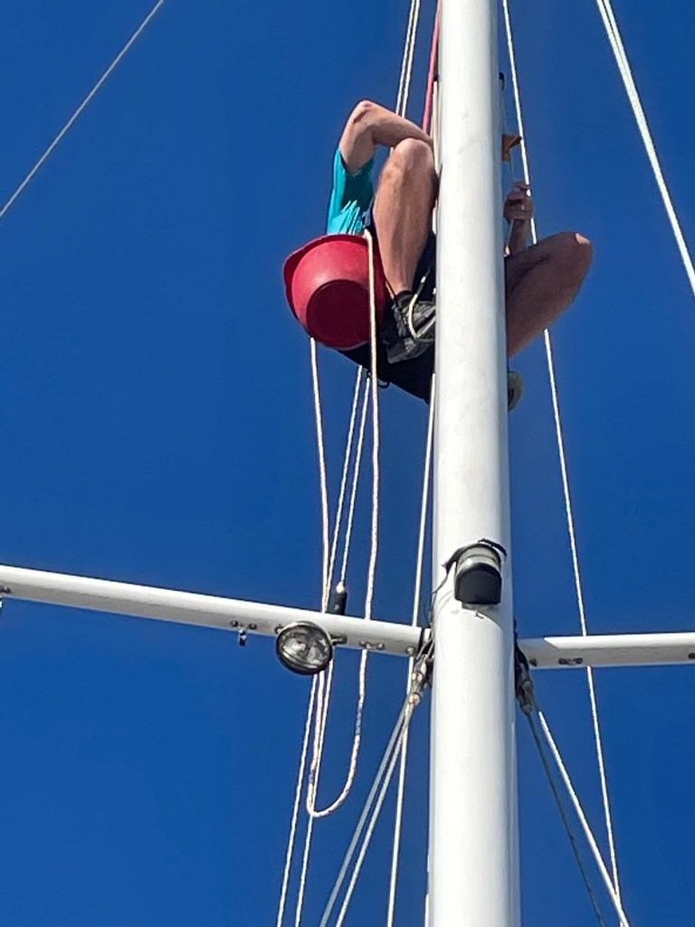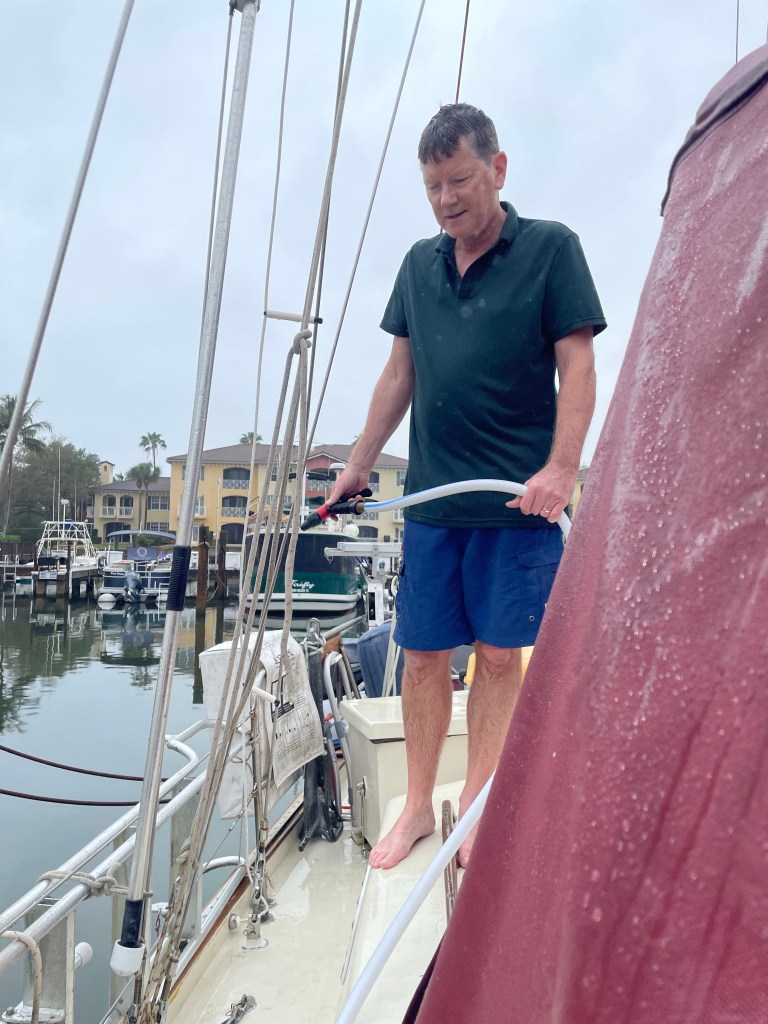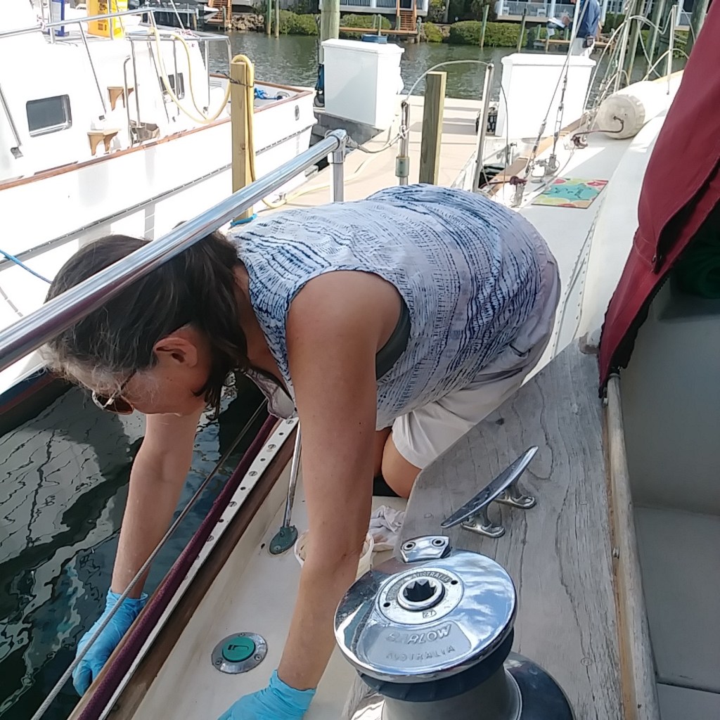 Mark also made some headway on cleaning the hull. Crimson Kathryn had a moustache (and she wasn’t too happy about it 😉) – a lovely souvenir of the ICW! We have had this brown mark on the bow since April 2020 – when we put the boat on the hard! It takes a lot of scrubbing and polishing to get the hull looking clean!