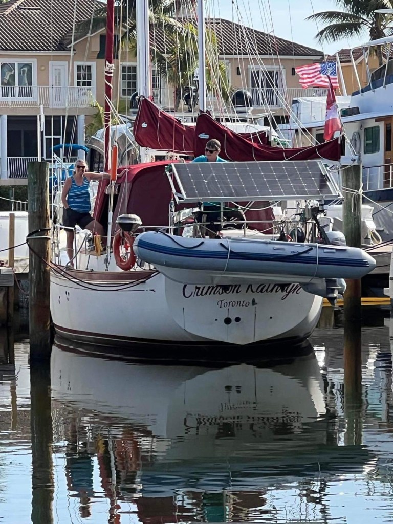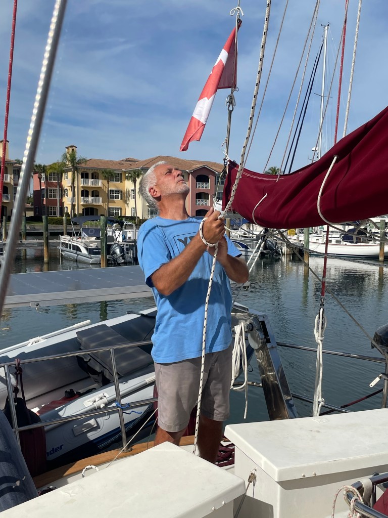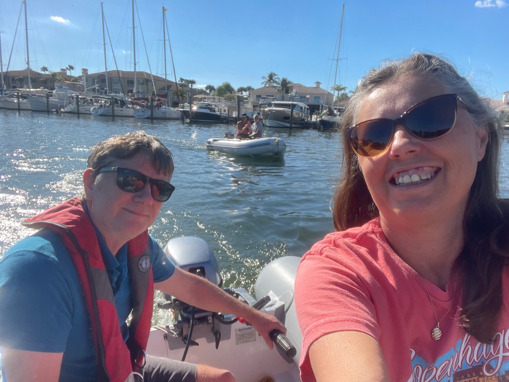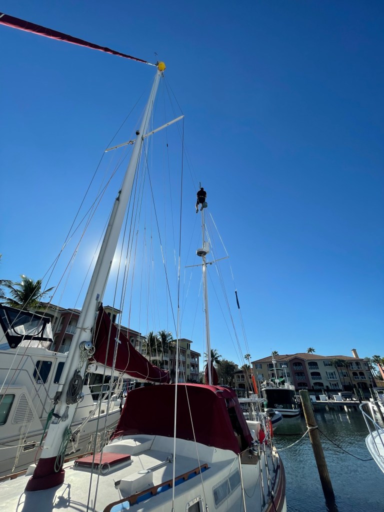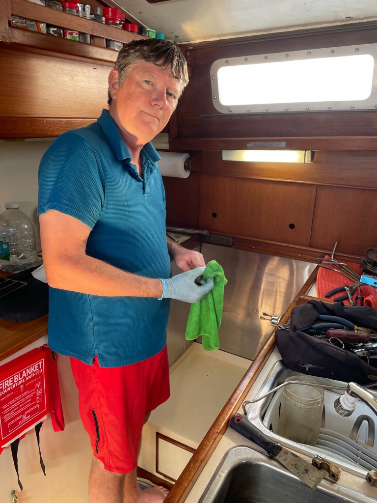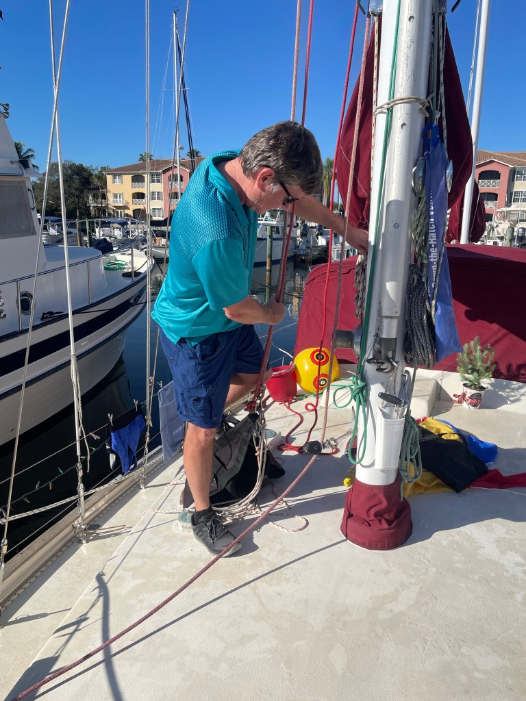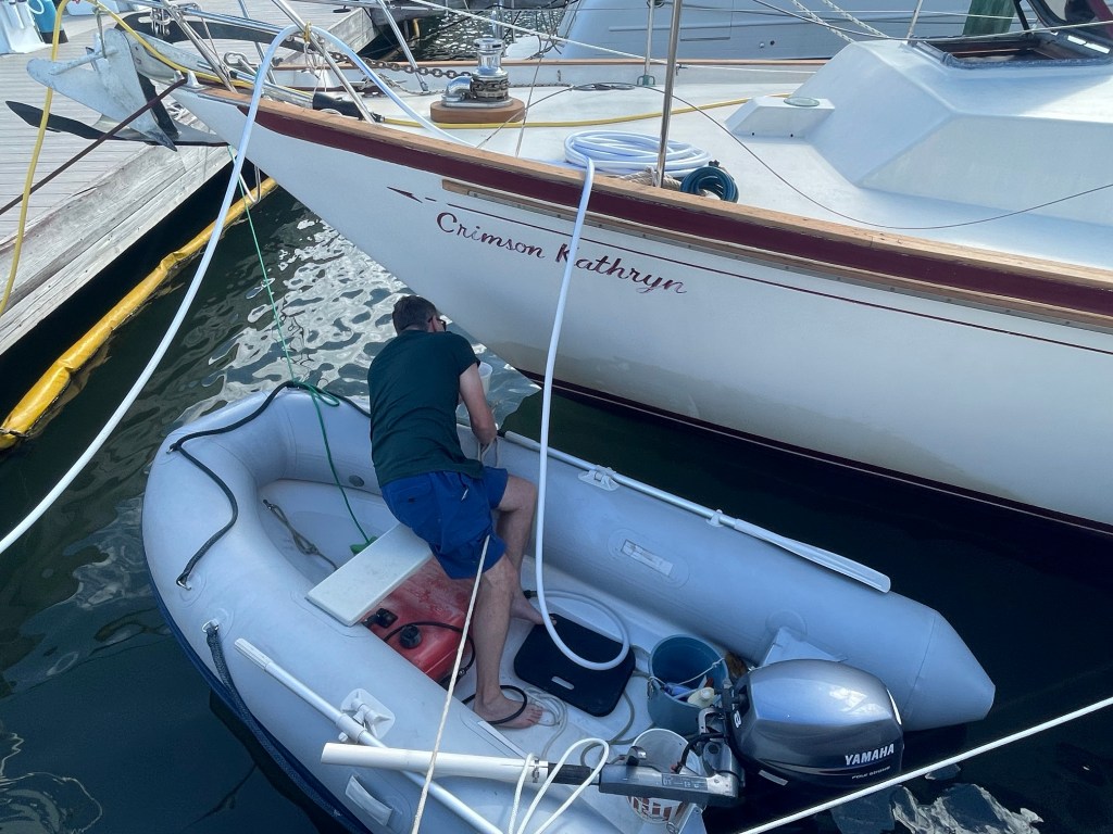 Mark also made some headway on cleaning the hull. Crimson Kathryn had a moustache (and she wasn’t too happy about it 😉) – a lovely souvenir of the ICW! We have had this brown mark on the bow since April 2020 – when we put the boat on the hard! It takes a lot of scrubbing and polishing to get the hull looking clean!