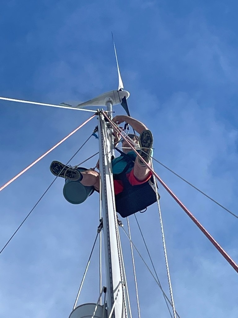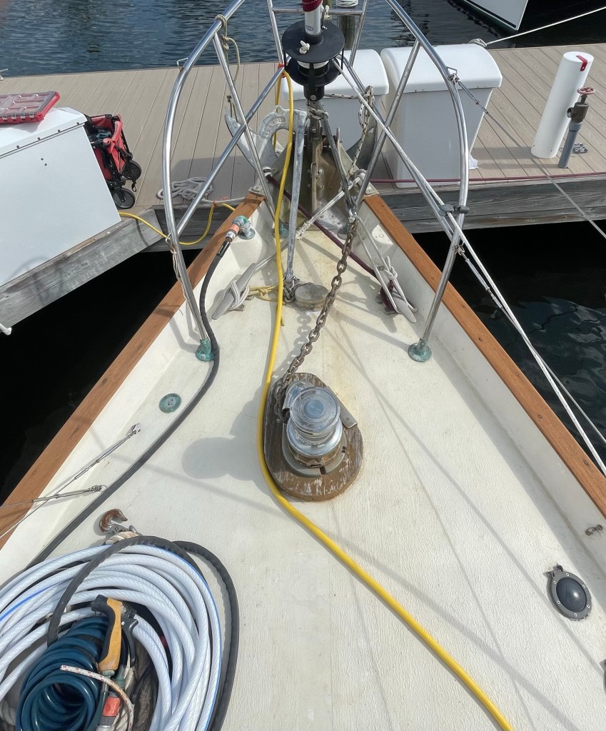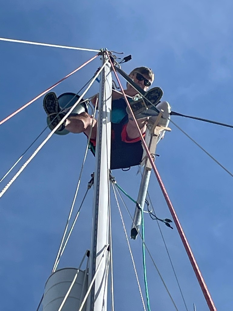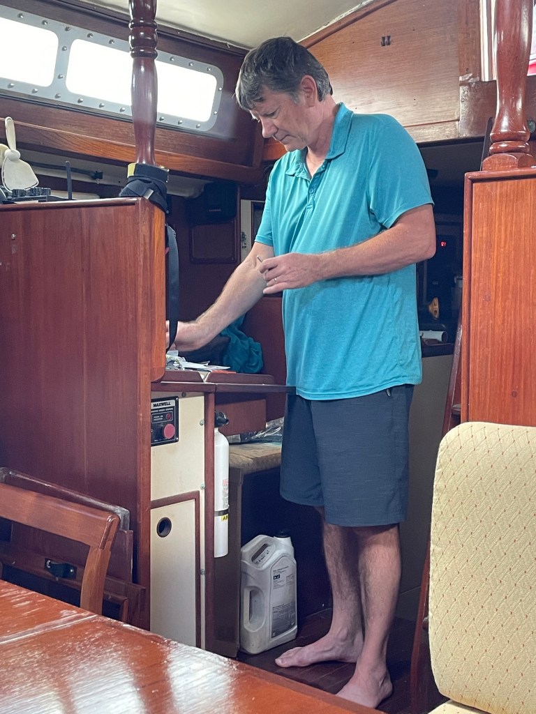 Now that we have a few more days here, Mark is looking at all those jobs that just kept moving down the list. Starting off the day, Mark worked on our new (to us) anchor. We bought this very large Manson anchor (80 lbs – meant for a 60ft boat) back at Reynolds and discovered quite quickly that it was very difficult to bring back aboard. Mark has been working on different ways to make it easier to haul the anchor back up from the water. Today he drilled a new hole in the anchor shaft to help with the retrieval process. Several tests later (and lots of noise), the anchor was coming onboard more easily! Success.