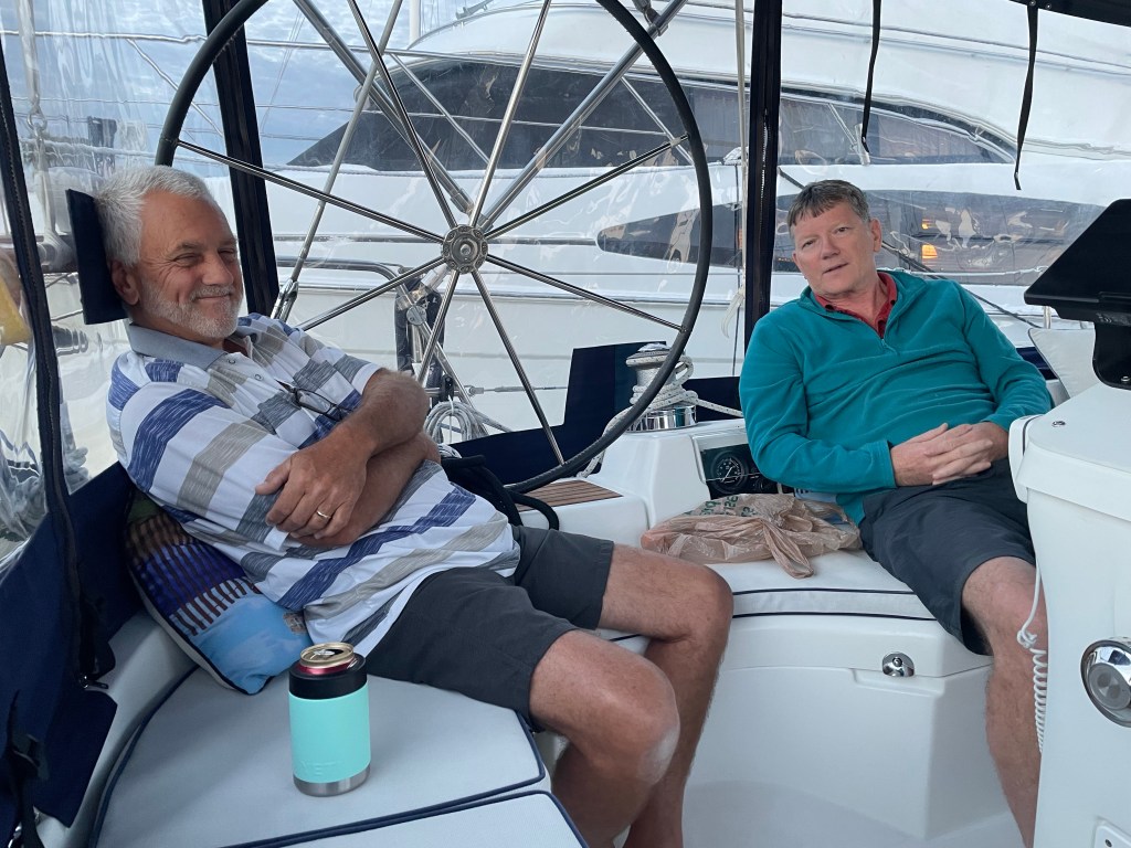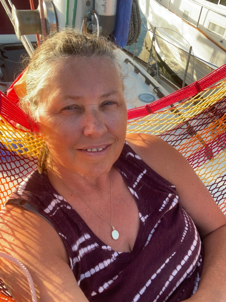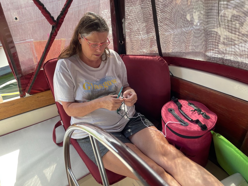 While Mark was busy working on the hull, I made spaghetti sauce and worked on my crochet projects. I also moved all of our cockpit cushions onto the deck to dry them out after the rain we’ve had for the past few days. Our enclosure has some leaky zippers and our cushions get very wet when it rains. It doesn’t take long for them to dry out, especially when it’s a nice sunny and windy day (which is what we had today).