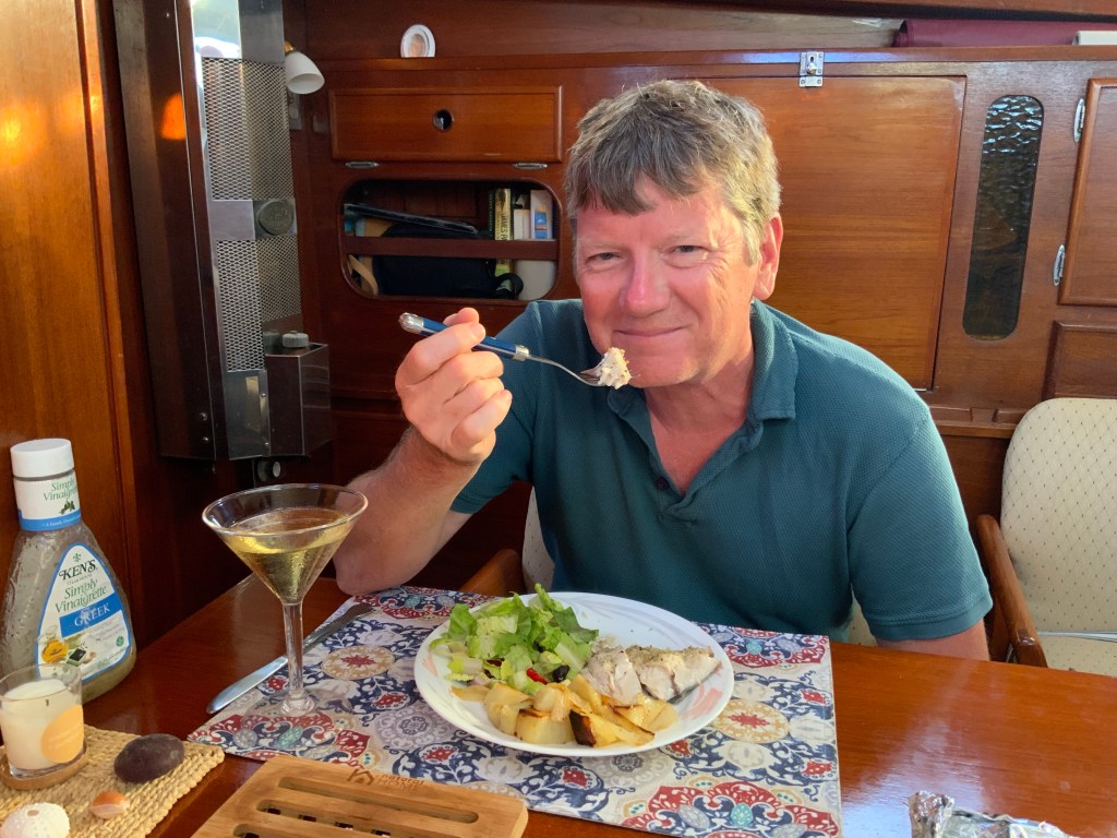 We’ve also done some socializing and baking this weekend! Our friends Jane and Steve joined us here at Red Shanks on Friday and we had happy hour with them that night. On Saturday Mark baked some brownies and I made focaccia! And then last night (Sunday), we headed over to Jane and Steve’s for dinner and a movie. It was loads of fun and we watched a classic (must watch) sailors’ movie called “Captain Ron”, starring Kurt Russell and Martin Short. This movie makes all other sailors look (and feel) good!! It was a fun night.