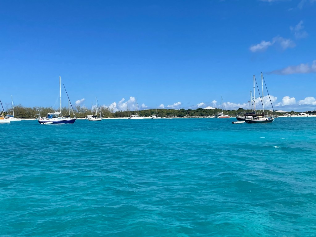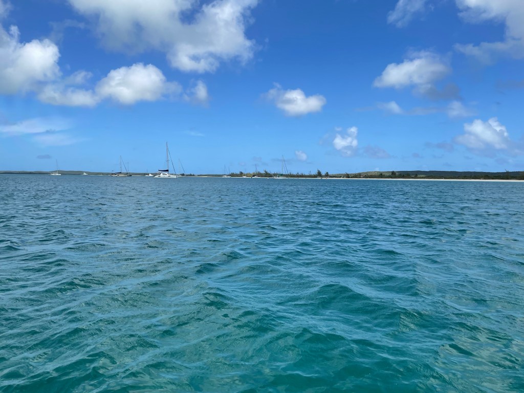 The wind had already picked up and changed directions. It was now coming from the south west and plowing straight into the New Bight anchorage – big waves bouncing everyone around! Many boats from our south spot had already moved up, joining the boats that were already anchored so it made finding a good spot to anchor a little more challenging. It is important to drop your anchor into the wind and because the wind was coming from the south west, we had to anchor with our bow facing out and our stern facing the beach. That’s not the usual way to anchor and it’s definitely more difficult. Most times you anchor with boats in front or beside you facing the shore (more or less). This time we had to turn away from shore, move out in front of the other boats and try to judge the distance from our stern to the other boats (while keeping in mind you have to drop anchor, let out 75 – 100ft of chain and then back down on it!). Oh and I forgot to mention that earlier in the morning, our plotter stopped working! Mark managed to get most of it up and running before we headed to New Bight except for the depth sounder (tricky to anchor when you don’t know how deep the water is!!). Time to trust the maps for water depth!