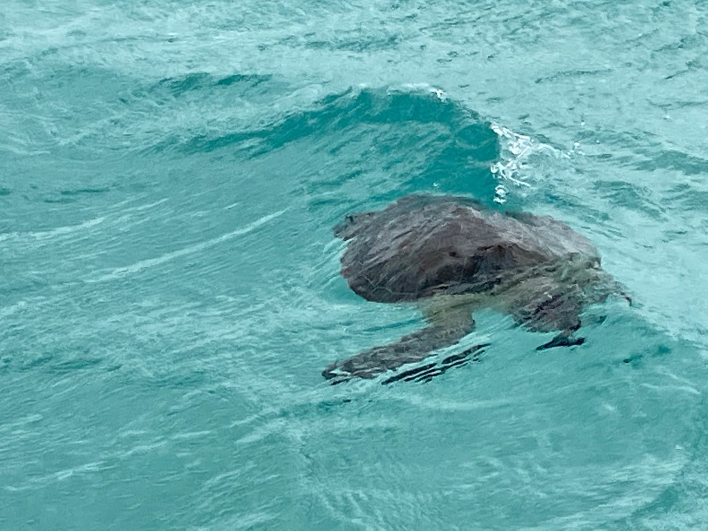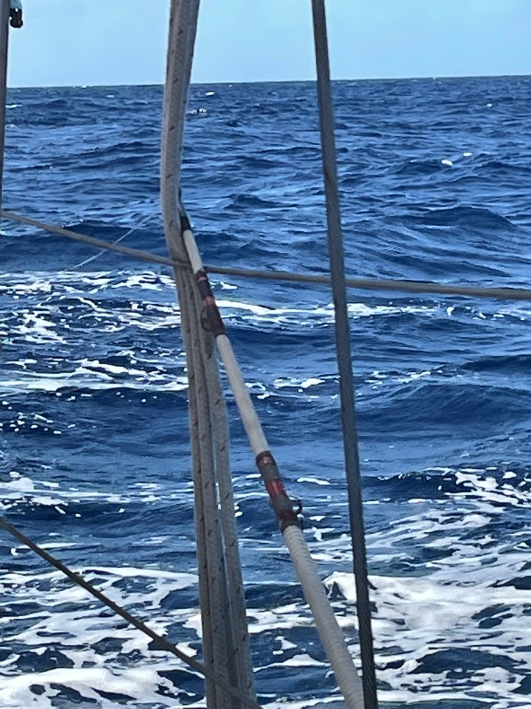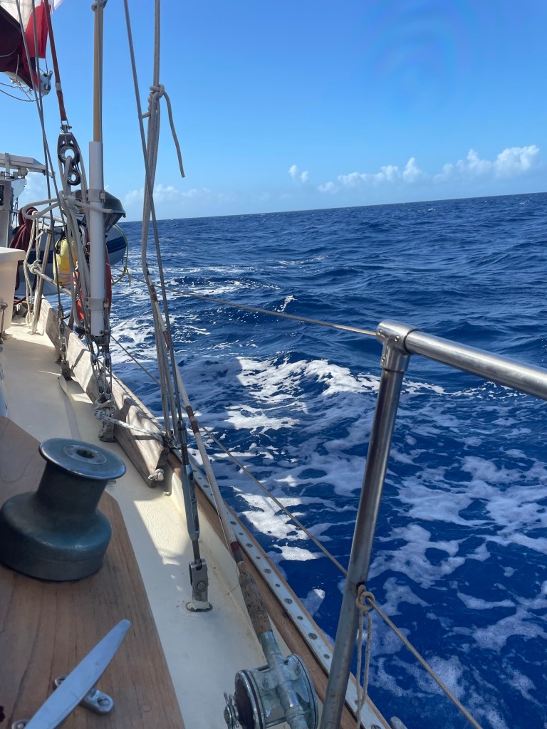 Whenever we travel across deep waters – the Exuma Sound is 2000ft plus deep – we like to put our fishing line out. This is called trolling – the fishing line just drags out behind you. Mark is the captain of fishing and he looks after the whole process. Today, we started fishing as soon as we left the Bight and continued most of the way across the sound. Mark diligently changed the lures he was using every 30 minutes or so. At one point we talked about turning into the wind “if” we caught a fish because we had a sail up and waves rolling us from the stern. In my head I thought okay I’ll turn into the wind – but how far and for how long….I left those questions for later – didn’t want to jinx things.