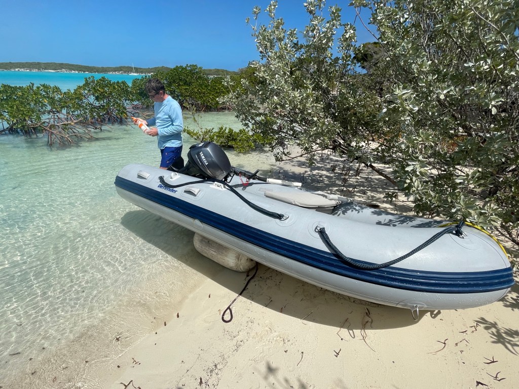 We’ve managed to keep ourselves entertained during this blow by doing little jobs and getting out in the dinghy a bit. Right in front of us is a small island called Moss Cay. It has a nice beach that faces east and a sandy area on the west side where you can leave your dinghy. We went over there on Saturday – I walked the beach and Mark worked on the dinghy motor. Mark added these fins just above the propeller on the motor that are supposed to help your dinghy plane better. And guess what – it works really well!! We had some fun planing around our anchorage!!
