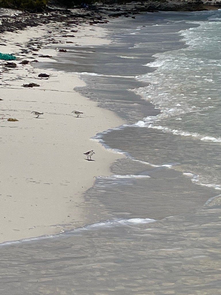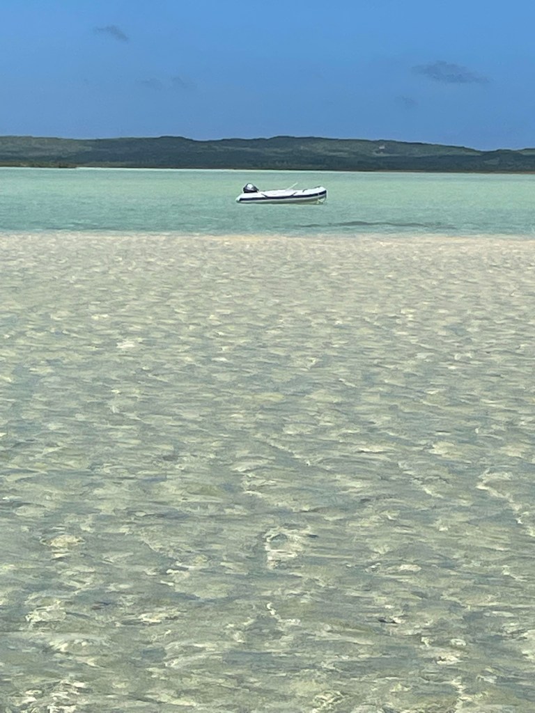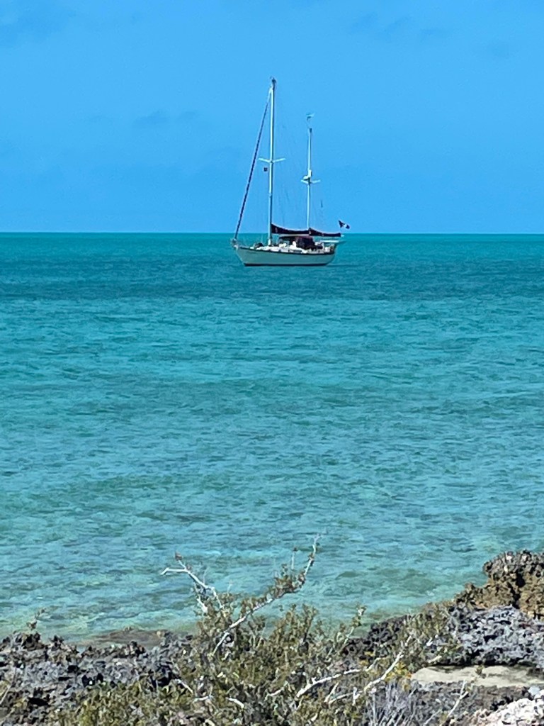 Mark is fixing our leaky dinghy again – 3rd time’s the charm…right?Crimson Kathryn from Moss Cay.The beach on the east side of Moss Cay.Can’t get enough of the crazy blue water!Birds on the beach at Moss Cay.A wrecked trimaran that’s sinking into the water near the Red Shanks anchorages.There is is a boat ramp beside this tree – south of Red Shanks near Rolle Town.We walked up to the top of the hill near Rolle Town. Quite the view!!Same view – just can’t get enough of that water!!Our dinghy is on a beach near the house in this photo!We had one last happy hour with Daydreams ll on our boat tonight.