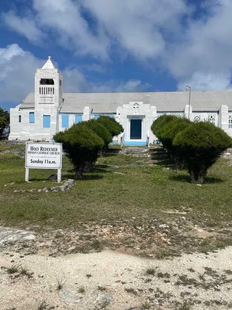 The infamous New Bight anchorage!This is the windlass that normally does all the heavy lifting when we anchor.This is the fortress anchor that saved us (this photo is before we got the new anchor)This is the highest point in the Bahamas, Mt. Alvernia and at the top is a 3/4 scale monastery called The Hermitage, built by Monsignor Jerome Hawkes.The beach at New Bight.The beach road has a few places to eat and some colourful buildings.This Catholic Church also has a hurricane shelter next to it.The local goat – he checks out all the people as they walk by.A very nicely landscaped home in New Bight.