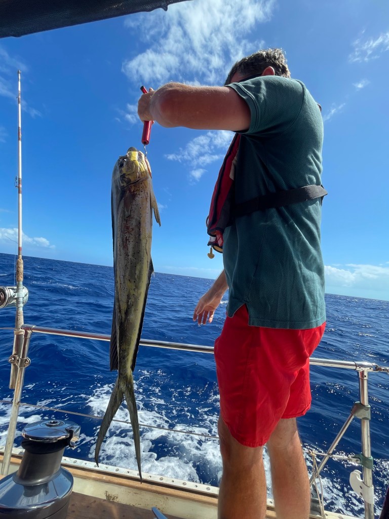 This mahi is 8-9lbs!!The fisherman is enjoying his catch with some nice white wine (in a weird glass – we had bubbly after to celebrate the catch)!