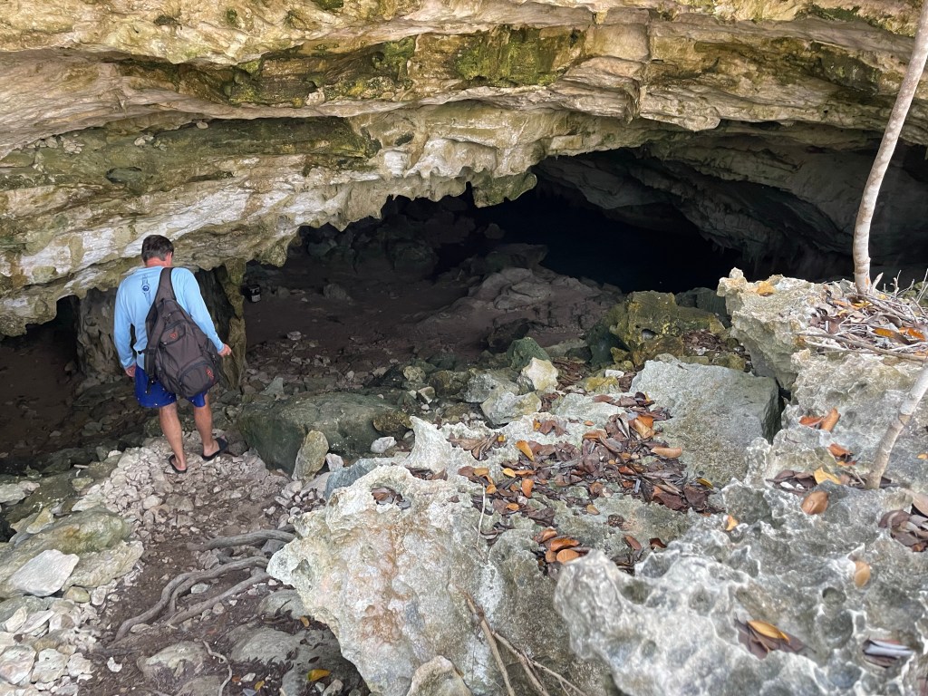 Today, Friday, March 18, we decided to head north to Great Guana Cay (the home of Black Point Settlement which we’ve visited already this season) and to anchor at Oven Rock. This southern part of Great Guana has an interior cave that (apparently) is 500ft deep. We reached our destination around 10:30am and went ashore to explore the cave. It was very cool – we have no idea how this cave was originally found but the trail to it is well established. We walked up the hillside and then down into the cave and swam in salty cave water. It was dark but still visible – a bit creepy but very interesting. After our swim in the cave, we walked out to a sound side beach that was very secluded and lovely. We packed a lunch, sat on the beach and enjoyed this spot all by ourselves!! It’s rare to have any of these ‘touristy” areas by yourself, so we enjoyed every minute.