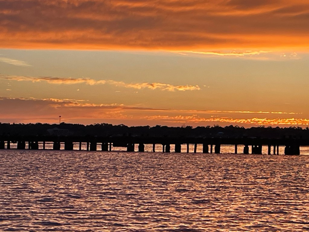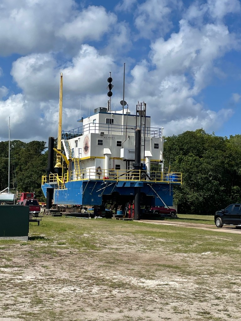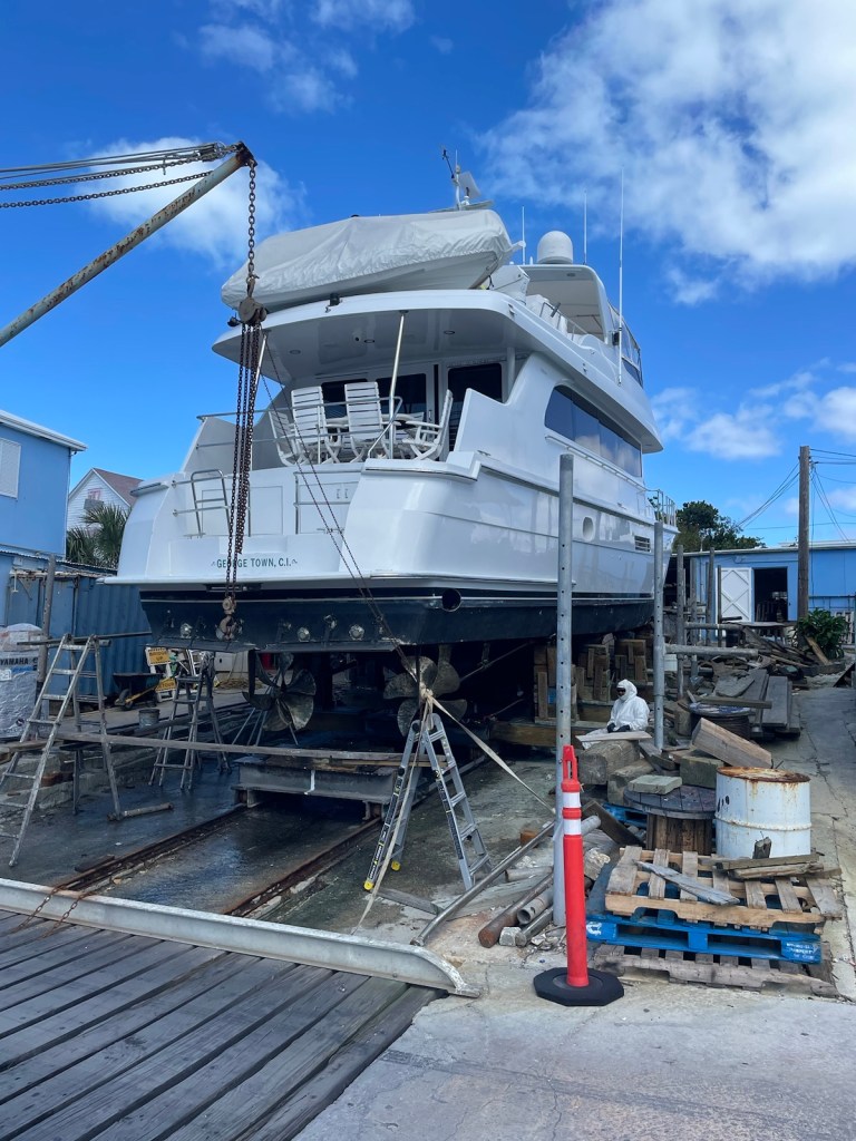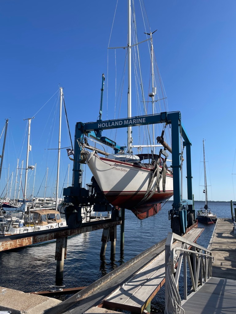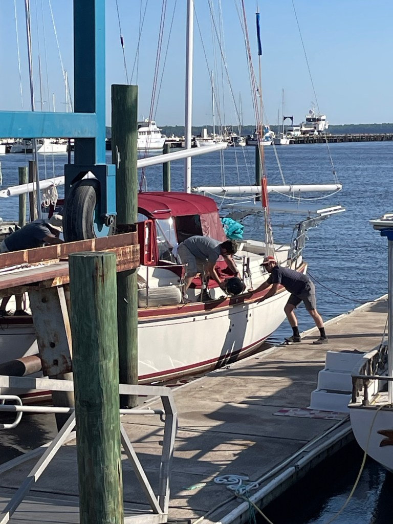 We woke early on Tuesday morning and the wind was down – yippee!! Julia and Brad volunteered to help us get off the pier and then get us onto the haulout dock and they arrived right on time (around 7:30am). Unfortunately we had to get off the pier with a flood tide which meant we were being pushed onto the pier. We were all ready to spring our stern off the pier by keeping a dock line on the bow but the current was so strong that we had a lot of trouble prying off. After several tries, Mark just revved our engine as hard as he could – we blasted (well it is a sailboat so it was a slow blast😁) off the pier. It was crazy!!! I was on the bow looking back to see our solar panel and outboard motor getting closer and closer to the pier as Mark tried to move us away while the current pushed us in!! We made it off but it was tense. We slowed down and headed for the haulout dock where Julia and Brad were waiting to take our lines. It was much easier getting onto this dock because the current was pushing us in but it still was a challenge. Mark did a great job maneuvering around 2 boats at the end of the dock to get us into position for haulout.