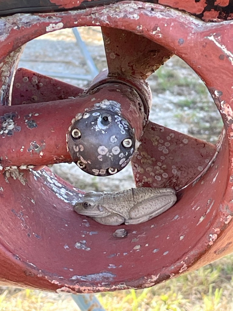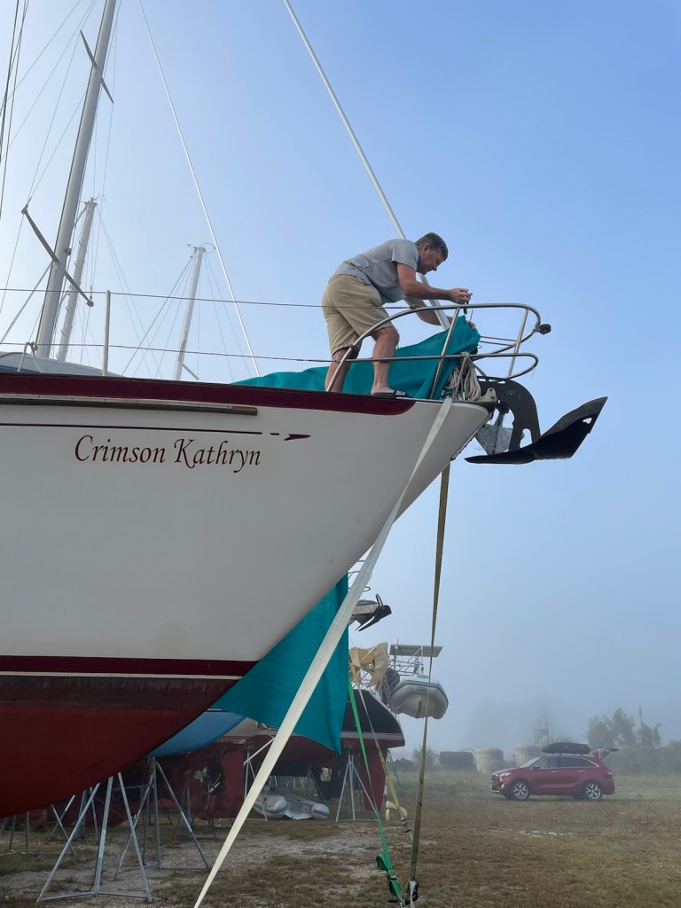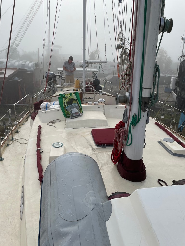 It’s been a very productive two days in the boatyard. We arrived at the yard around 8:30am on Monday and got straight to work pulling off our sun shade. As the cover was coming down, a frog came flying off, landing a few feet away from me. The poor guy seemed a little shocked but eventually jumped away. It was a super foggy morning which made the deck of the boat very wet and slippery.
