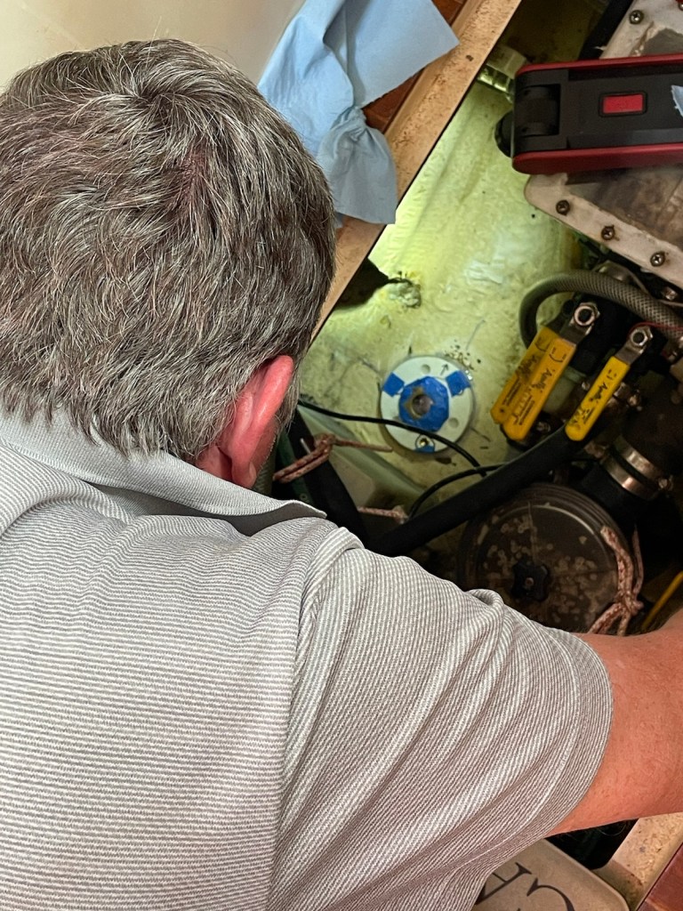 The top priority pre-launch job is putting in a new thru hull that we are hoping will solve our water intake issues. Our engine is water cooled and we’ve been having problems with it overheating. This new thru hull should help with this issue. Mark began preparing the area for the new thru hull and in short time had drilled the hole.