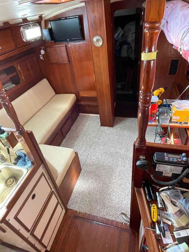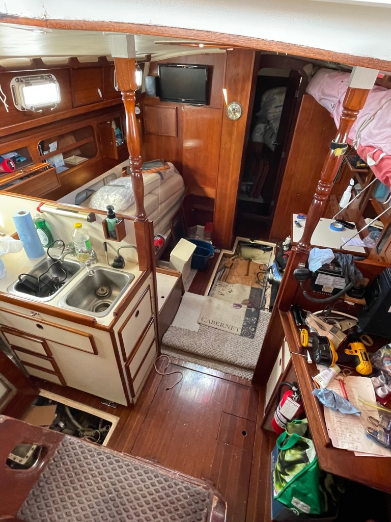 For the most part, the interior of the boat was in good shape – a bit of mold in the usual places. I started the day in the aft cabin. Lots of washing with vinegar and pinesol. By the end of the day, we had made good progress on the thru hull and the cleaning.