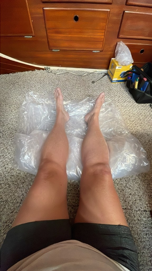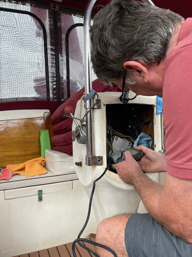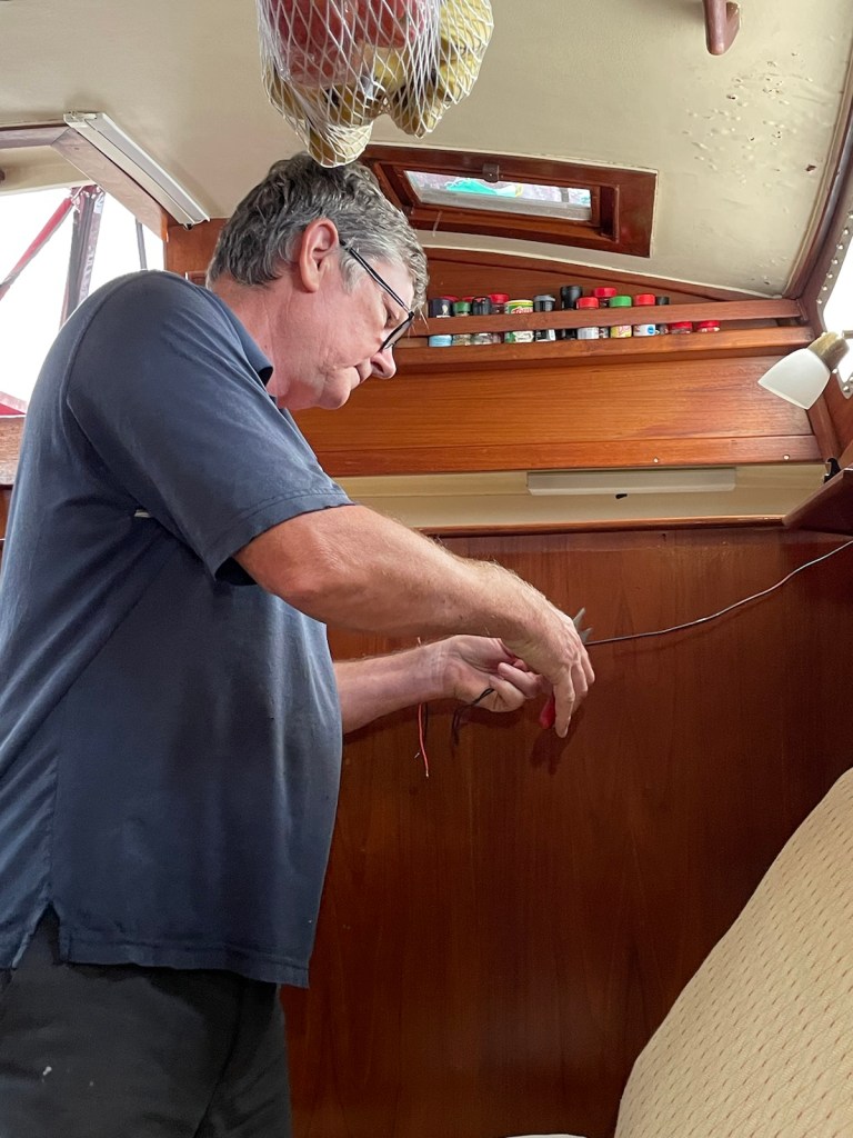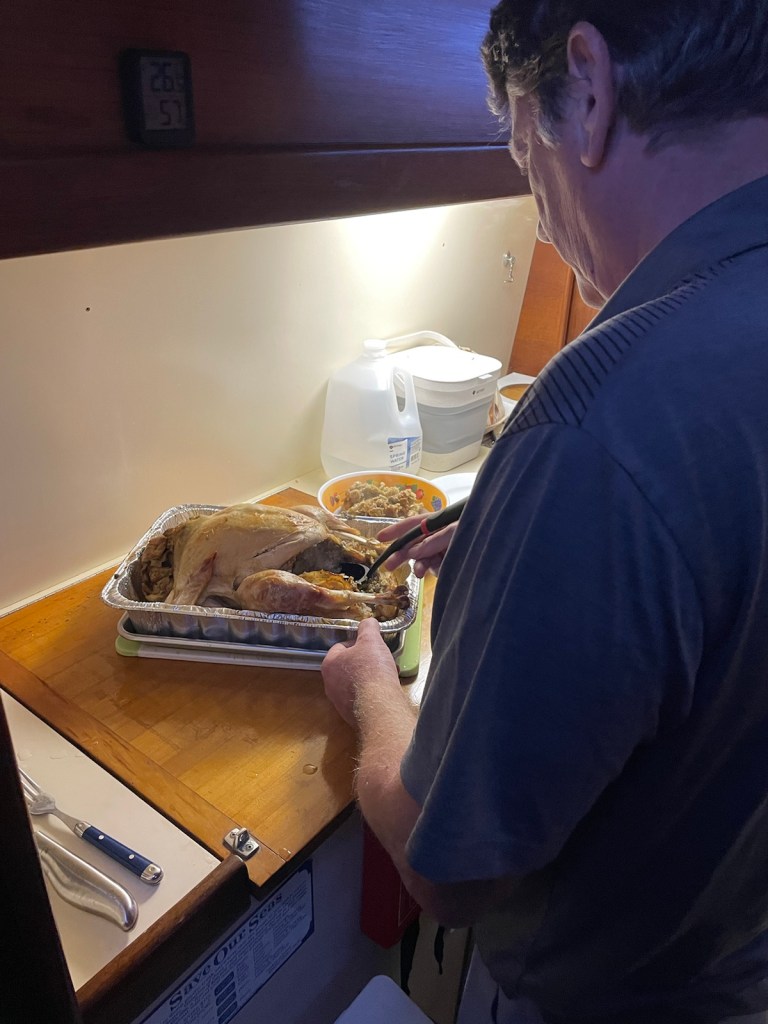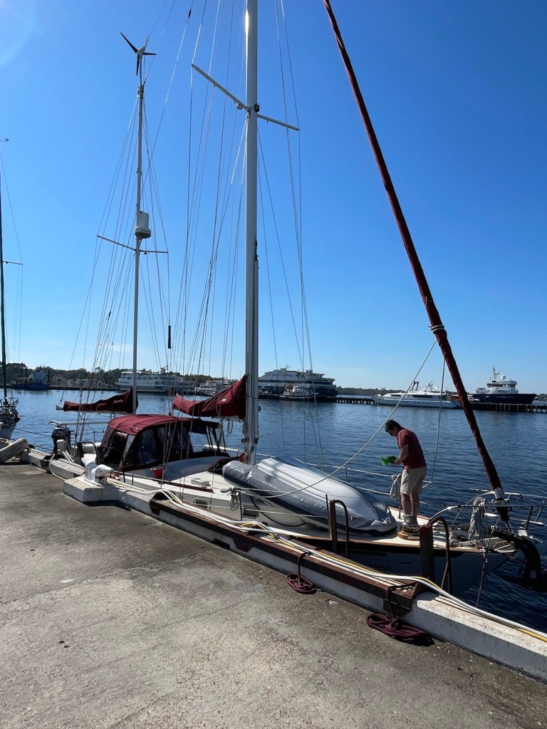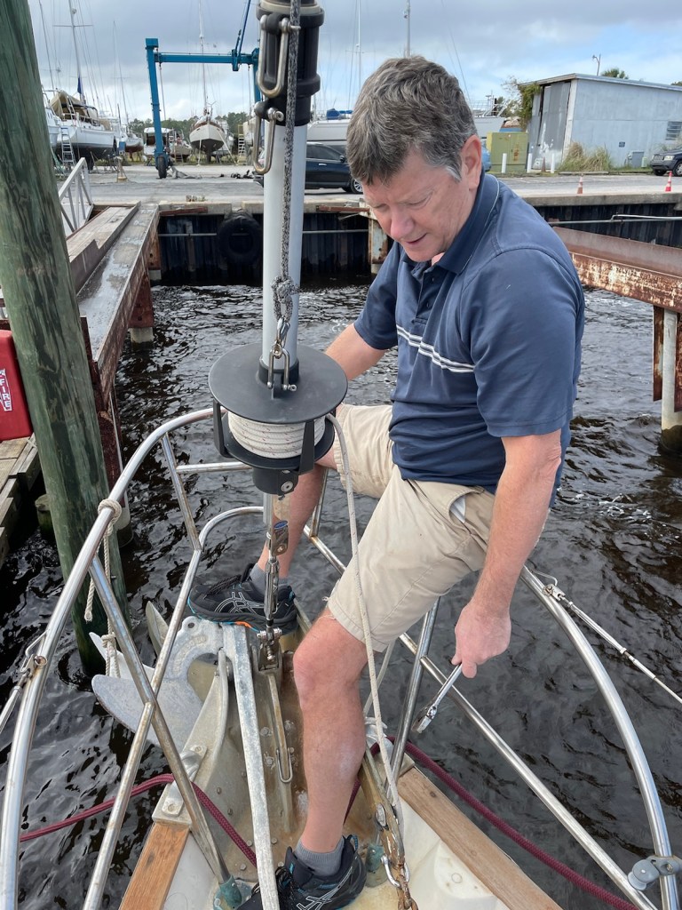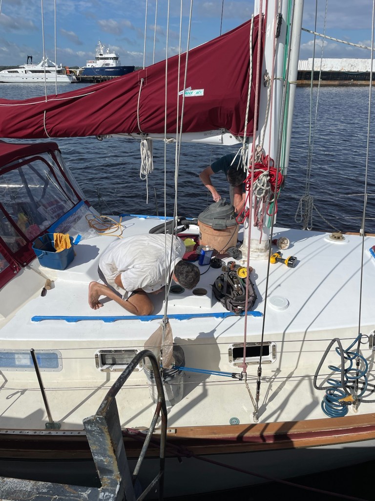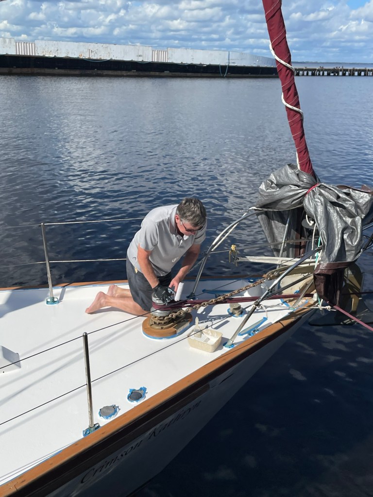 Mark finished the renovation of the chain locker on Monday (Nov. 27). There was a partition in the locker dividing it in half but our new 200ft of chain wouldn’t fit so Mark rearranged the partition. Late in the afternoon we loaded the new chain into the locker – it was a perfect redesign!! After the chain was loaded aboard, we had to bring our 80lb anchor back into position on the bow. We used the windlass to haul the anchor back into position and as it got close to the roller at the bow, the rope broke!! Luckily Mark was holding the second line and as he struggled to hold onto this line, I quickly grabbed the end of that rope. The anchor dropped back into the water and gave Mark a nasty rope burn (removing some skin too). We tied off the line and caught our breath. One of our dock neighbours came over and helped Mark lift the anchor close enough to the bow so I could attached a bigger rope to the anchor. With the new line we were able to get the anchor back on deck and then secured to the chain!!