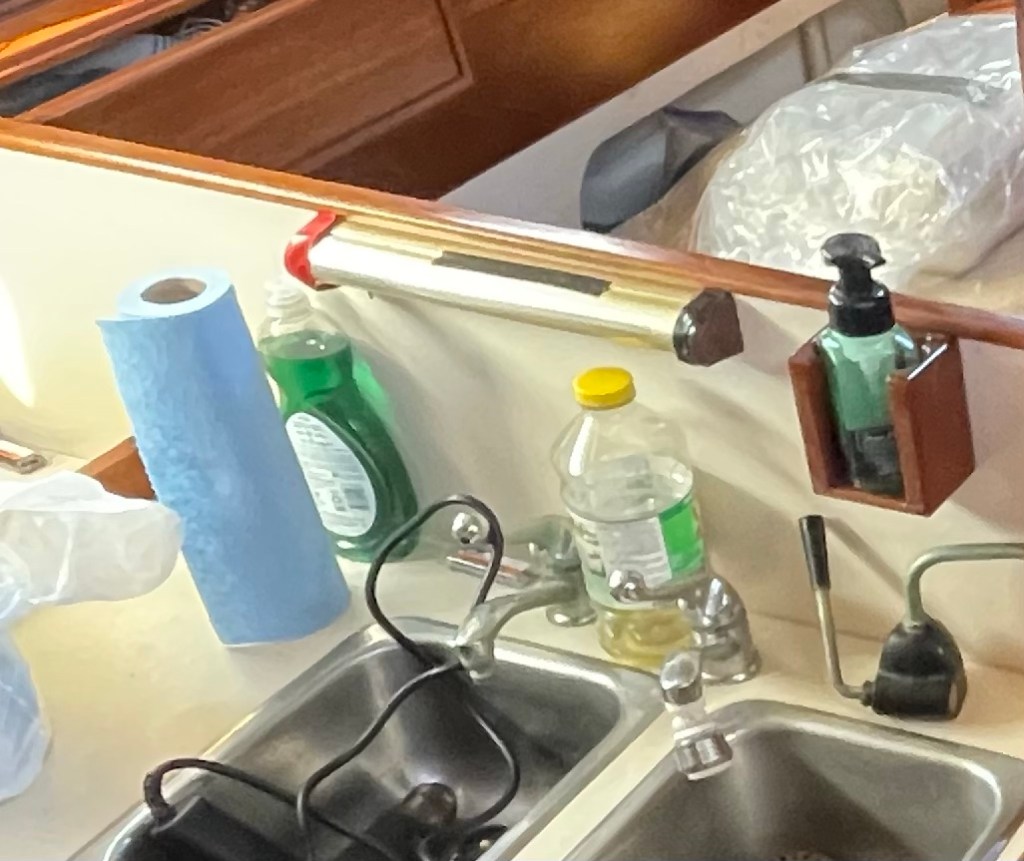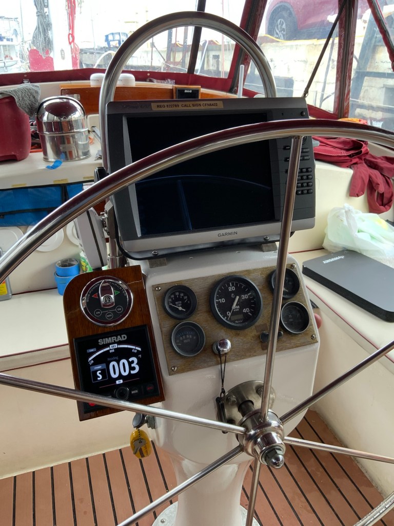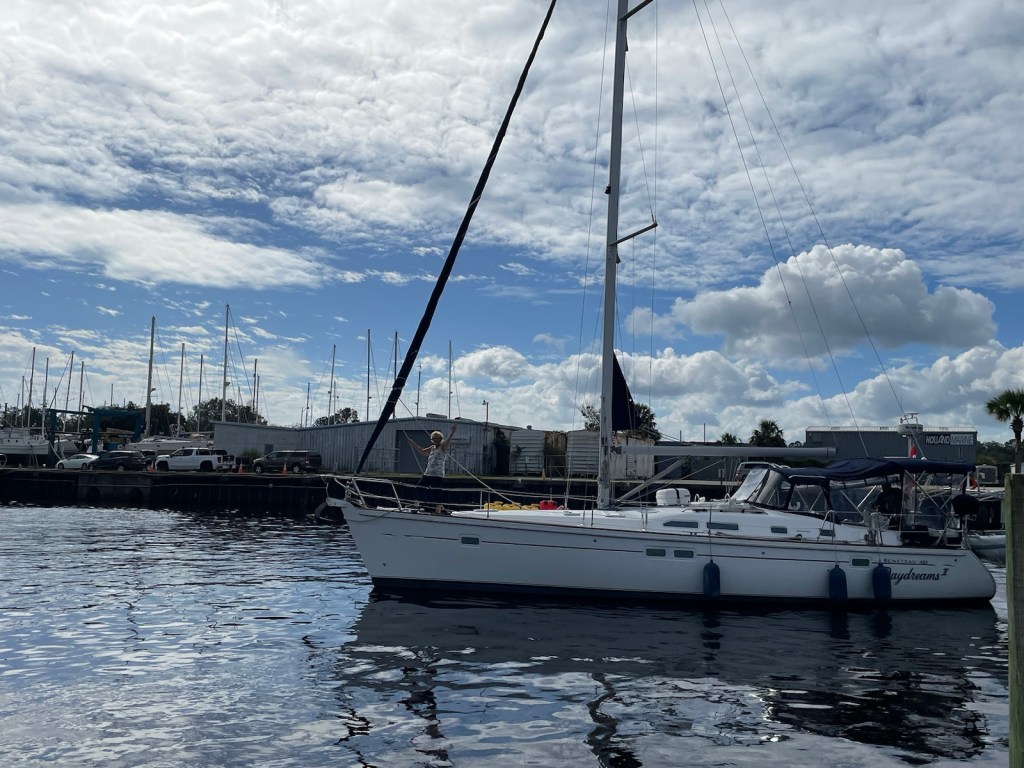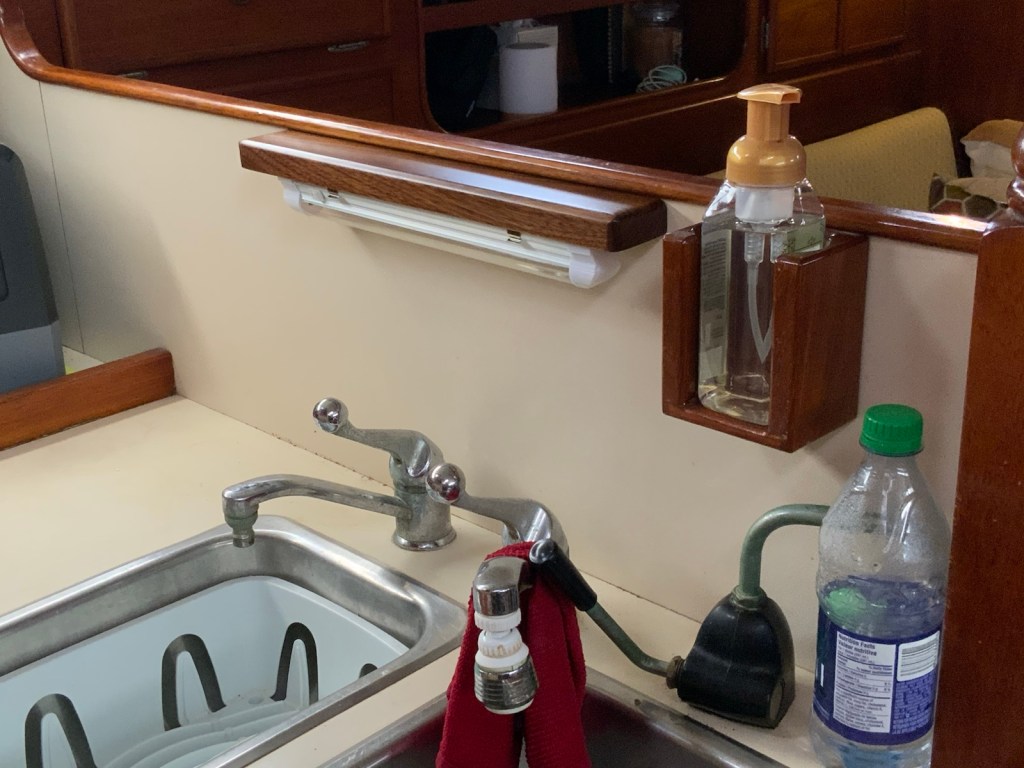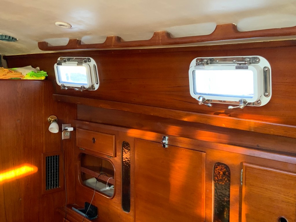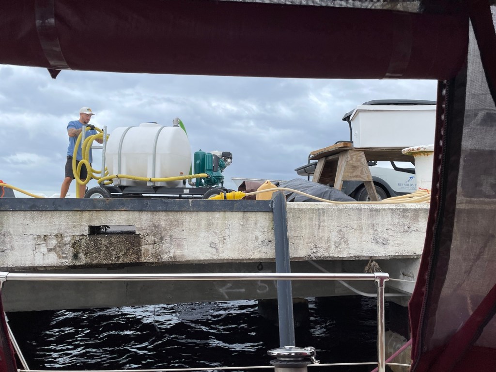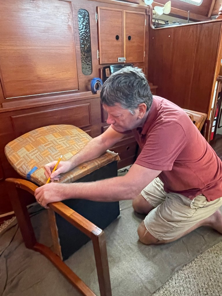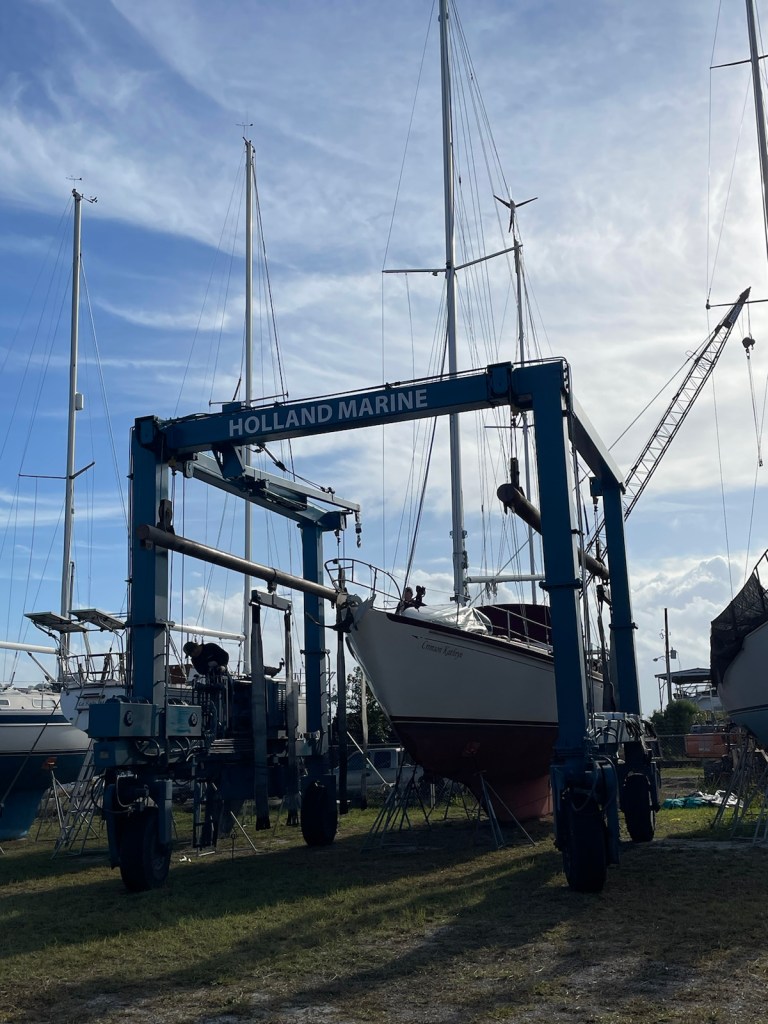 Mark finished the renovation of the chain locker on Monday (Nov. 27). There was a partition in the locker dividing it in half but our new 200ft of chain wouldn’t fit so Mark rearranged the partition. Late in the afternoon we loaded the new chain into the locker – it was a perfect redesign!! After the chain was loaded aboard, we had to bring our 80lb anchor back into position on the bow. We used the windlass to haul the anchor back into position and as it got close to the roller at the bow, the rope broke!! Luckily Mark was holding the second line and as he struggled to hold onto this line, I quickly grabbed the end of that rope. The anchor dropped back into the water and gave Mark a nasty rope burn (removing some skin too). We tied off the line and caught our breath. One of our dock neighbours came over and helped Mark lift the anchor close enough to the bow so I could attached a bigger rope to the anchor. With the new line we were able to get the anchor back on deck and then secured to the chain!!