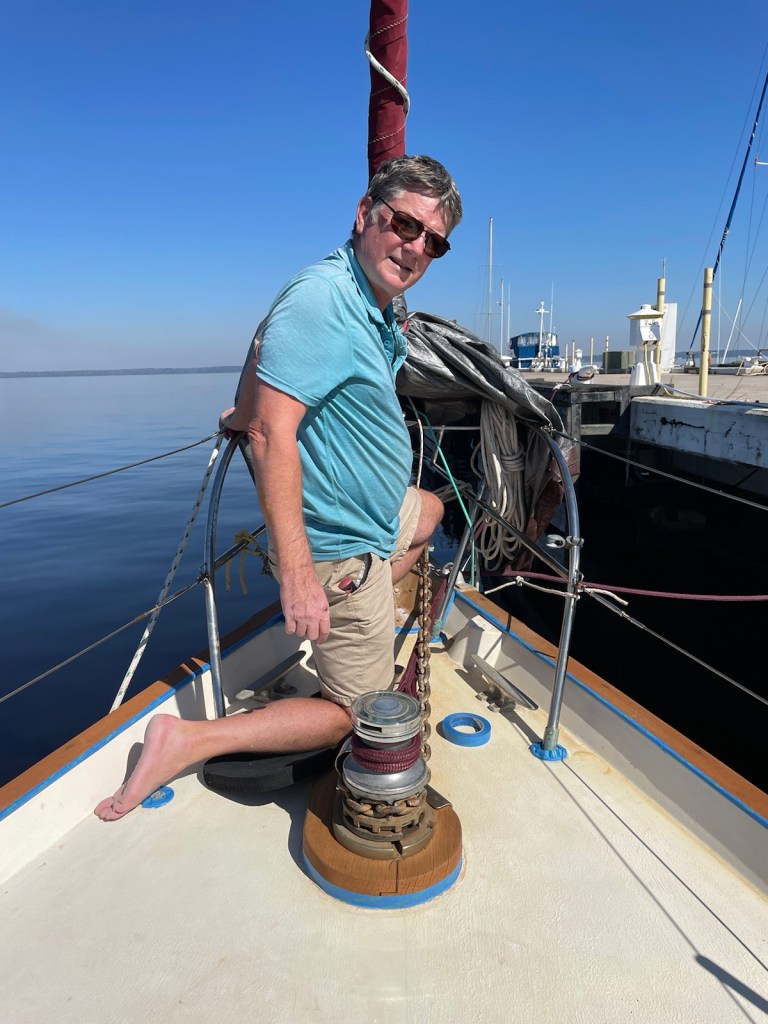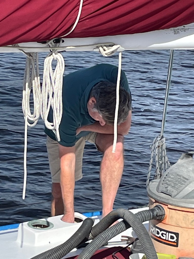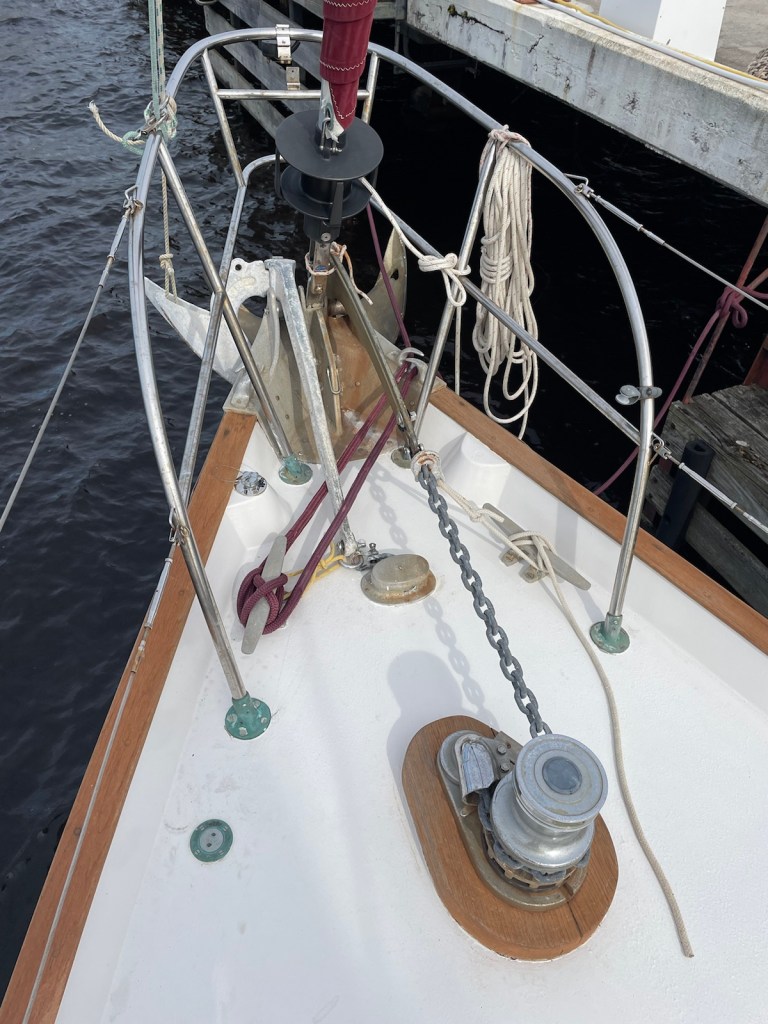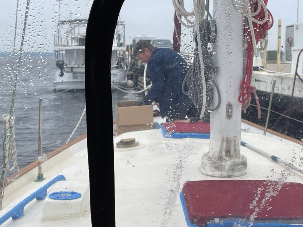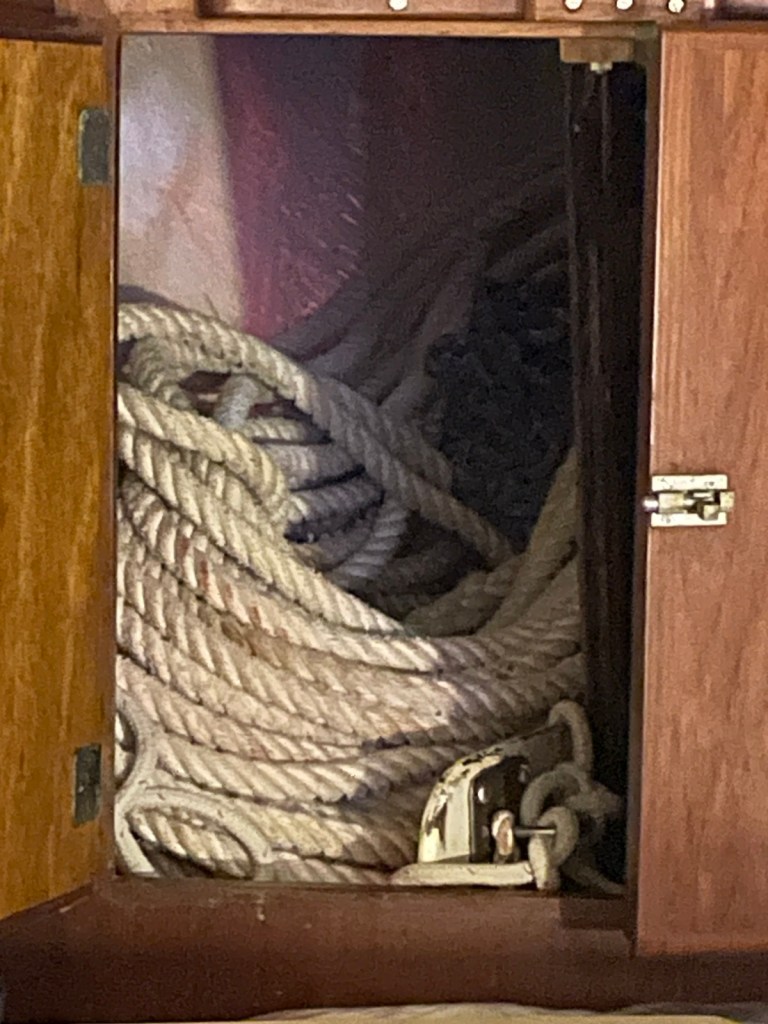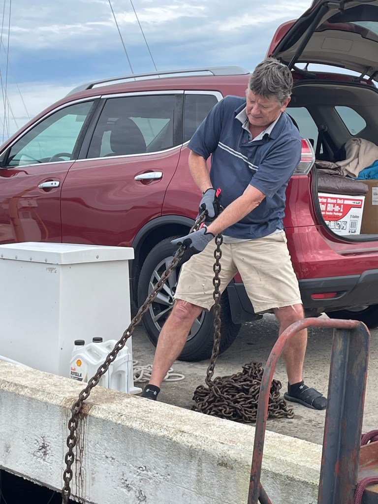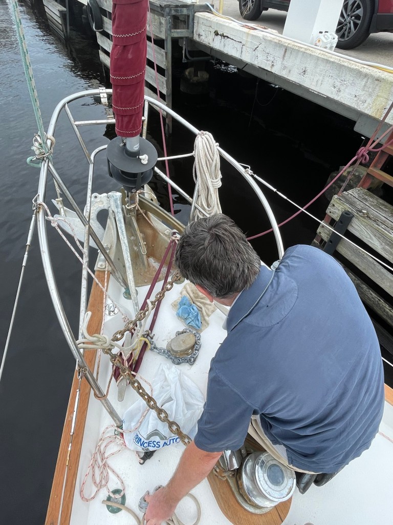 The big job of removing the old anchor chain went very smoothly. Our main anchor was lowered into the water with 2 rope lines and then we used the windlass to transfer the old rusty chain from the locker to the pier. After the chain was removed, we then pulled out the rope anchor line and put it on the pier with the old and new chain. The chain locker needed to be completely empty so Mark could make the necessary changes.
