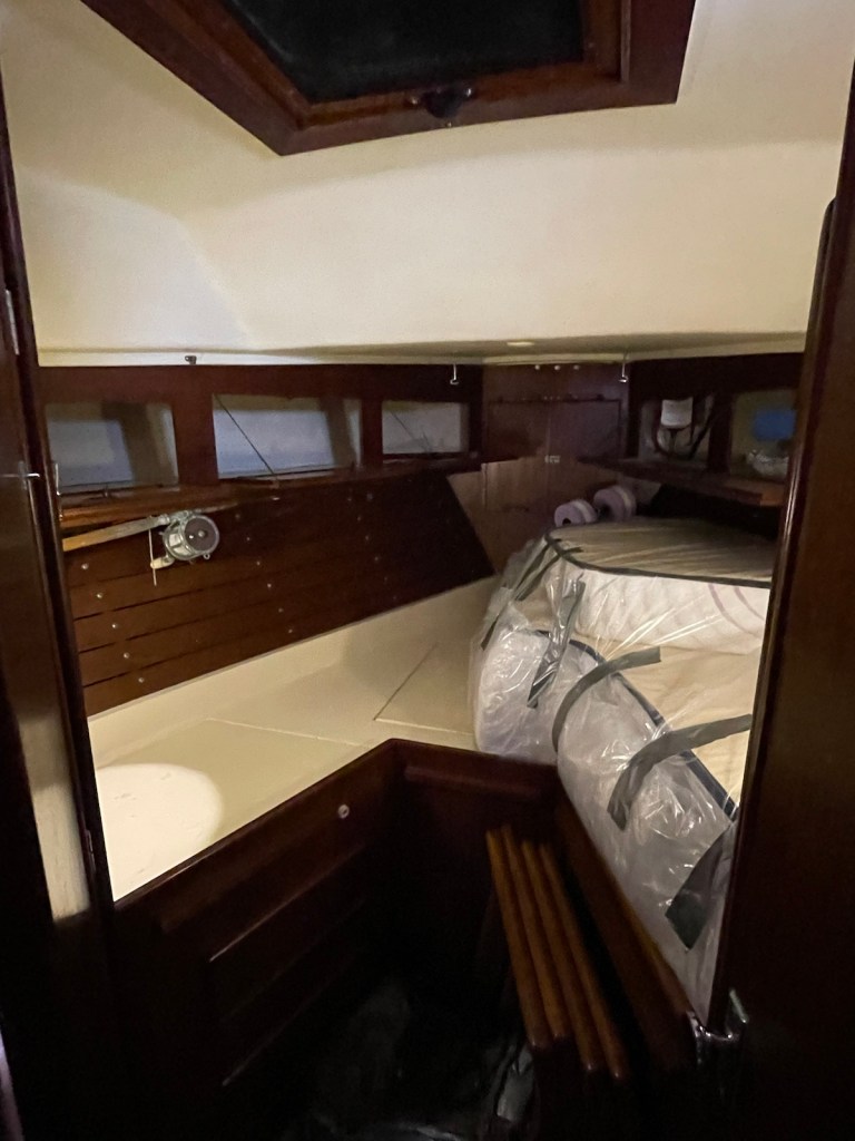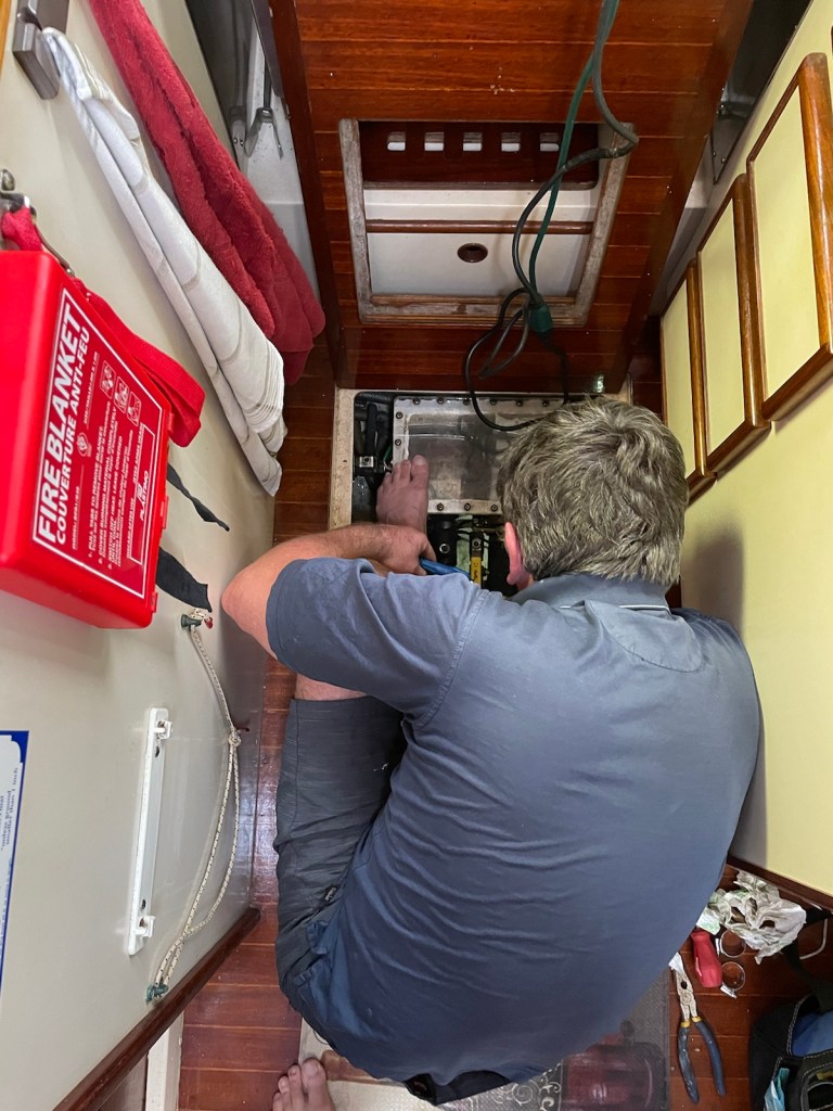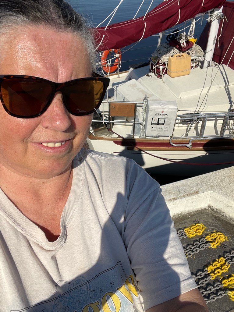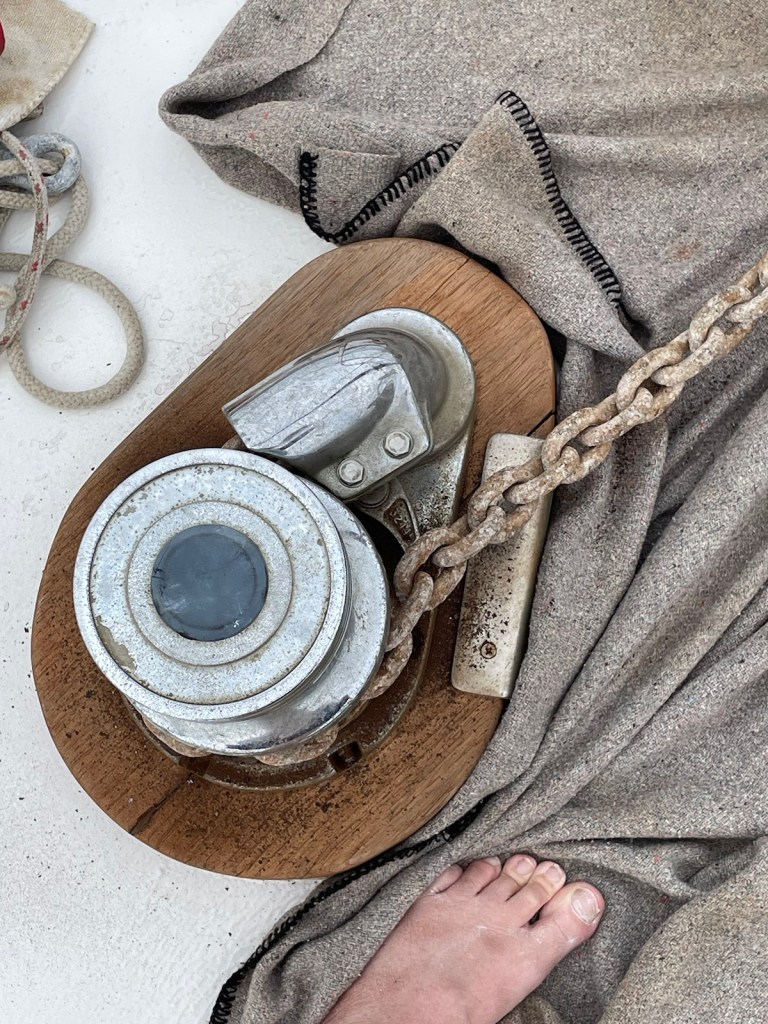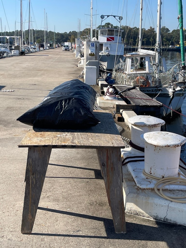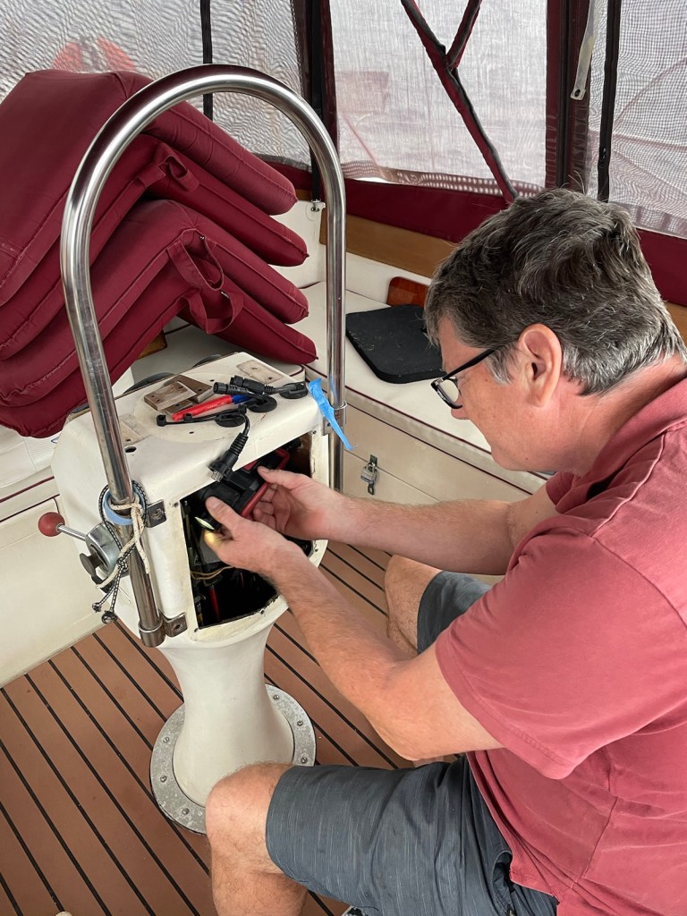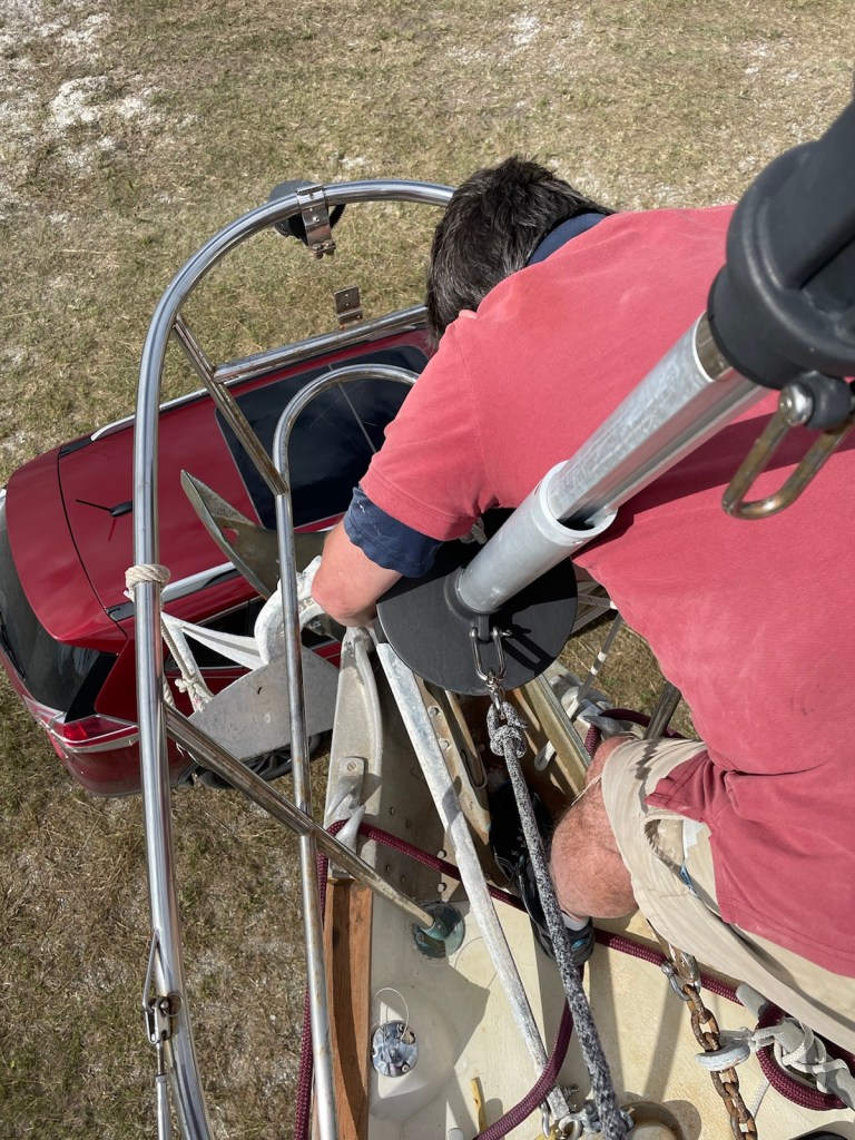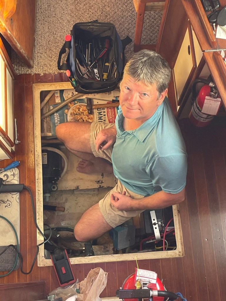 The big job of removing the old anchor chain went very smoothly. Our main anchor was lowered into the water with 2 rope lines and then we used the windlass to transfer the old rusty chain from the locker to the pier. After the chain was removed, we then pulled out the rope anchor line and put it on the pier with the old and new chain. The chain locker needed to be completely empty so Mark could make the necessary changes.
