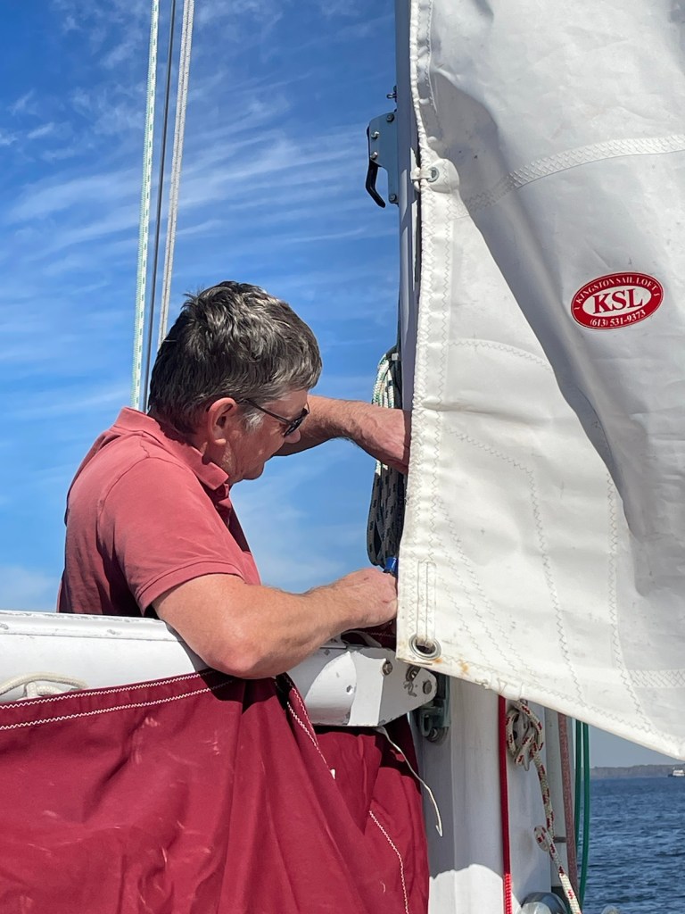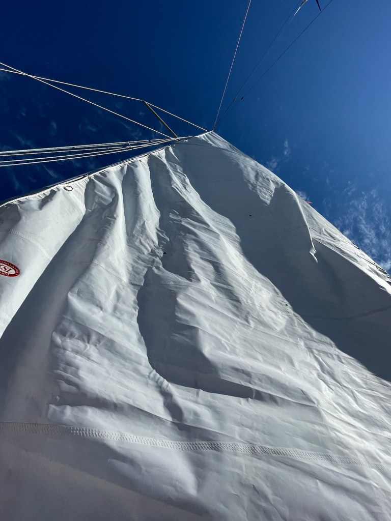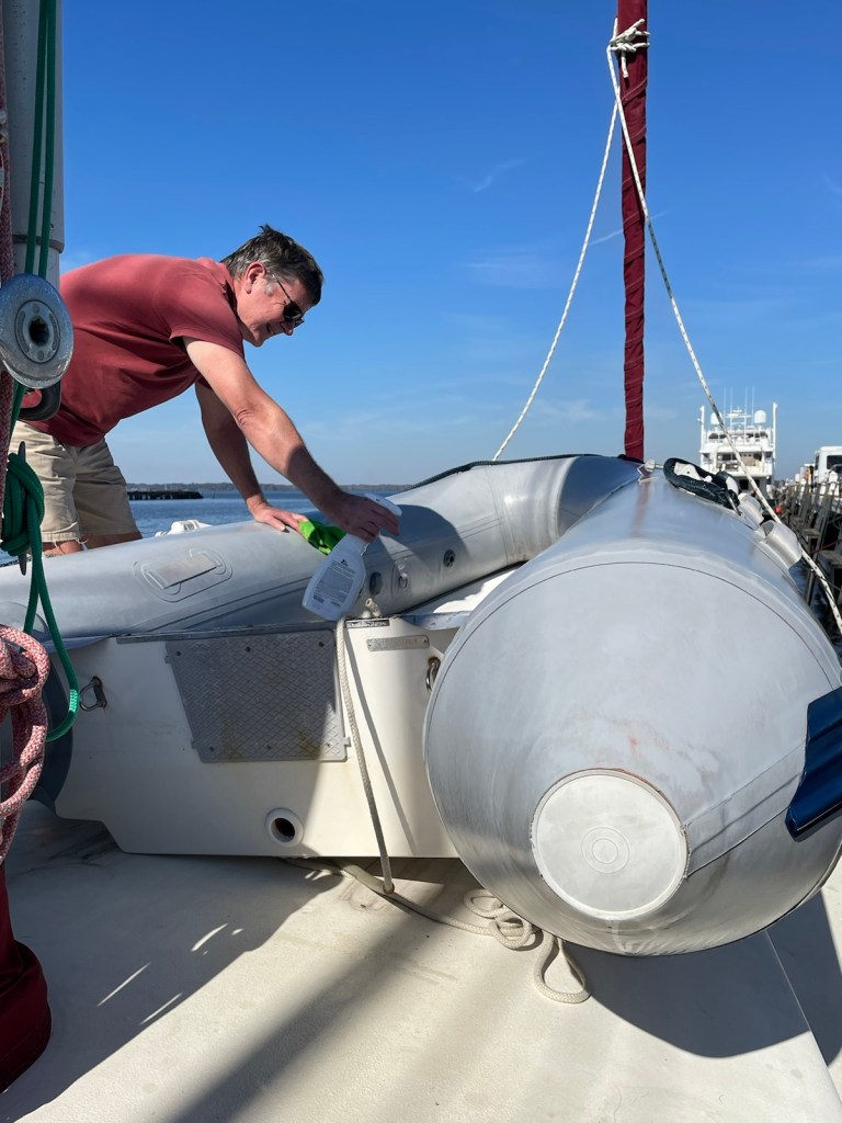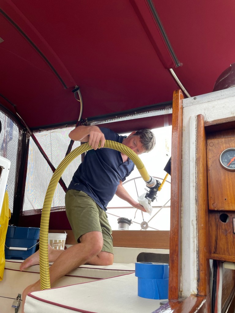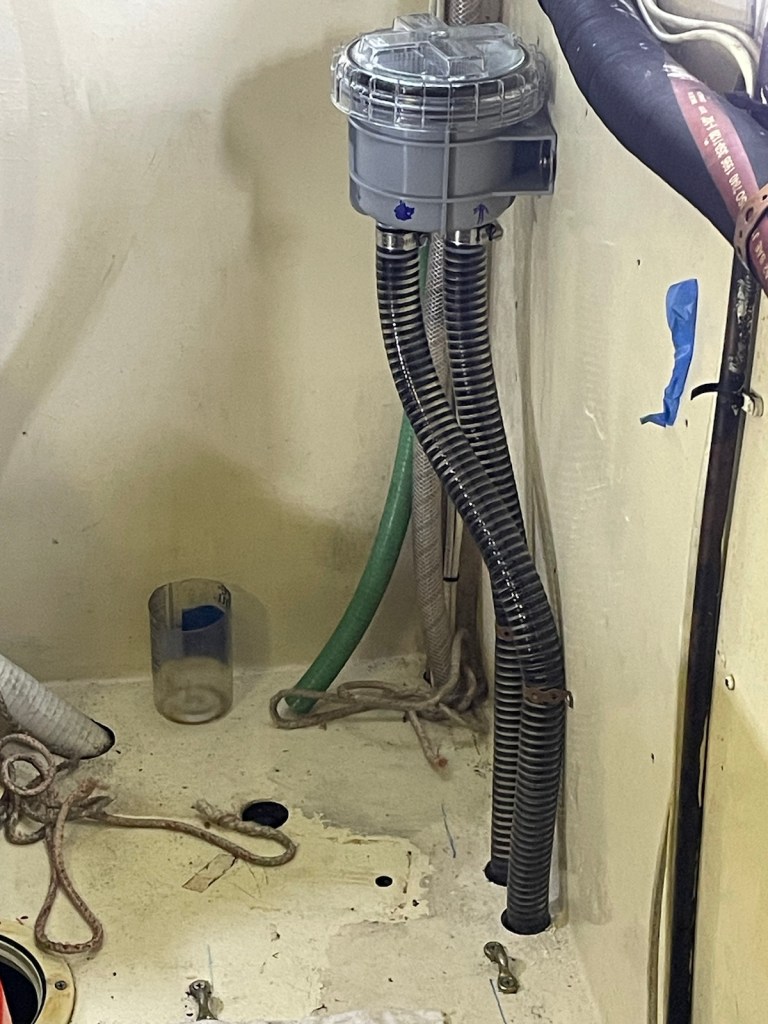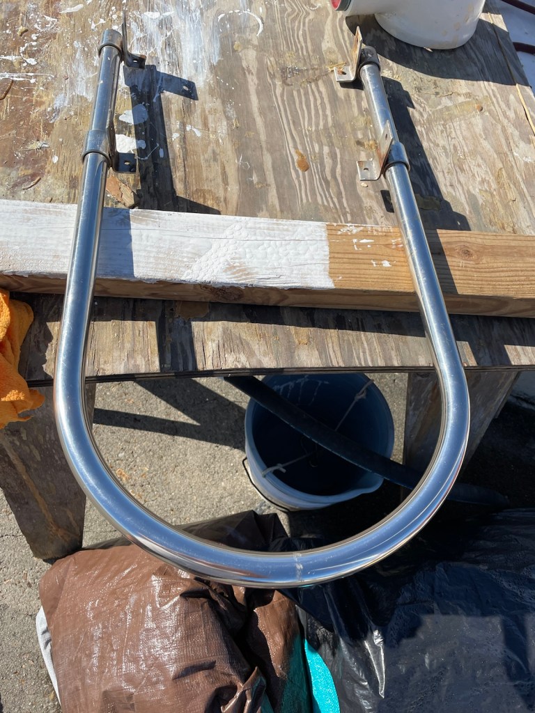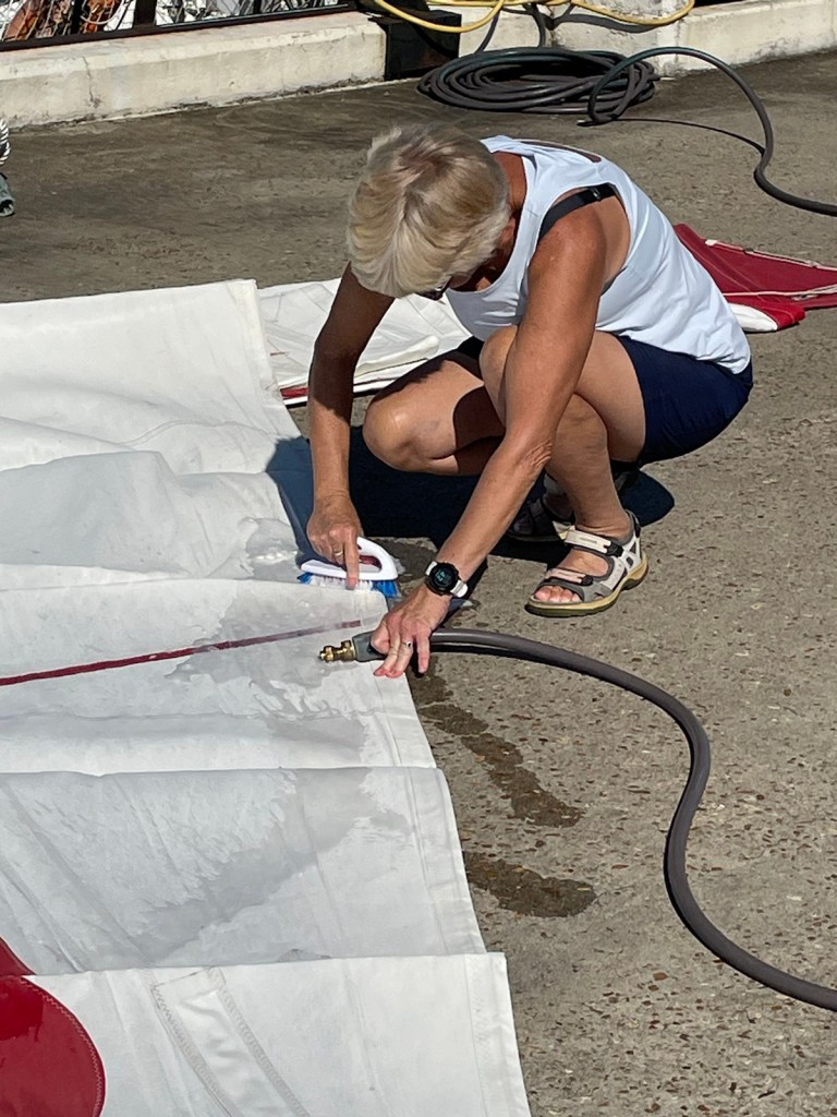 The big job of removing the old anchor chain went very smoothly. Our main anchor was lowered into the water with 2 rope lines and then we used the windlass to transfer the old rusty chain from the locker to the pier. After the chain was removed, we then pulled out the rope anchor line and put it on the pier with the old and new chain. The chain locker needed to be completely empty so Mark could make the necessary changes.