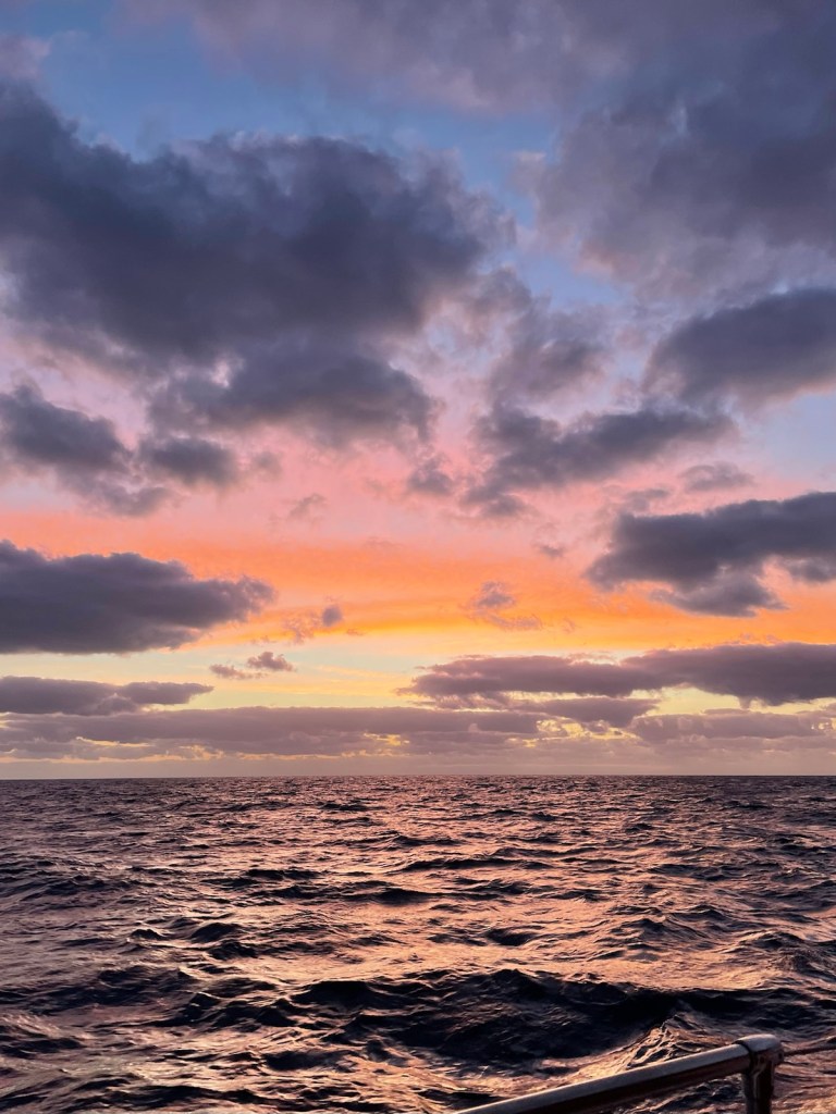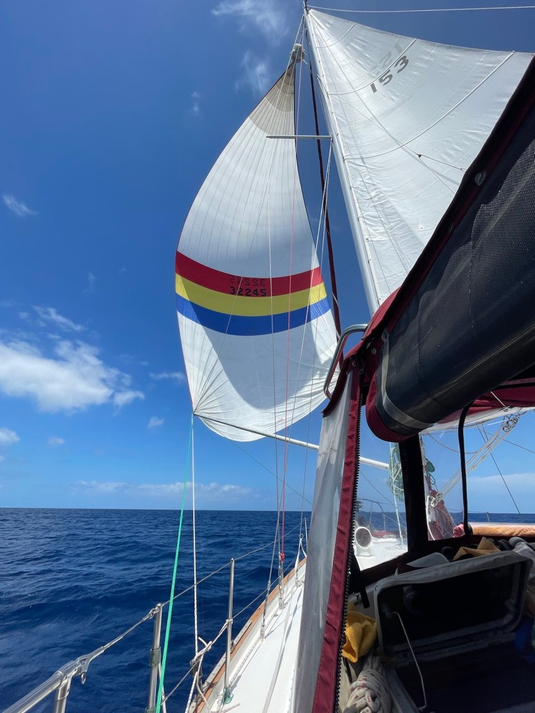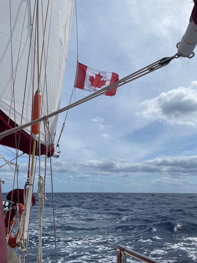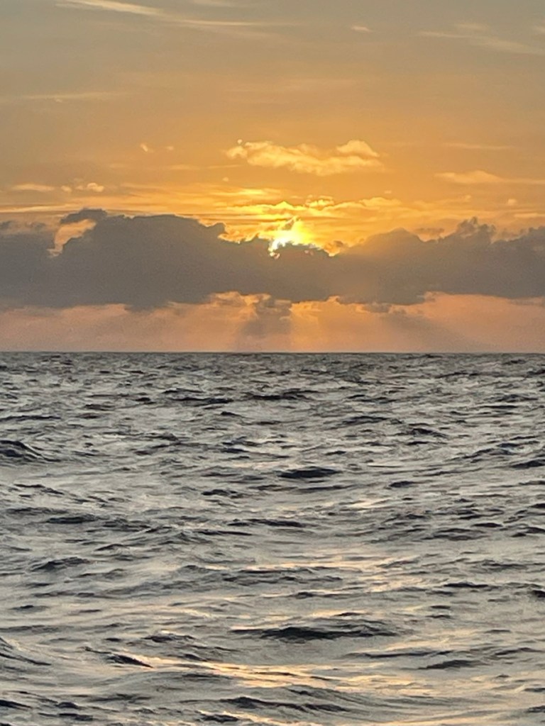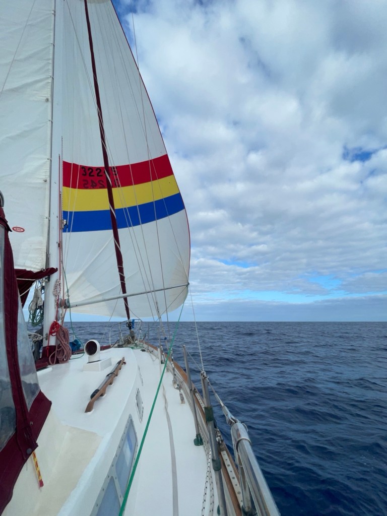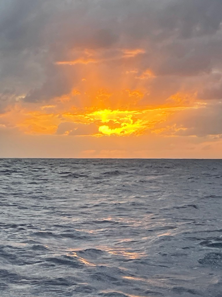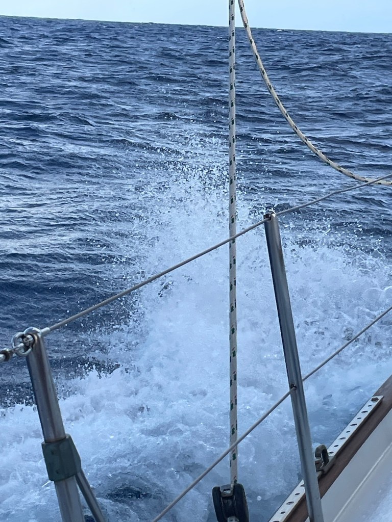 We had great wind speed and a good direction for a long downwind sail. We fairly quickly got into the edge of the Gulf Stream which gave us a bit more speed. As the day progressed, we got deeper into the Gulf Stream and boy did we start to zoom! The wind was still high (17 – 23 knots) but so were the waves (coming mostly behind us). As long as we had the higher wind speeds, we were able to beat the waves and have a fairly easy ride. Unfortunately the wind was not super consistent so it would dip below 15 knots and then the waves would push us around.