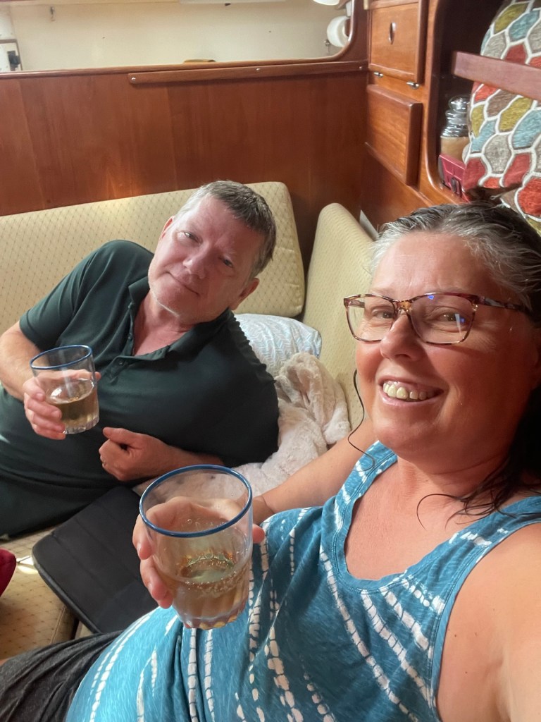 Now we’re back and the summer storage jobs begin! But not tonight – happy hour on Alizarin with great friends!! We’ll get all caught up.