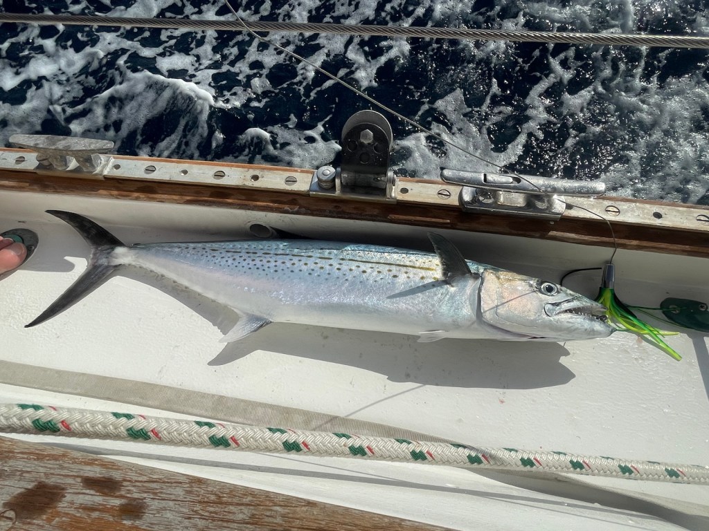 Sunset March 29th Pirates Cove, Provo.Sunrise March 30 leaving T&CIt was a fast ride in the beginning.These birds were diving into the water as bigger fish were jumping out. It was a feeding frenzy.Passing Mayaguana Cay doing 8.2knots under sail only!!Sunset March 30 – end of the first day of sailing north.Spinnaker run on March 31 – a fantastic sail that convinced us to keep going.Sunrise April 1st!It was a bit chilly first thing in the morning.Highbourne Cay cut – April 1st 10 am.Heading across the banks to Nassau, Mark had to fix the spinnaker so we could use it again. It got caught up in the bag (called a sock) that helps to deploy and retrieve the sail.Easy going to the Banks!Hello Nassau – April 1, 4 pm!A well deserved glass of wine (after showers) at the end of 58 hours of continuous sailing!Spinnaker sail north to Ginn Sur Mer, April 2Skipjack tunaSpanish mackerel Fishing success story.Dinner – tuna in Mark’s right hand and mackerel in his left.Rough ride coming into Ginn Sur Mer, 10am April 3.