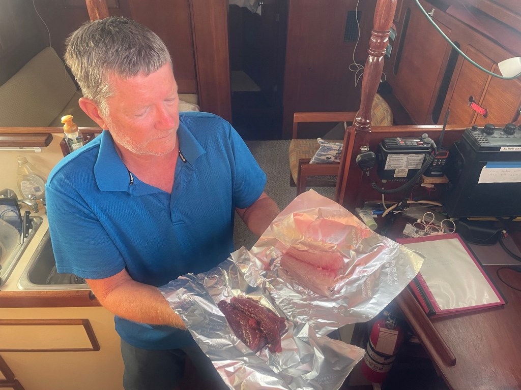 Our next jobs were to take the dinghy to shore, pay for our 2 nights and then head to the lounge for wifi. Using the ROAM app, we cleared into the USA and requested our cruising license for the year. Foreign flagged vessels must have a cruising license to be able to move around the USA. We had trouble getting one last season (expiry date issues) and had to travel on a permit to proceed (which is a royal pain) so we were very nervous about getting one this time around. But no need to worry – our license was approved the next day! After completing all our business and picking up the new lift pump (which arrived very quickly) we went out for dinner!