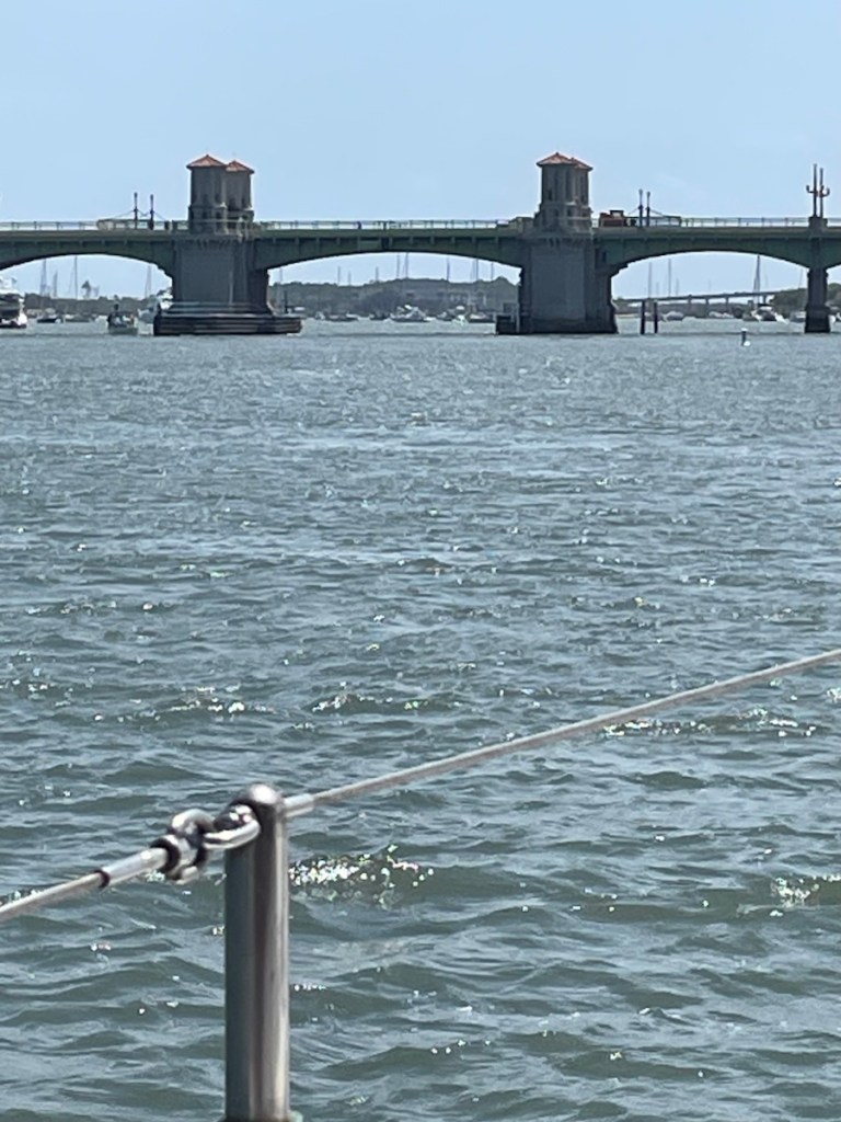 As morning rolled around, we were already out of the Gulf Stream (had been for several hours) and the wind was directly behind and decreasing in speed (just like last year). The last 70nm into St. Augustine dragged on and we finally reached the inlet at about 1:30pm (April 10). Getting in through the inlet was a challenge. The wind picked up from behind (of course when you don’t want it) to about 16knots. Unfortunately we were facing an outgoing tide which meant we had wind against current going into the inlet. This opposition caused the inlet to be super wavy and it dropped our speed down to 2.8knots!! It seemed to take forever to get through the inlet into the smoother waters of the Matanzas River, but we finally got there! We just missed the 2pm Bridge of Lions opening but got the 2:30 and were secured to our mooring ball at St. Augustine Municipal marina before 3pm.