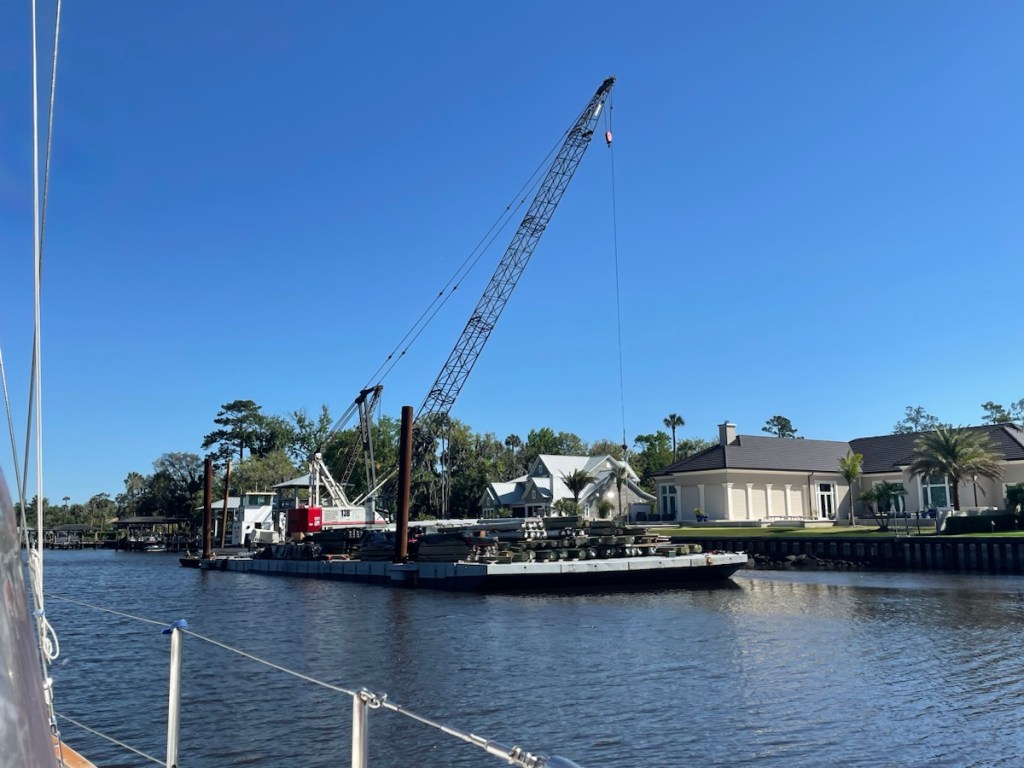 Early Friday morning (April 12), we were up and getting ready to catch the 7am opening for the Bridge of Lions. We were one of many boats heading north – it was quite the parade. We had a nice sunny day but the winds were much higher than expected and our progress up the ICW was slow. We were passed by several powerboats but we kept plugging away at the distance and eventually made it to our destination, Exchange Island, Jacksonville, by 4pm. It was a good night and we even got to see a fireworks display!!