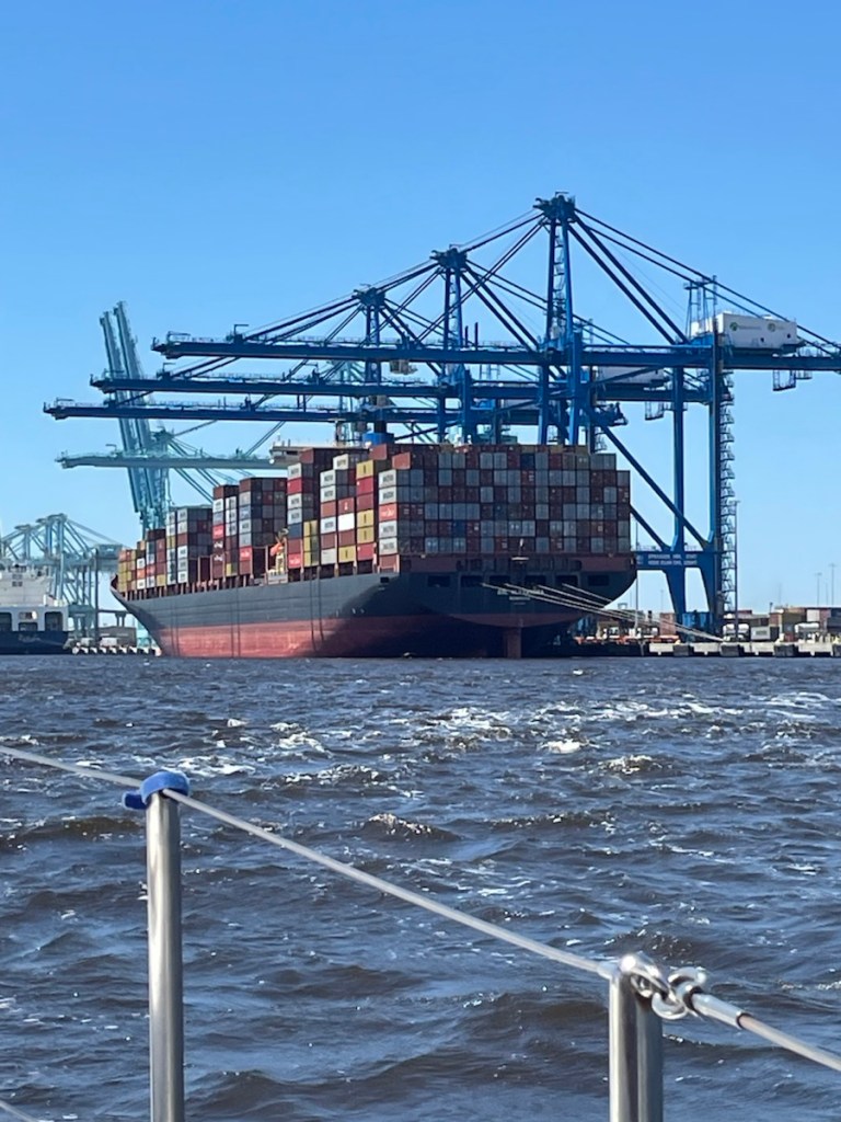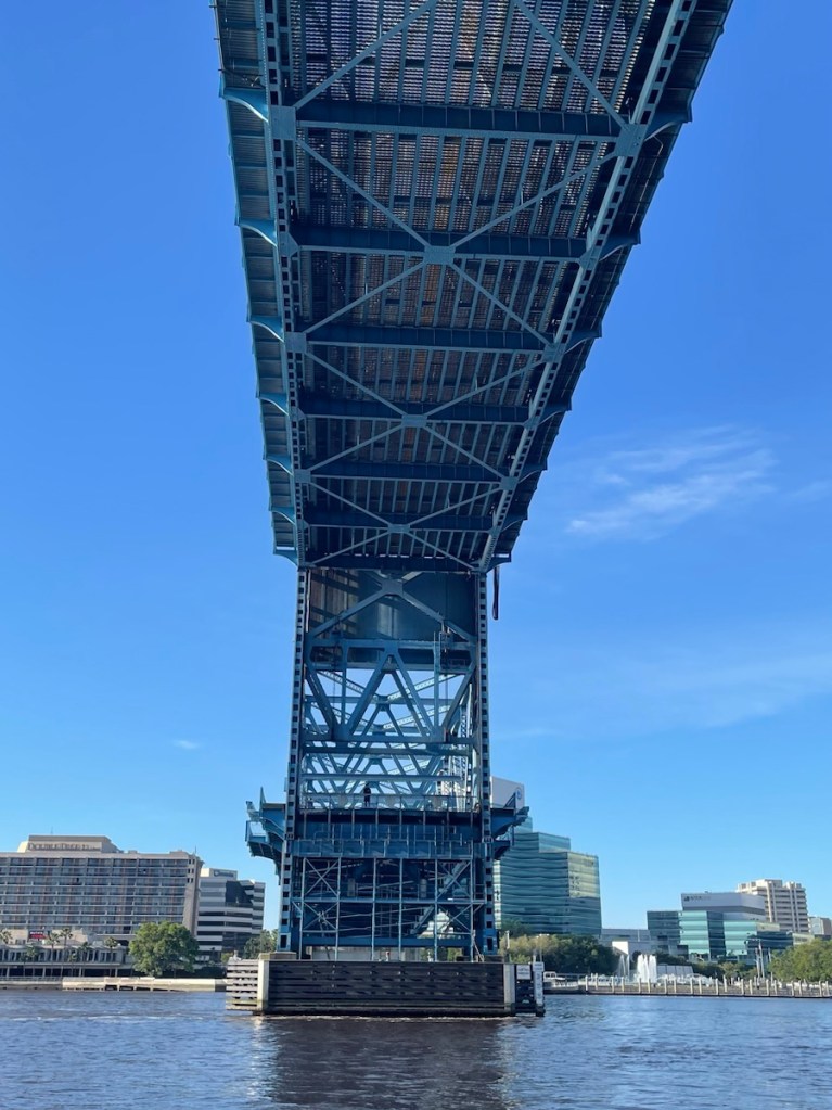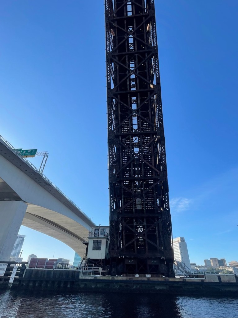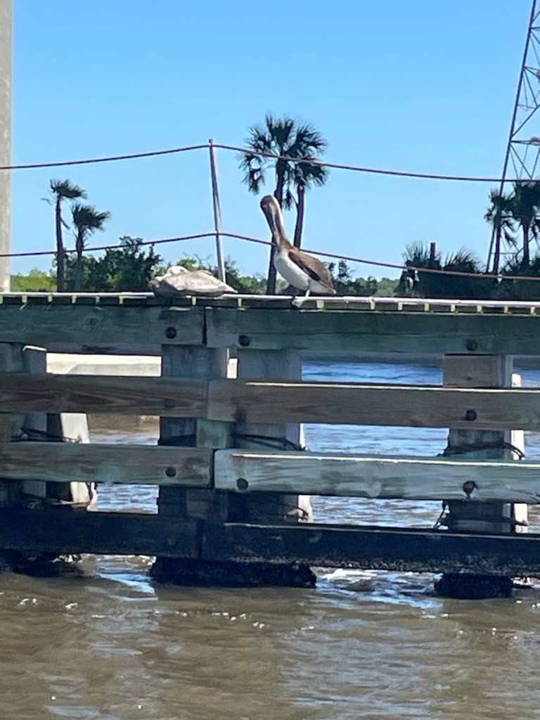 Sunrise on the ocean April 9th.It was an early morning! Saw a few of these guys heading to the Bahamas.One of our higher speeds in the Gulf Stream. We did reach 12.3 at one point.Lots of wind kept our flag flying.Sunrise April 10th – still on the ocean.Lots of wave action coming in the St. Augustine inlet.Bridge of Lions – we’re back.April 12 – ICW leaving St Augustine and heading north.Two tugs rafted together.Still on the ICW heading to Jacksonville.Pelicans resting on the bridge fender system.St. John’s River around 12pm April 12.Several container ships in port.April 13 – last 23nm to Reynolds Park.Main Street Railway Fuller WarnerBuckmanTired of the same photos so here are some interesting shots of some of the bridges we went under on April 13.Almost back! Passing the navy base south of Jacksonville.Home sweet boat home.