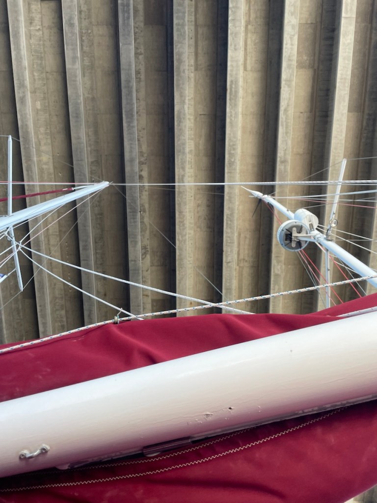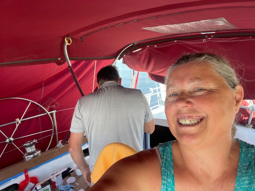 Sunday was the full day of jobs! With the help of Rick, Mark went up the mizzen mast and tied up the wind generator for storage. We don’t need the wind generated power while on the hard so it’s safer to secure it with a few ropes. Once that job was completed, we did a bit of grocery shopping. We returned after lunch, put the groceries away and started back to work. You might not remember this but in the fall we chose to leave the last bit of deck painting to our return so now we have to finish that job. All that’s left is around and inside the cockpit. I emptied the cockpit of all cushions and other items and then hosed down the entire boat (as well as inside the cockpit). While I was washing the boat, Mark was dealing with the spinnaker and other ropes that needed a bit of a rinse. After these jobs were done, we went to the lounge for some air conditioning and relaxation. We met Brad there – he was watching golf so we had a little visit.