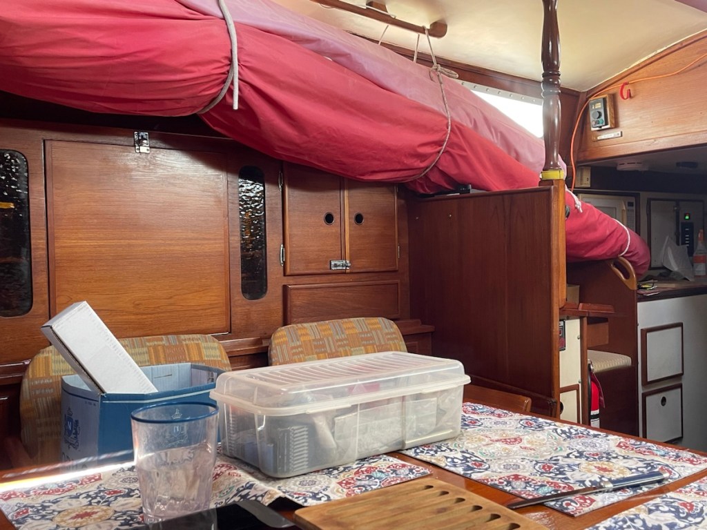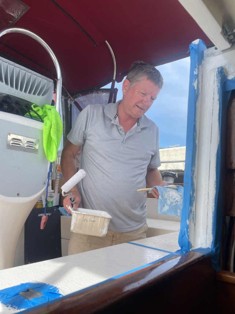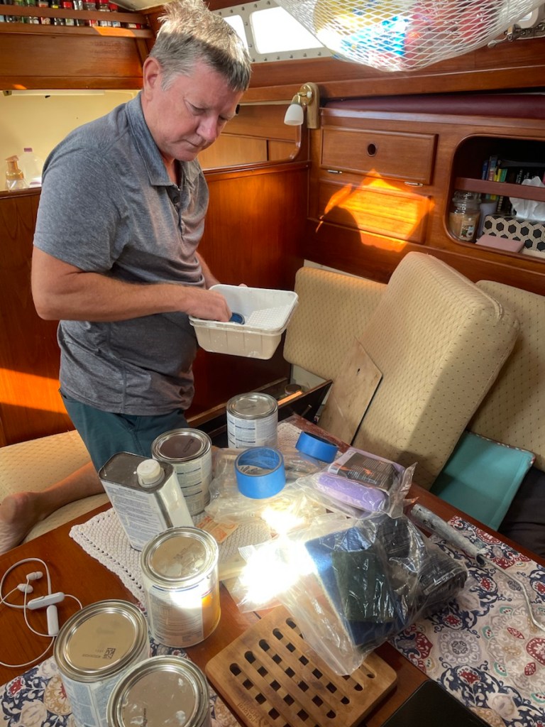 The joys of painting!Still painting – we put up a shade canvas so we could work more comfortably. Temps reached 34 degrees for the last 3 days of this job!!BeforeAfterCockpit paint job.Looks amazing.V-berth is filling up.Mark is working on the fuel transfer pump and its clogged filter.Pretty disgusting but not the solution to our problem. Main cabin is washed and had the vinegar treatment.We’re replacing our main cabin cushions this summer! Need photos and measurements so we can have them made in Kingston.