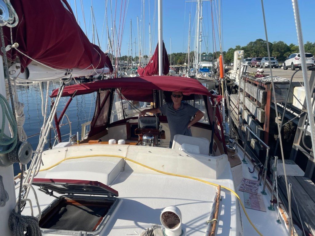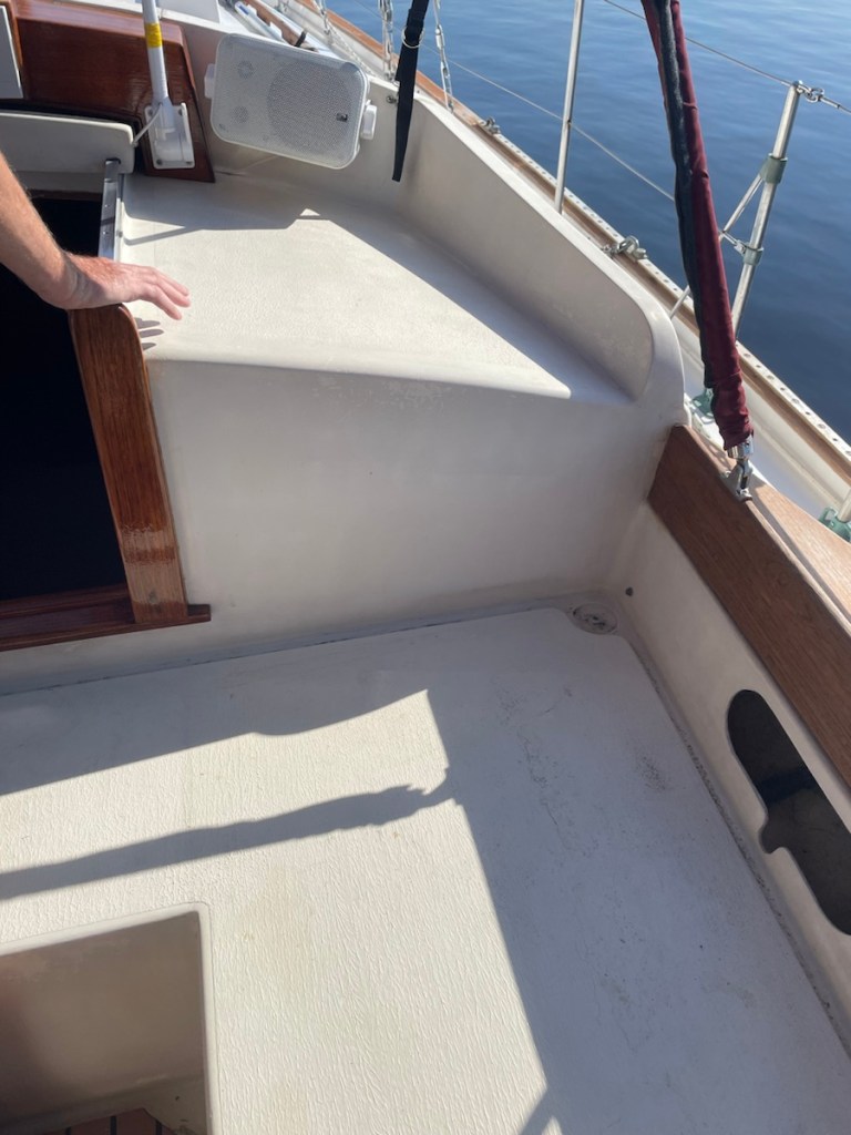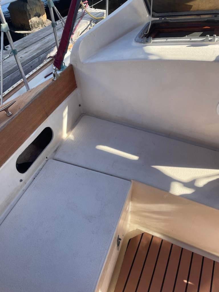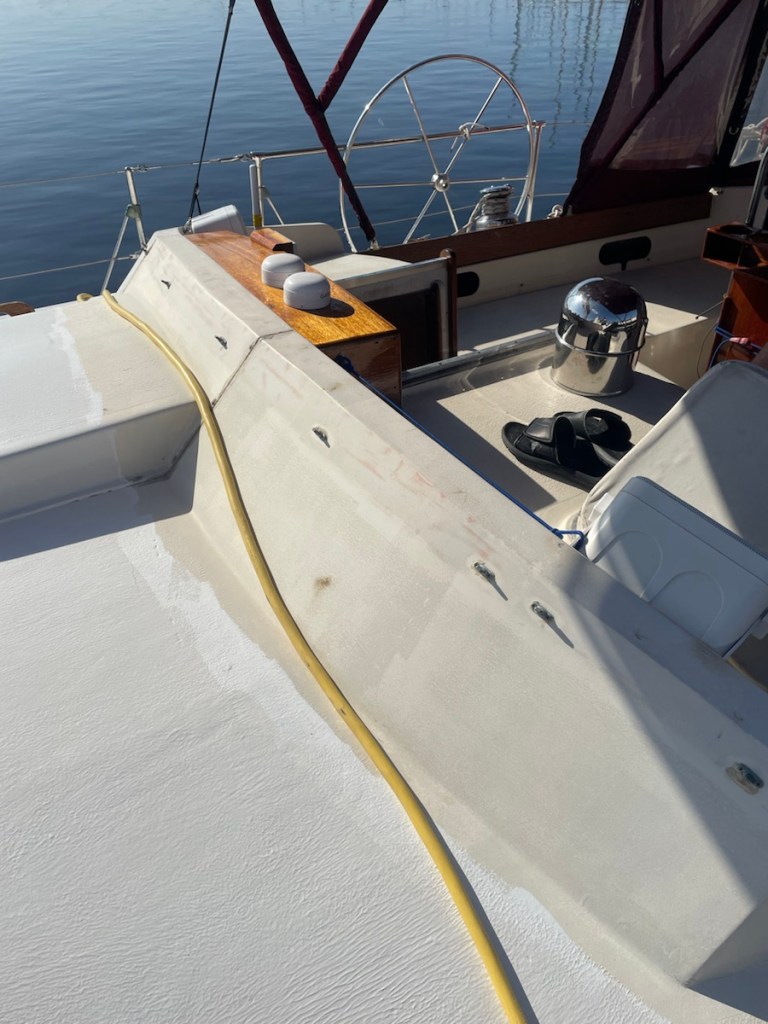 Crimson Kathryn coming into the pier. Thanks Julia for the great photo.Time to pull out all the painting supplies.Clean those cushions!Cockpit getting prepped for a nice paint job.Almost time to paint – taping still needs to be done.