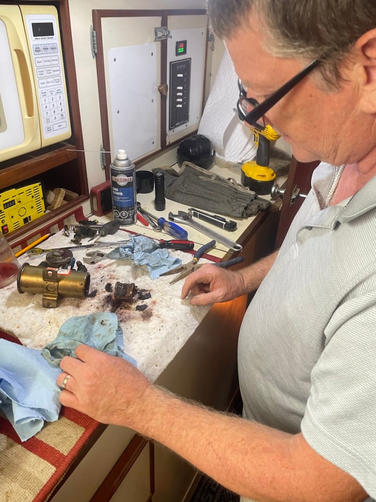 Mark has been working on the fuel pressure problem. He took apart the fuel transfer pump and found a completely clogged filter. That must be the culprit!! Off to Napa to get a new filter but he had to order it. The filter arrived on Saturday (April 20) and Mark installed it that afternoon. It took until today for us to test the engine and unfortunately the new filter didn’t fix the problem. Back to the drawing board as they say!