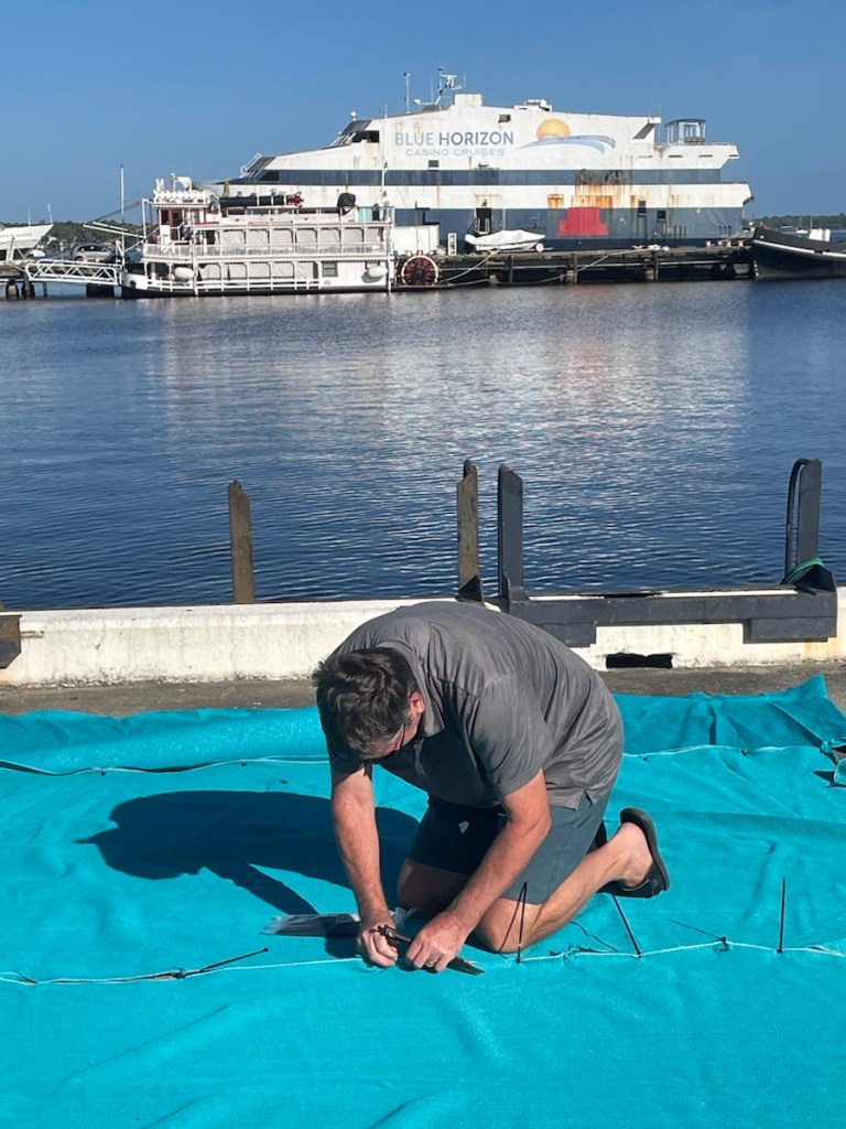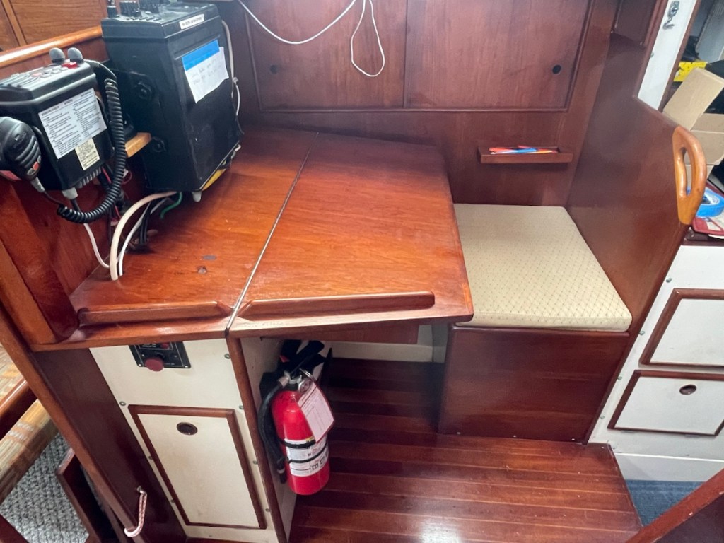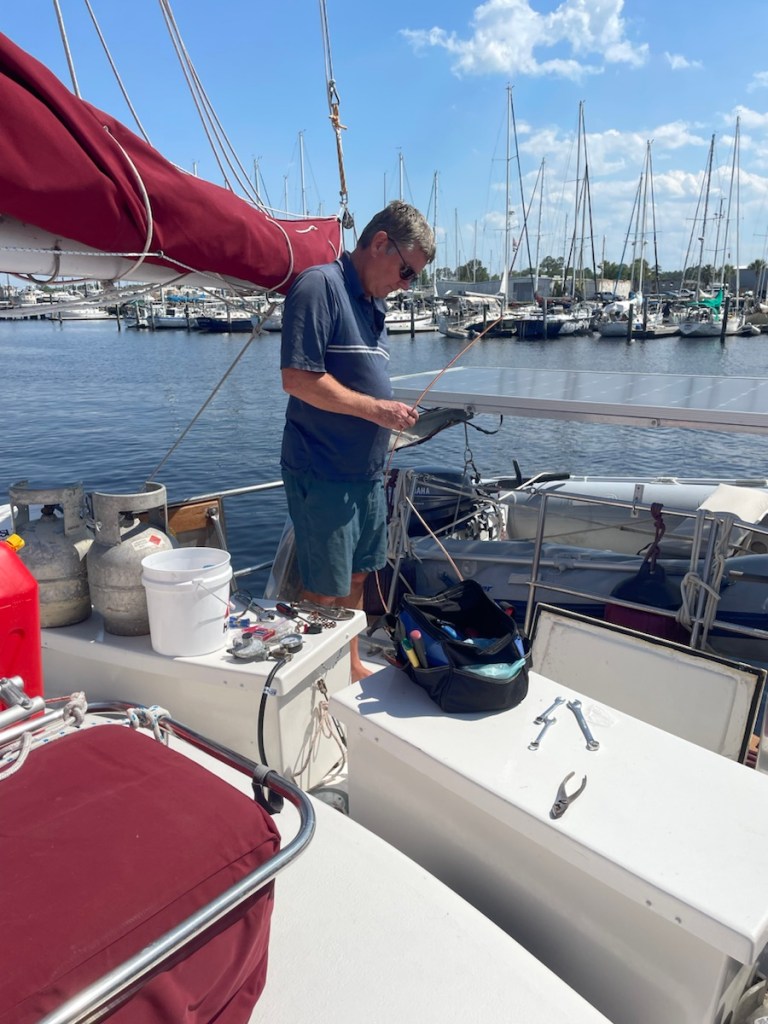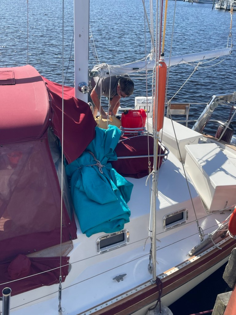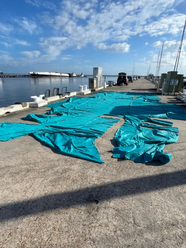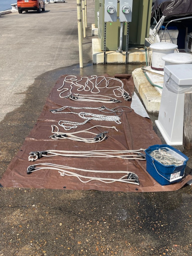 Jib sail is drying in the wind after being hosed down.Main and mizzen are also drying in the wind.I’m working on deck removing all lines that need to be washed.Mark is repairing a copper pipe for our propane system.All these lines need to be washed to remove the salt from our seasonThe nav station never looks this clean unless it’s the end of the season and it needs to be washed!Dried sails are now stored inside.We worked on our sun shade one morning – good thing we’re on the pier and we have lots of room.We use zip ties to “sew” the sun shade together.Sun shade is now stored on deck and is ready to be put in place once we are on the hard.