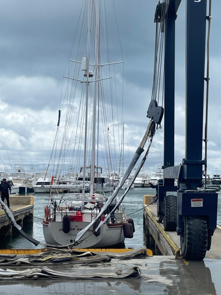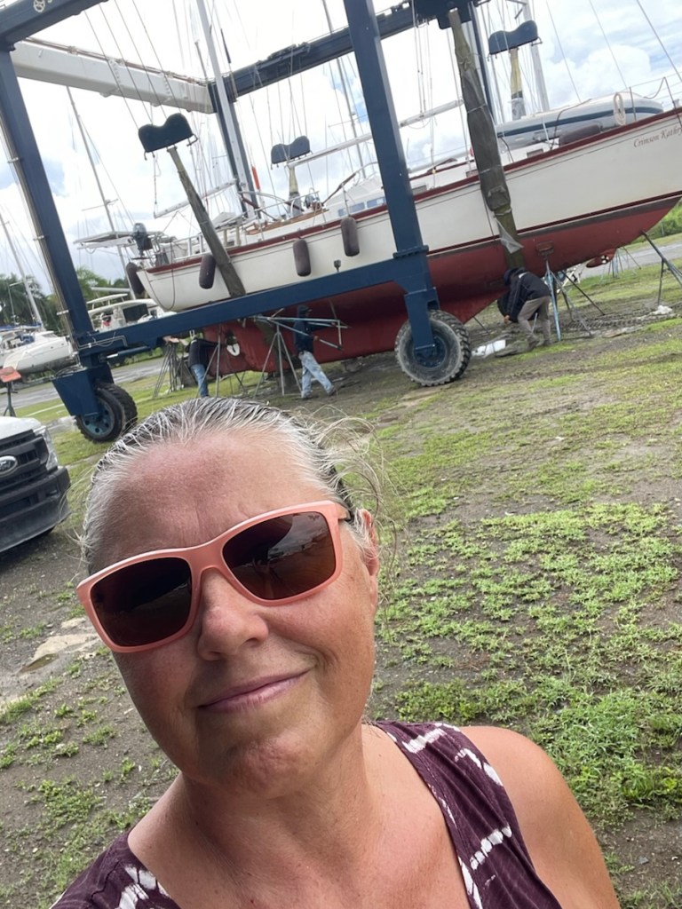 Our haul out (May 1st) went very smoothly. You definitely get what you pay for!! The haul out crew were professional and took their time lining up the boat into the slings of a rather large travel lift. It was a bit nerve racking to watch the boat being moved back and forth, with us wondering if these guys really knew what they were doing!! But once the boat was in the slings and out of the water, we could relax because she was perfectly aligned and resting nicely above the ground. It’s been raining like crazy here so the storage yard was a muddy mess. The travel lift bounced its way to our spot and again with great care, the crew got CK into position. Our boat caretaker, Sam, was on hand to help with levelling of the boat. We’ve never had someone go on deck with a bucket of water to make sure the decks were draining properly. It took a bit of time but well worth it to make sure water won’t be pooling in all the wrong places. Once Sam was satisfied with the level, the crew blocked the boat and removed the slings. Sam spent the next hour (or so) strapping down CK. Sam used 8 straps (instead of the usual 4 we’ve been doing in Florida) because we are definitely in a more hurricane prone spot.