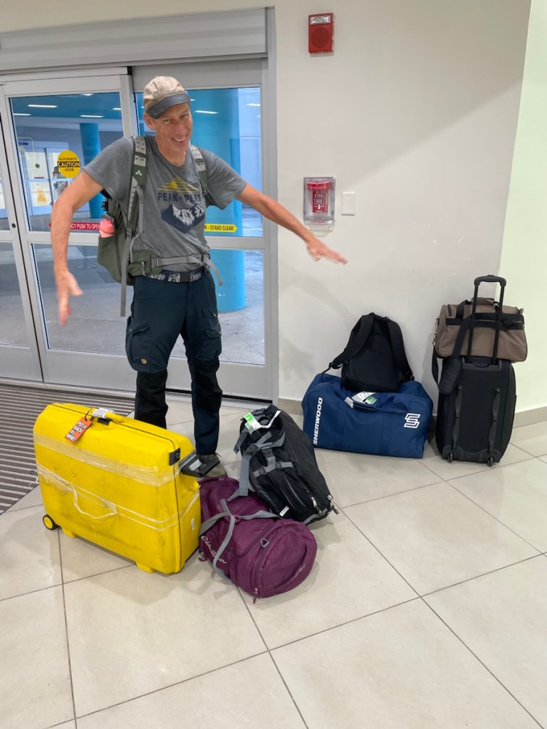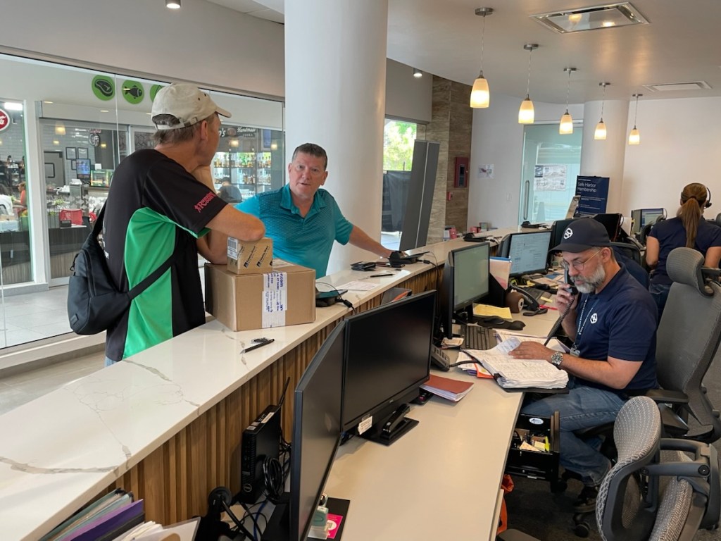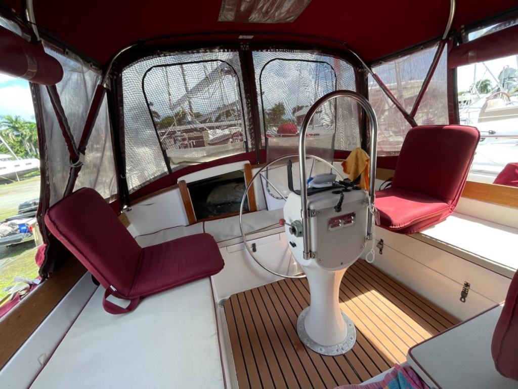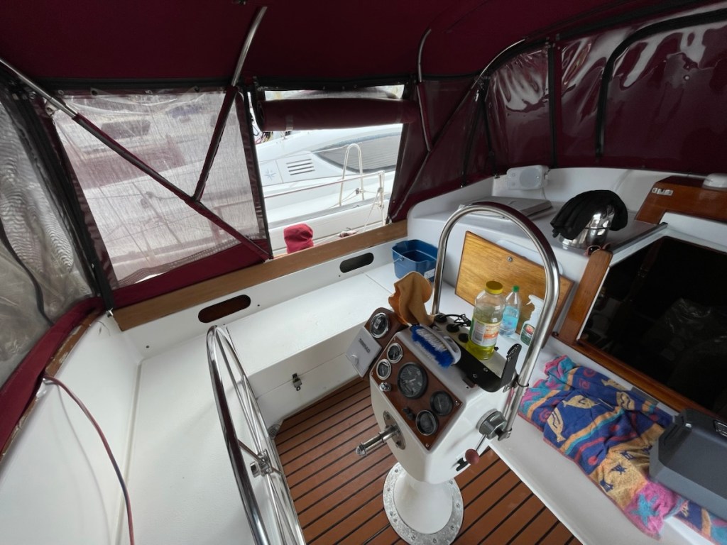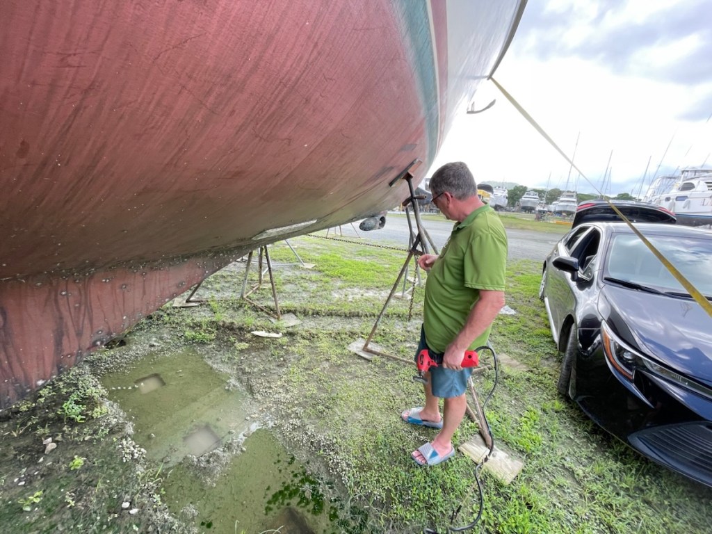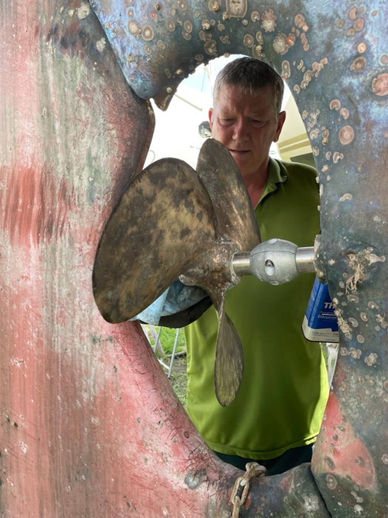 Tuesday morning we made a few shopping stops before heading to the boat (looking for items we needed for the day). Mark spent the day scrapping barnacles off the bottom of the boat, cleaning the 2 bronze plates on the hull, changing zincs and cleaning and spraying the propeller with an anti-fouling paint to help protect it from ocean growth (I’m sure there are more jobs). I spent the day waterproofing the enclosure top (called a bimini), washing and organizing the aft cabin, and setting up the cockpit.
