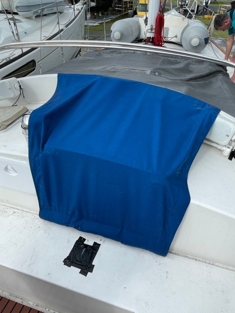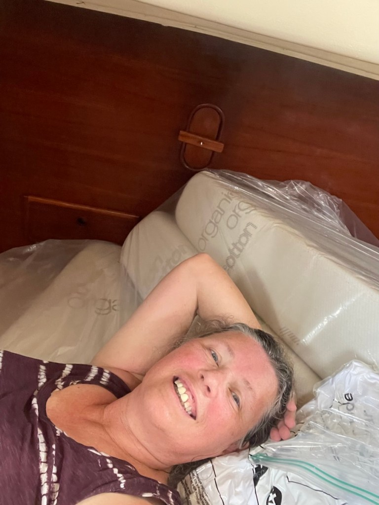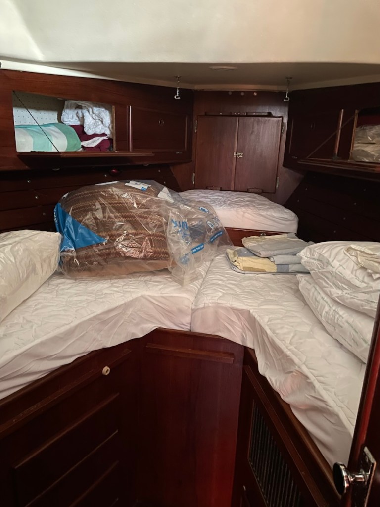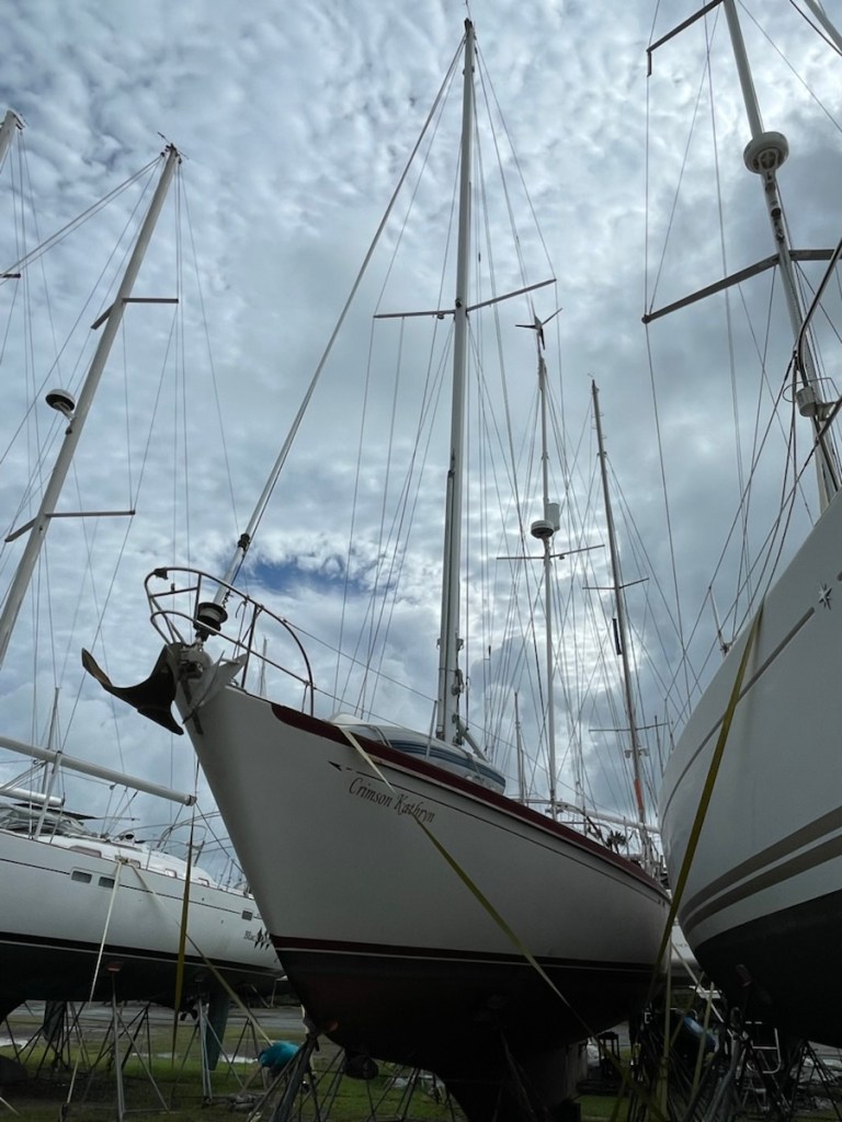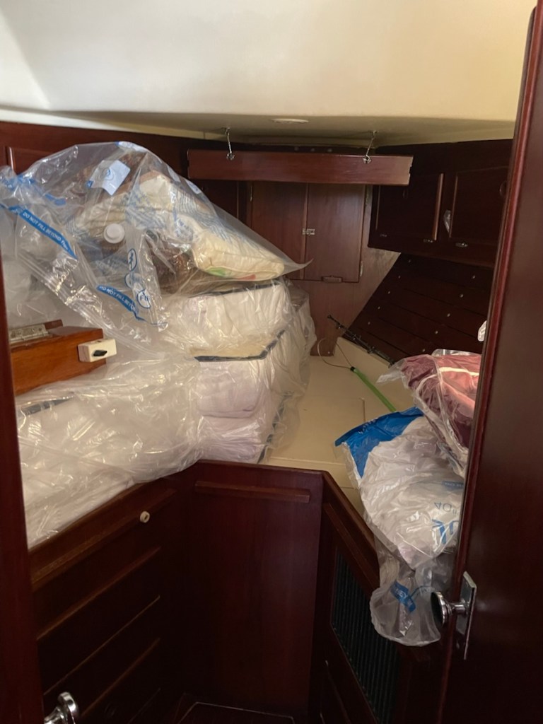 After lunch Mark started his last out of the water job – attaching chain plates for our drogue – it’s like a water parachute that is deployed at the stern if you get into some serious weather. I went to work on the V-berth – emptying it, washing it and setting it up for John. I got halfway through the job and I went back into the main cabin to rest (while the area dried). It felt so cool in the main cabin that I figured the temperature had dropped. Nope! It was 33 degrees in the cabin so it must have been close to 40 in the V-berth! That’s way too not for me!! Even with the heat, I completed all my before launch jobs and Mark is very close to being done with his jobs.