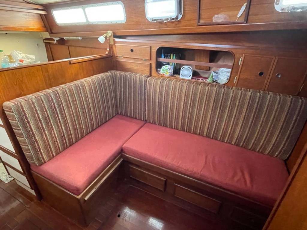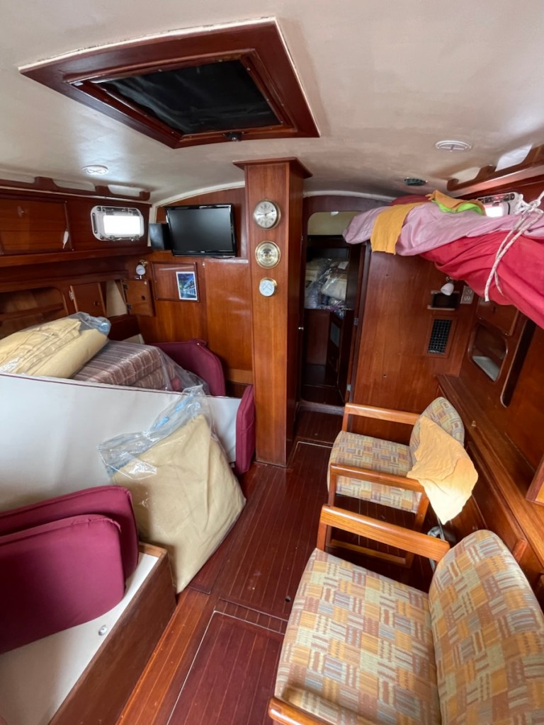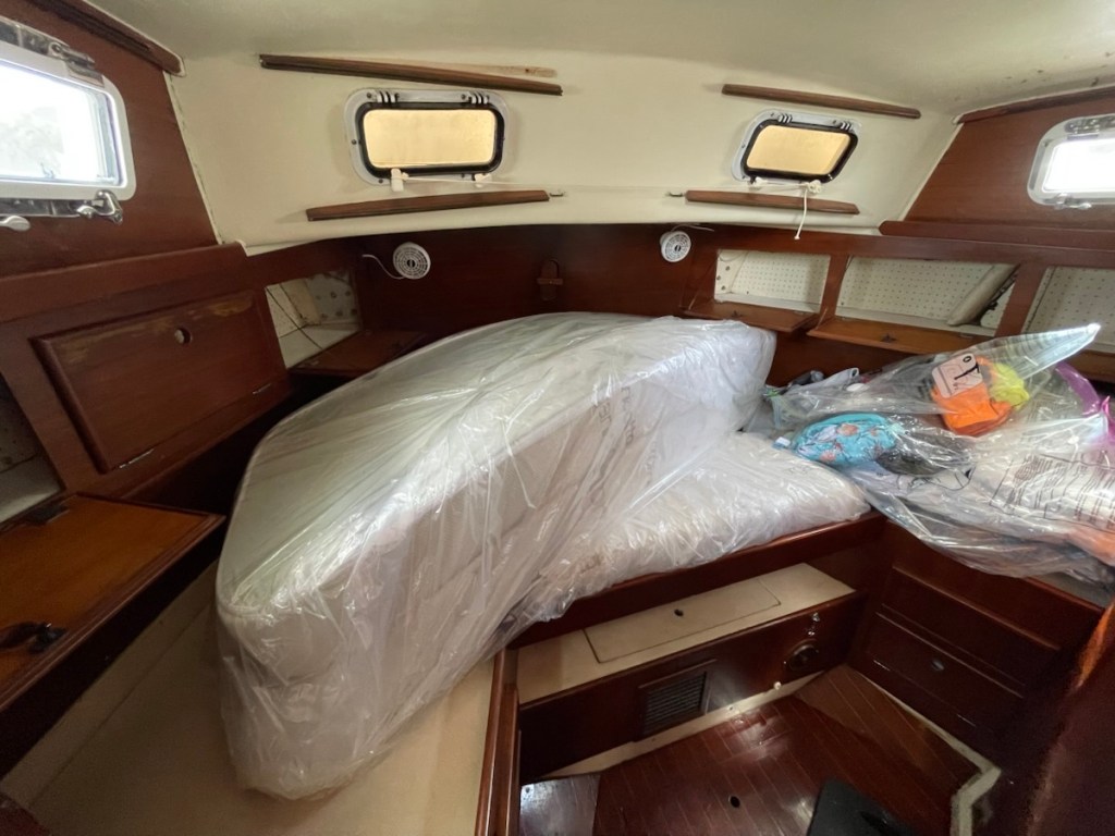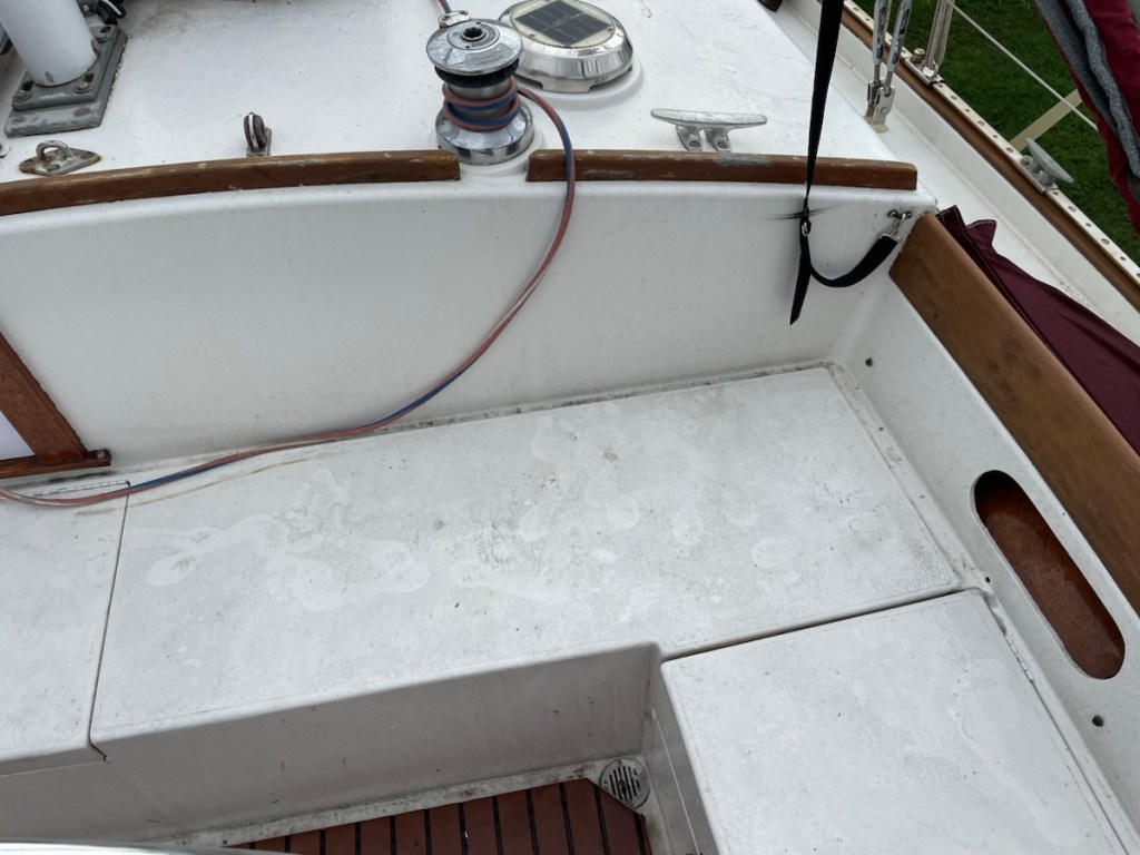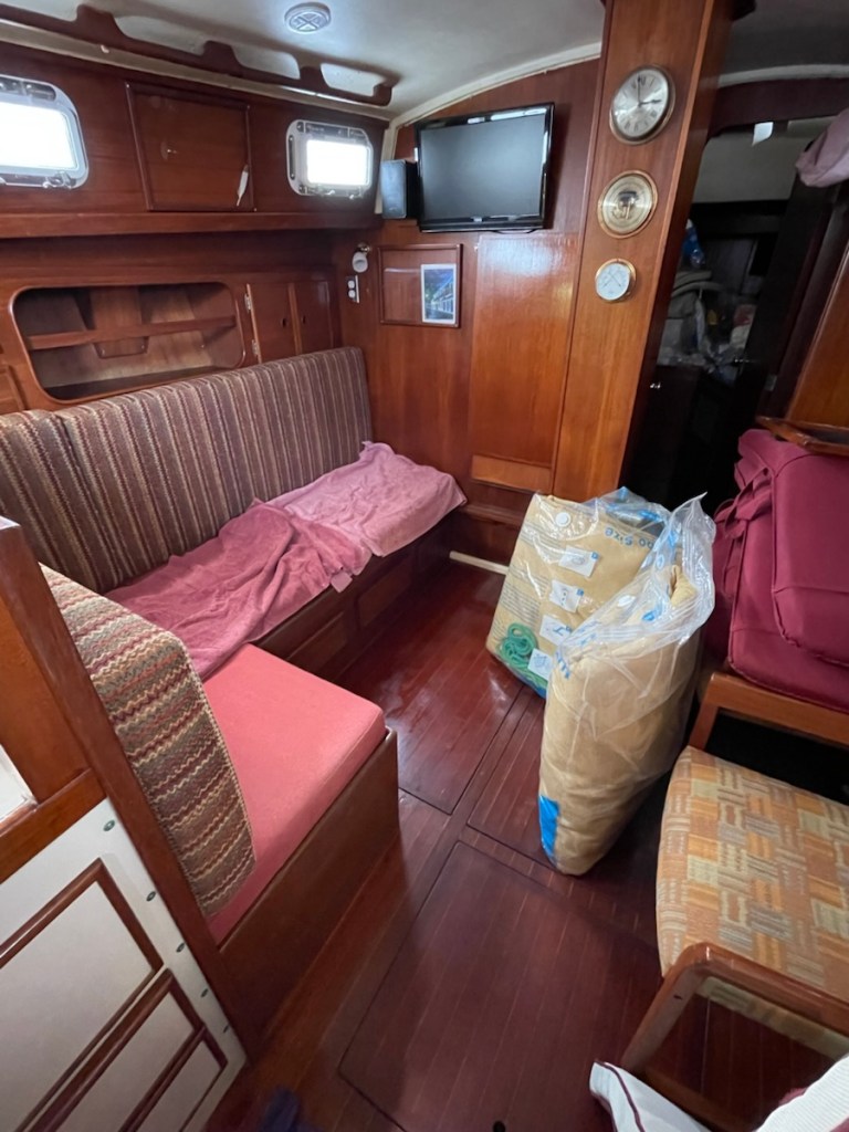 After lunch Mark started his last out of the water job – attaching chain plates for our drogue – it’s like a water parachute that is deployed at the stern if you get into some serious weather. I went to work on the V-berth – emptying it, washing it and setting it up for John. I got halfway through the job and I went back into the main cabin to rest (while the area dried). It felt so cool in the main cabin that I figured the temperature had dropped. Nope! It was 33 degrees in the cabin so it must have been close to 40 in the V-berth! That’s way too not for me!! Even with the heat, I completed all my before launch jobs and Mark is very close to being done with his jobs.